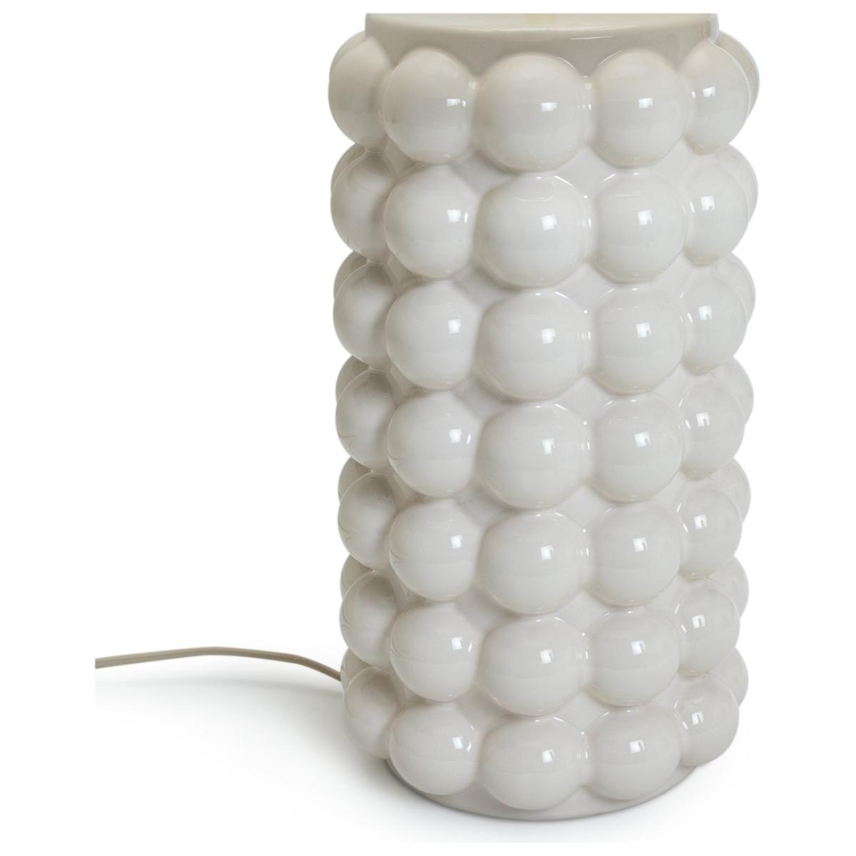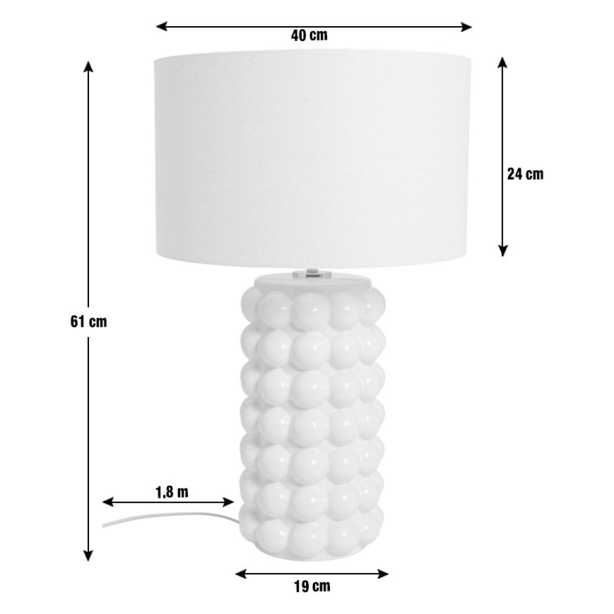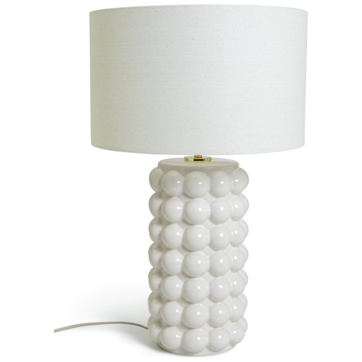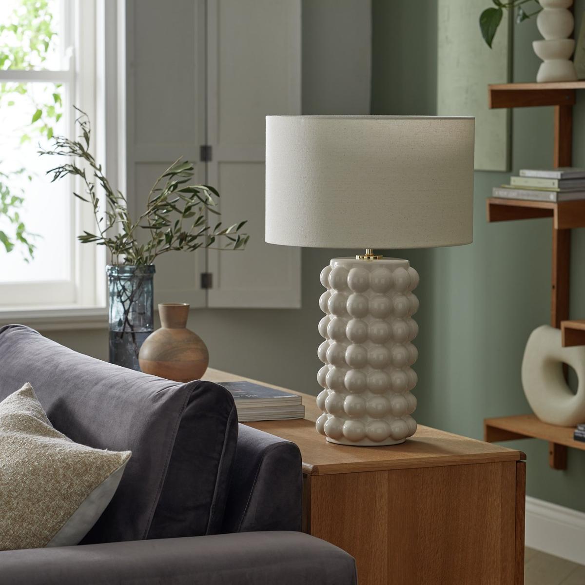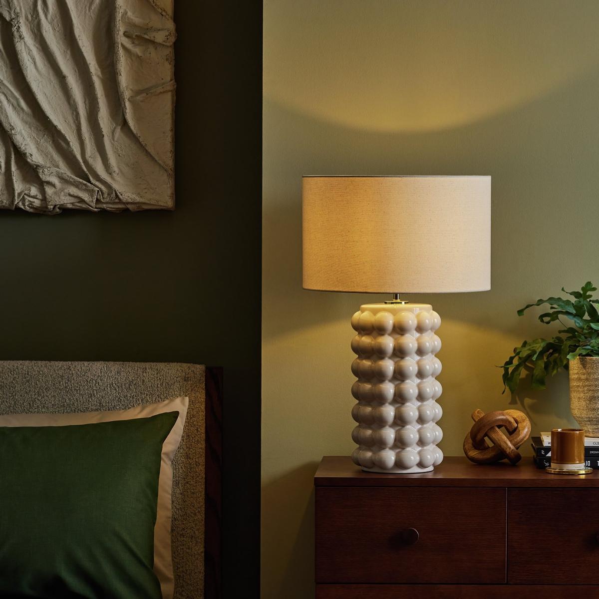 Fashion big bobble ceramic base with a shiny new cream colour, matched with a natural linen shade. Fashion light cream bobble pattern ceramic base complemented with a natural linen fabric shade. Dimensions: Overall size H61, Diameter 40cm. Shade size H24, D40cm. Diameter of base 19cm. Cord length 1.8m. Bulb Information: Bulbs required 1 x classic E27 edison screw LED bulb(s) (not included). Recommended maximum wattage: 15 watts. General Information: Shade colour: natural. Base colour: cream. Shade material: linen. Base material: ceramic. In-line switch. IP rating 20 - not suitable for bathroom use. App needed for use: No. Minimal assembly. Product is mains powered plug in. This lighting product is a class 2 fitting. Verdant. Manufacturer's 1 year guarantee.