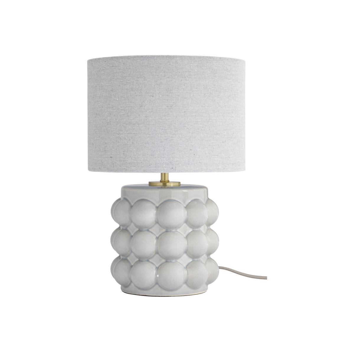 Big, bold, bobbled and beautiful. With a fabulous translucent gloss grey glaze and large linen-look shade. Could our bobble ceramic table lamp be just the accent piece you've been looking for? Because it not only brings an atmospheric and ambient warm light, it's a decorative, eye-catching and sculptural ornament. Dimensions: Overall size H38, Diameter 25.5cm. Shade size H18, D25.5cm. Diameter of base 17.7cm. Cord length 1.8m. Bulb Information: Bulbs required 1 x candle E14 small edison screw LED bulb(s) (not included). Recommended maximum wattage: 10 watts. General Information: Shade colour: grey. Base colour: grey. Shade material: linen. Base material: stoneware. In-line switch. IP rating 20 - not suitable for bathroom use. App needed for use: No. Minimal assembly. Product is mains powered plug in. This lighting product is a class 2 fitting. Manufacturer's 1 year guarantee.