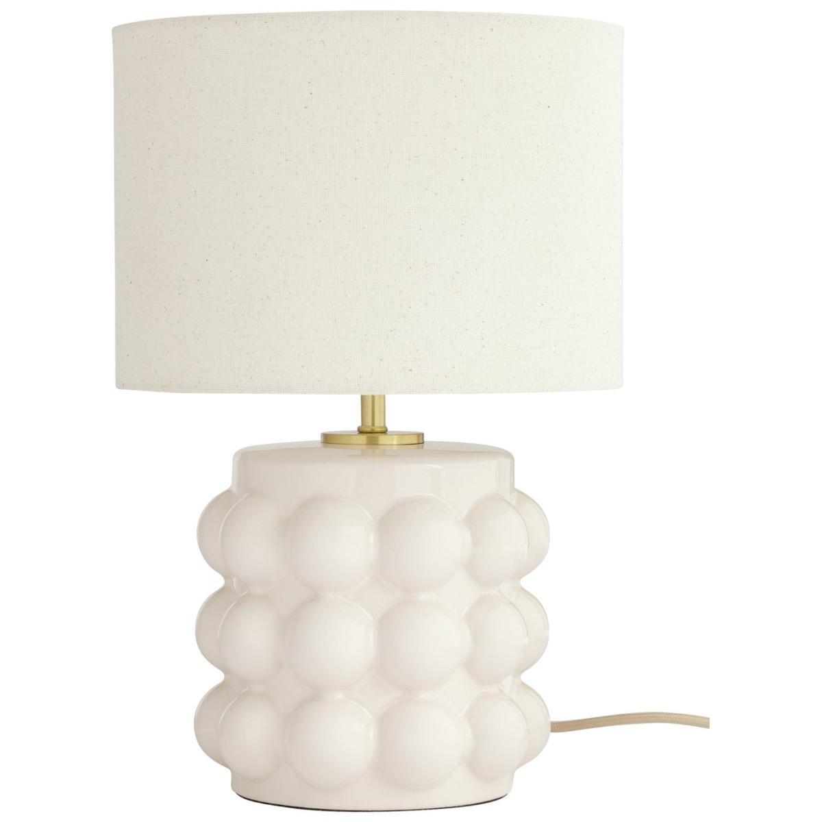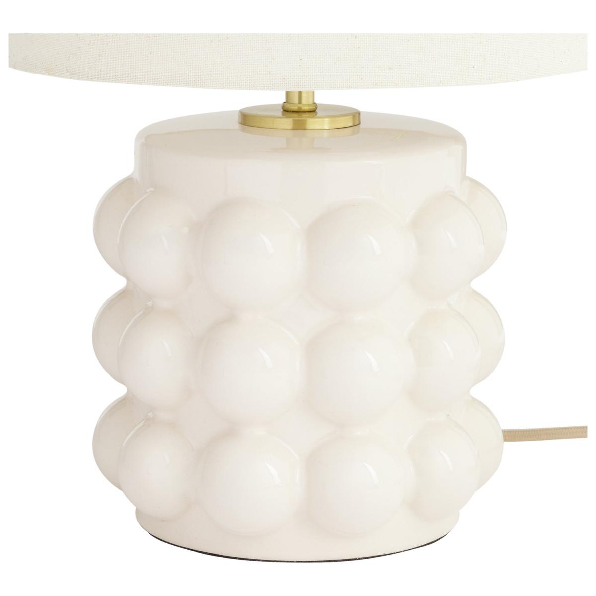 Big, bold, bobbled and beautiful. With a fabulous light gloss cream glaze and large linen-look shade. Could our bobble stoneware table lamp be just the accent piece you've been looking for? Because it not only brings an atmospheric and ambient warm light, it's a decorative, eye-catching and sculptural ornament. Dimensions: Overall size H38, Diameter 25.5cm. Shade size H18, D25.5cm. Diameter of base 17.7cm. Cord length 1.8m. Bulb Information: Bulbs required 1 x candle E14 small edison screw LED bulb(s) (not included). Recommended maximum wattage: 10 watts. General Information: Shade colour: cream. Base colour: cream. Shade material: linen. Base material: stoneware. In-line switch. IP rating 20 - not suitable for bathroom use. App needed for use: No. Minimal assembly. Product is mains powered plug in. This lighting product is a class 2 fitting. Manufacturer's 1 year guarantee.