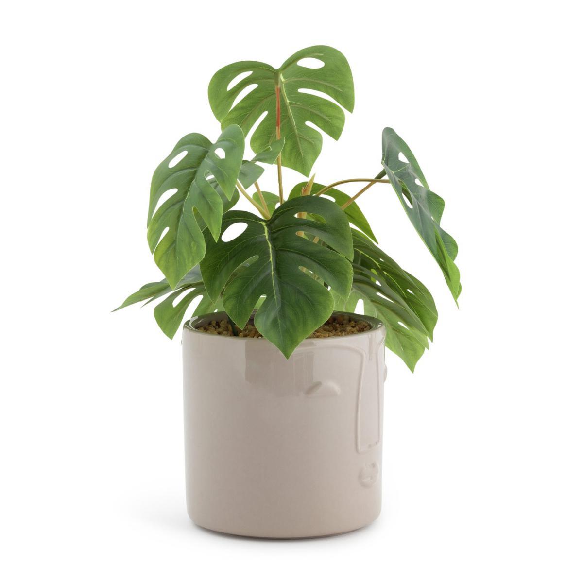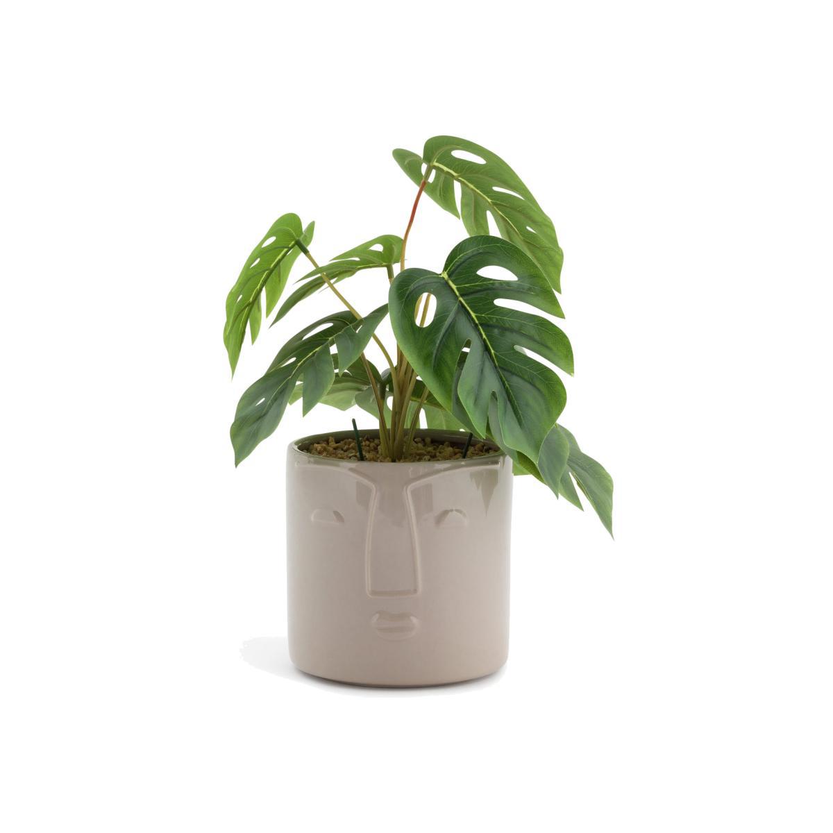 Face it. Based on a famous 70's design this planter is Boho chic all over. It features a warmly smiling face across the front of the planter. Inside is a large faux green plant with oversized leaves, perfect for busy, stylish home makers who simply don't have time to water. Size H33, W14.5, D14.5cm. Diameter 14.5cm.