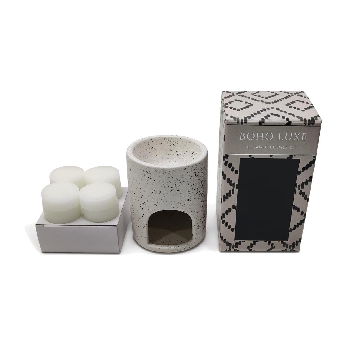 Relax and unwind. Our scented wax burner will fill your home with a subtle, refreshing fragrance. Crafted in white speckled ceramic, this natural candle holder brings a cosy glow to your bathroom, bedroom or coffee table. Simply pop one of the 8 wax melts on top. Then light a tea light in the little cave below. Lie back in the tub, or on the sofa, as the gentle aroma floats on by. Breathe deeply, let go. Birthday or special occasion? Comes in a pretty patterned box, great for gifting. Boho scent. Includes burner, candles. Gift boxed. Size H10,. Diameter 8cm.