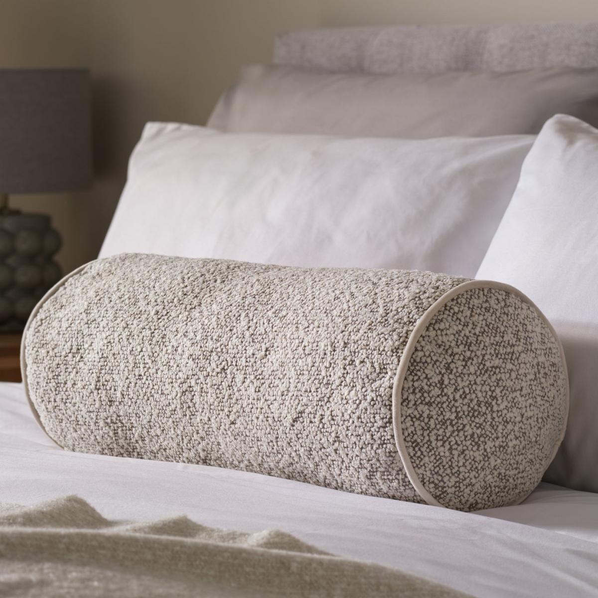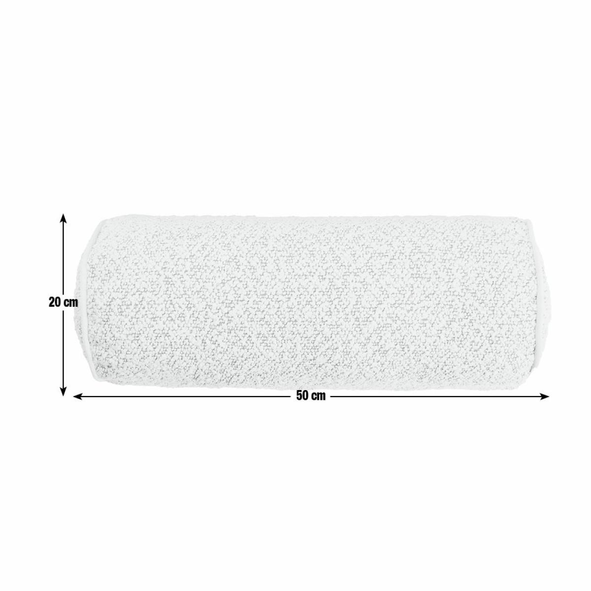 Comfort and style rolled into one. This ivory bolster cushion features tactile boucle with neat piping for a finishing touch. Offers extra support for movie nights on the sofa and is a quick and easy upgrade for your bedroom too. Think plush, plump, and perfect. Fully sewn and stuffed cushion. Cover 100% Polyester. Filling 100% Polyester,. Size L50, W20cm. Diameter: 20cm. This cover is sponge clean only.