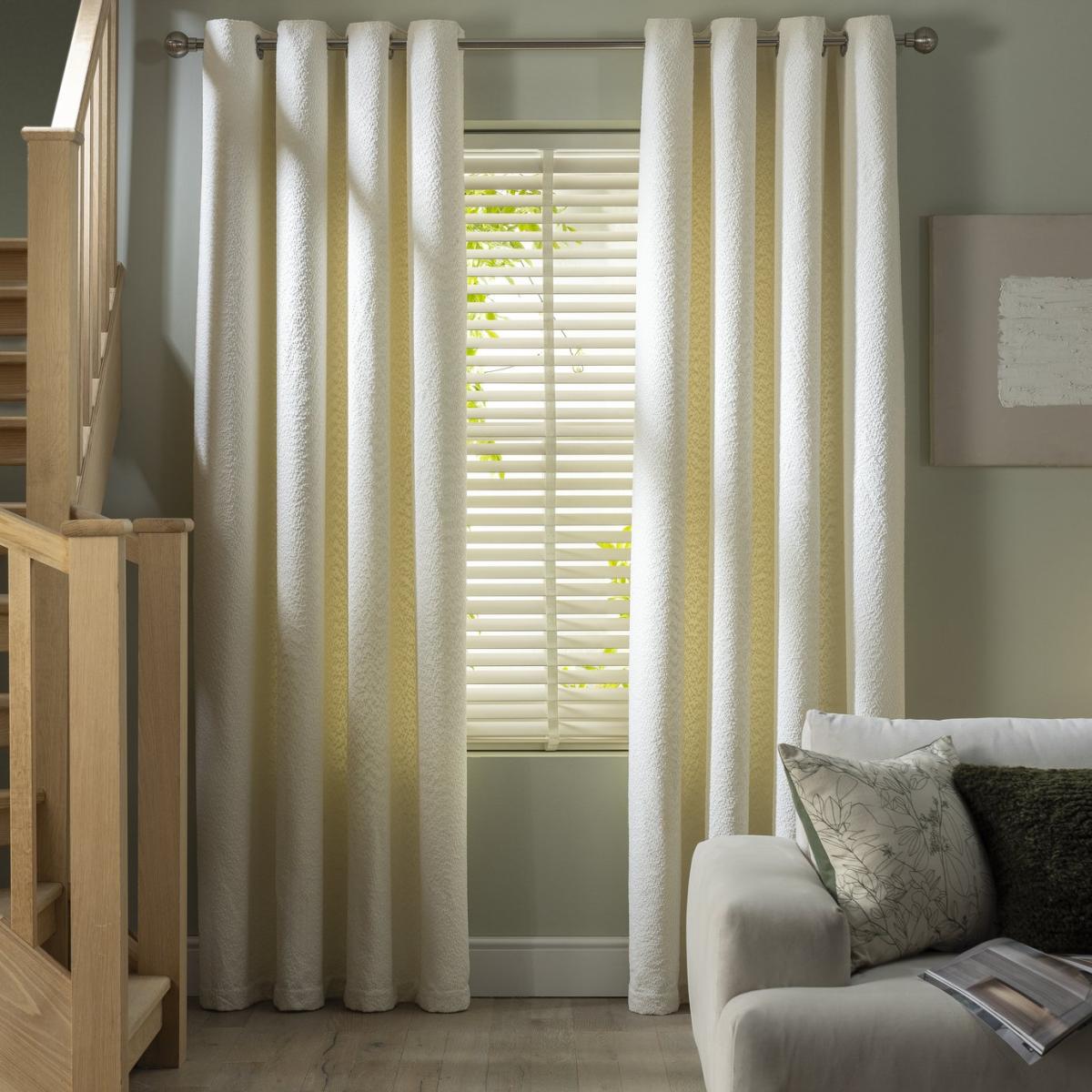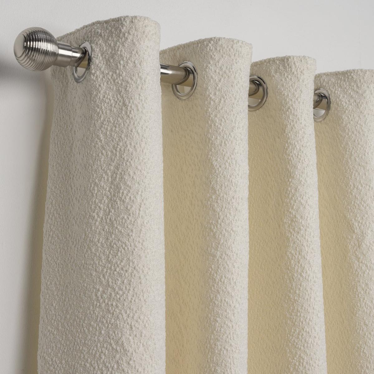 Beautiful boucle. Slide our textured blackout curtains straight onto your curtain pole for an instant room refresh. The woven boucle fabric, backed by a thick blackout lining, falls in soft wide folds from the stainless-steel eyelet header. A curtain for all seasons. Draw them to keep out summer light. Open and closed they're a smart pair. Cream. Silver stainless iron Eyelets. Features Blackout. Made from 100% polyester. Lined. Lining made from 100% polyester. Dimensions Size 168cm (66 inches) wide by 183cm (72 inches) drop. Width refers to one curtain panel before hanging. Eyelet diameter: 4cm.