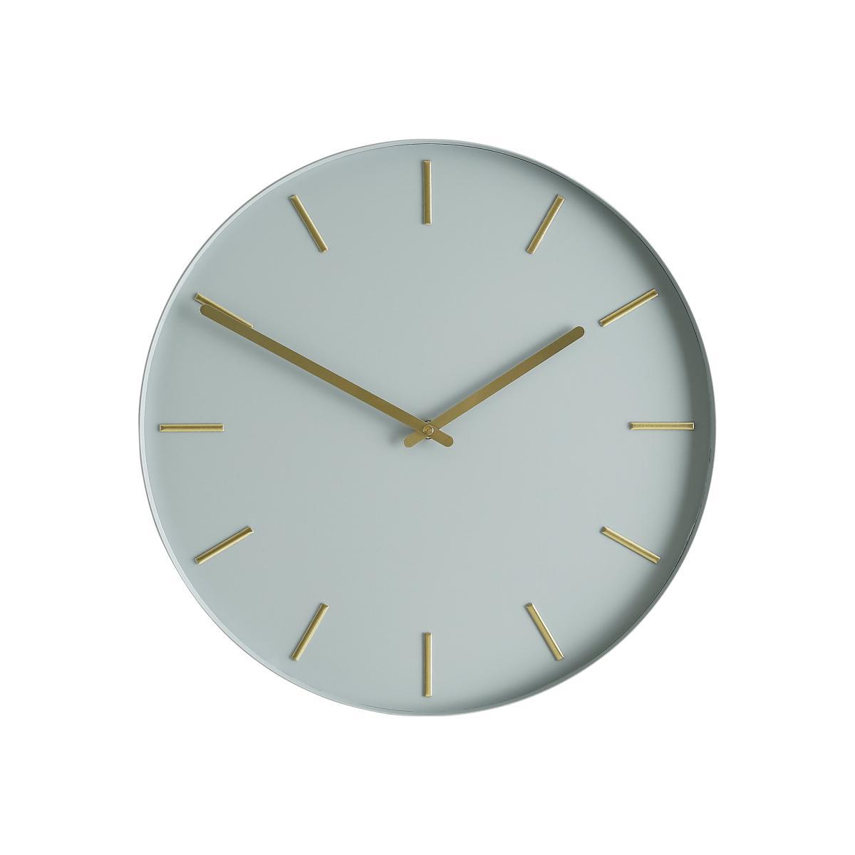 Minimalist yet luxurious, the Bourke pale grey metal wall clock combines clean lines and a matt finish with hour markers and hands in gleaming gold. The large clock's case has a feature lipped edge and the dial is exposed.