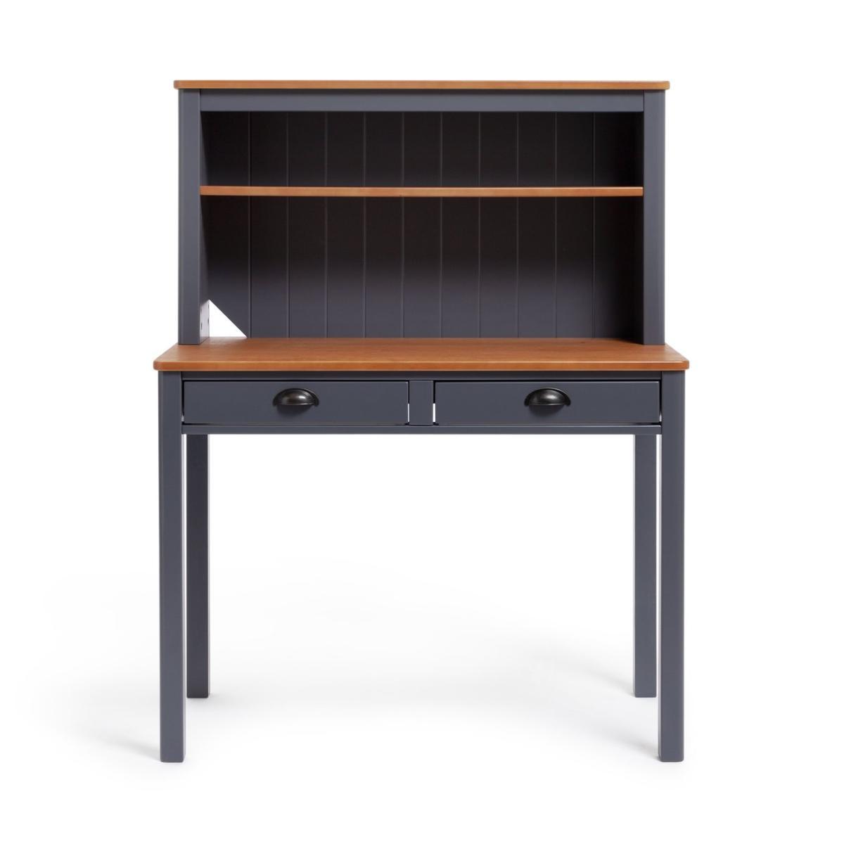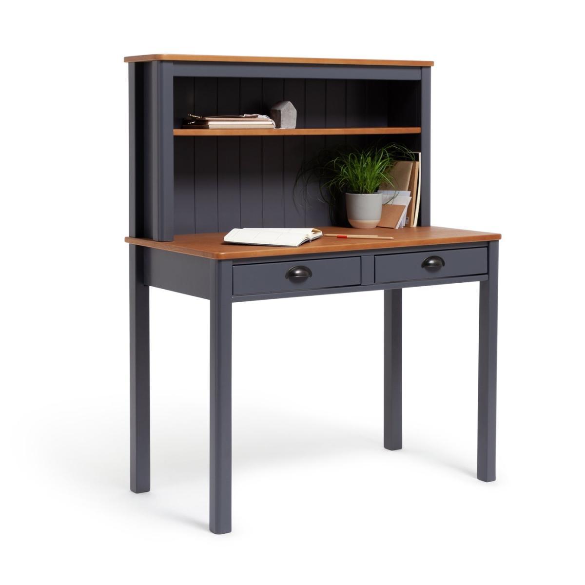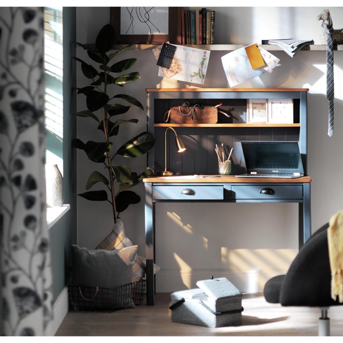 Get homely with your home office. Our Bournemouth desk has a comfy country feel. Made from solid pine it's traditionally elegant. The dark grey finish contrasts handsomely with the light polished wood. Two roomy draws smoothly open on wooden runners. And we're loving the classic half-moon shaped metal handles. Need to store tall books or files? No problem. The adjustable shelf is very obliging. Keep it for yourself or let the kids use it for their homework. It's family friendly and perfectly accommodating.
