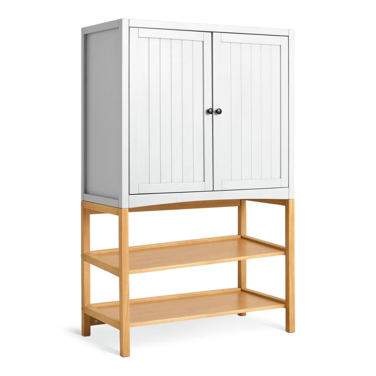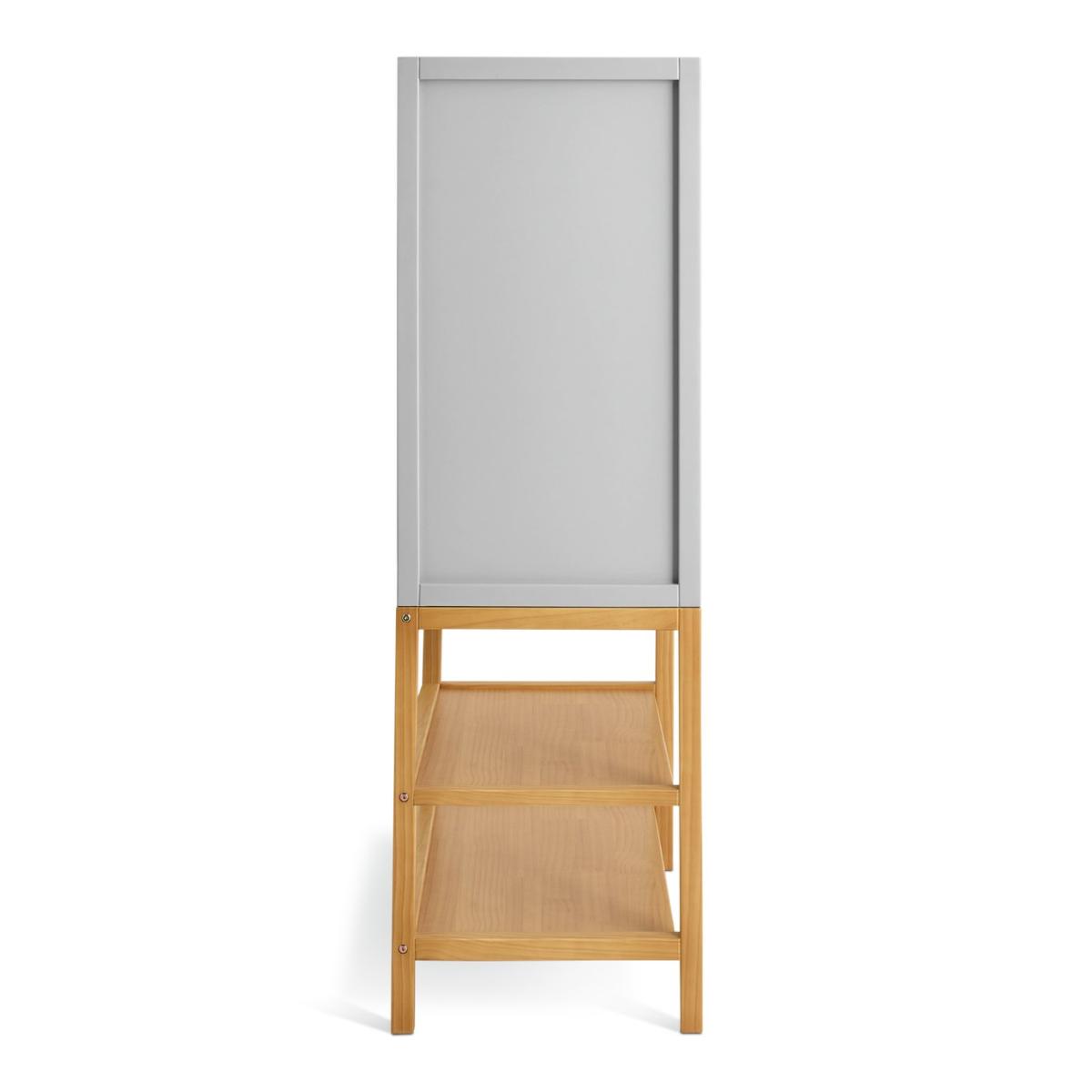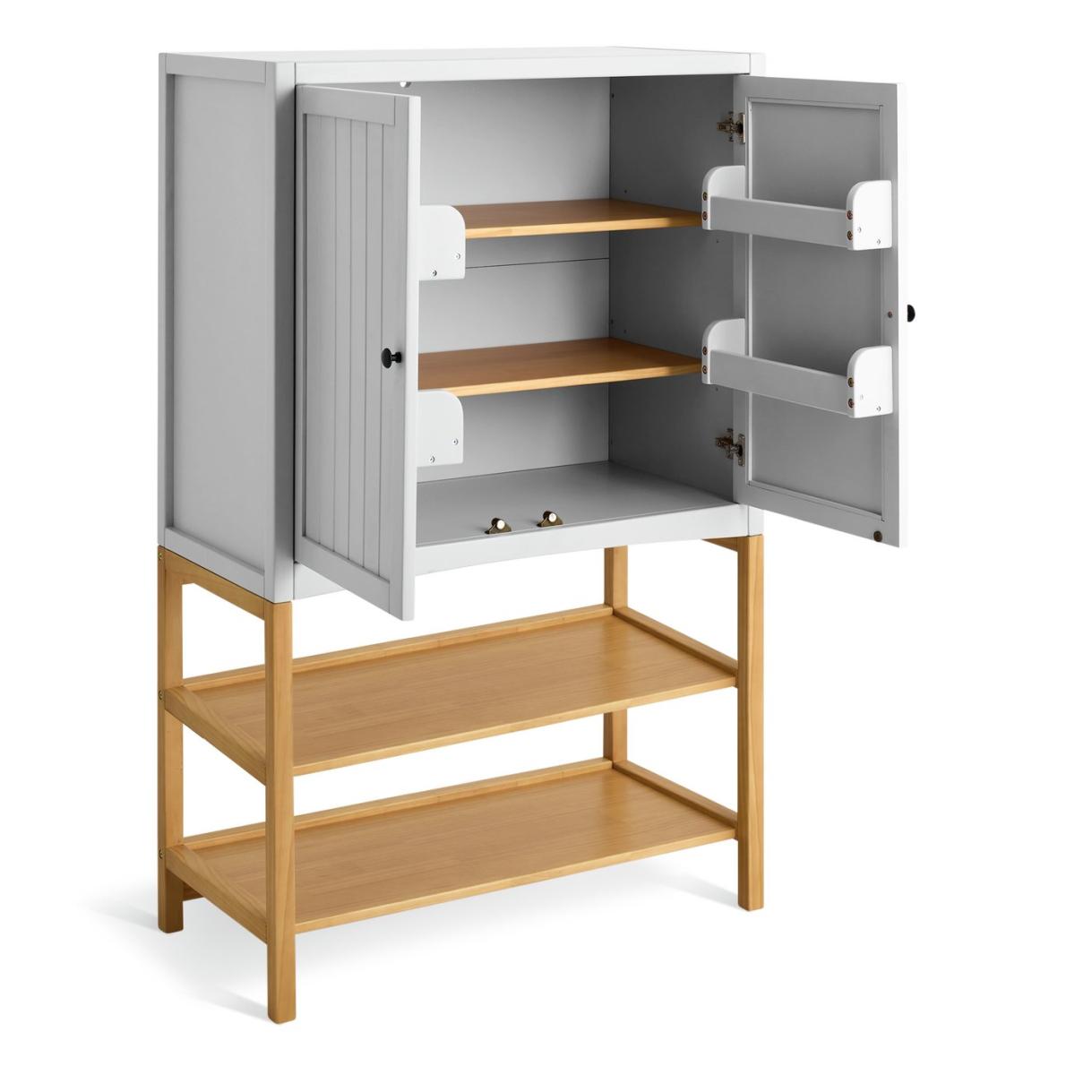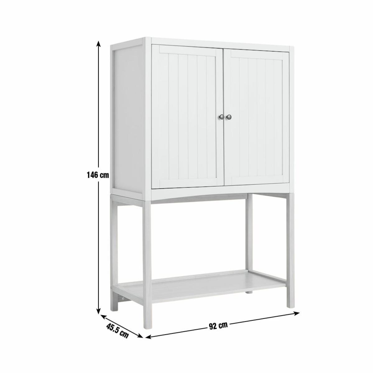 Our Bournemouth cabinet is brimming with rustic country charm. Painted in a calming grey colour palette, with contrasting warm pine it's a naturally handsome storage piece. Inside the double cupboard are 4 shelves plus 4 handy door racks. Below is an open display area. So simple. So stylish. So space saving. Part of the Bournemouth collection. Made from MDF and pine with a painted finish. 2 fixed shelves and 2 adjustable shelves. Metal handles. Self-assembly - 2 people recommended. If this product is over 60cm high it must be securely attached to the wall to prevent overturning (fixings included). Dimensions: Size H146, W92, D45.5cm. Weight 52.5kg. Internal shelf space: H 26, W 85, D 39cm. Adjustable shelf H 18 - 28cm. Wall fixing recommended. Shelves range from 85cm wide (narrowest) to85 cm wide (widest)Recommended maximum load per shelf: 80kg. Package dimensions: Package 1 dimensions: H34.5, W95, D55cm. Package 1 weight: 34.74kg. Package 2 dimensions: H17, W94, D47cm. Package 2 weight: 24.13kg. General Information: By choosing FSC certified products, you are supporting responsible management of the world's forests. Manufacturer's 1 year guarantee.