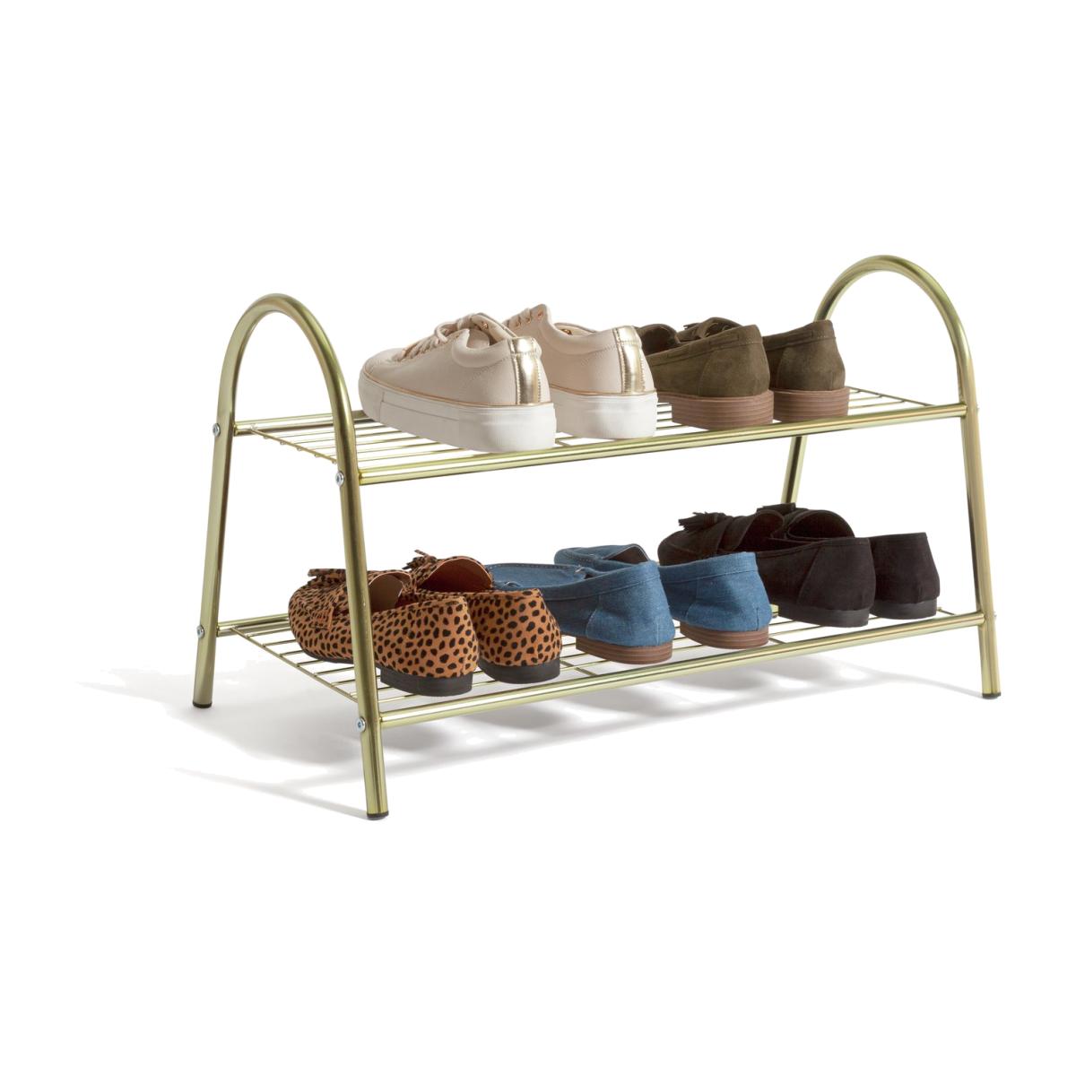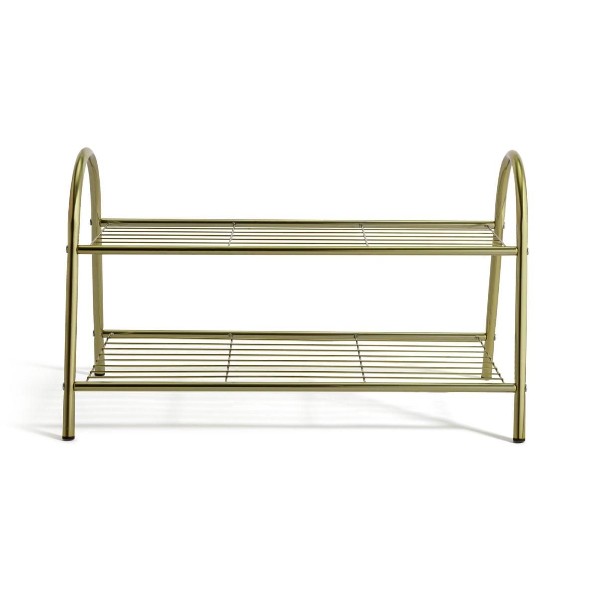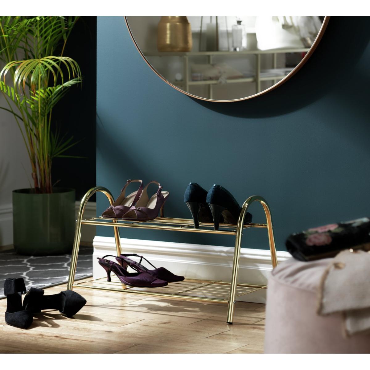 Seriously stylish storage. The Habitat Boutique 2-tier shoe rack is streamlined storage at its best. With an elegantly rounded design and 2 fixed wire shelves, this sleek gold beauty looks great wherever it's placed. Whether tucked neatly in a cupboard or by your front door, this handy structure keeps everything neat and tidy. Part of the Boutique collection. Made from steel with a metal finish. Stores an average of 6 pairs of shoes. Up to maximum shoe size 11. 2 fixed shelves. Size H36.4, W61.2, D33.7cm. Weight 2.25kg. Self-assembly. Package Dimensions: Package 1 dimensions: H58.5, W34.5, D5cm. Package 1 weight: 1.65kg. General information: We are excited to be welcoming some of our favourite HOME products into the Habitat range. Your product may arrive in Habitat or HOME packaging.