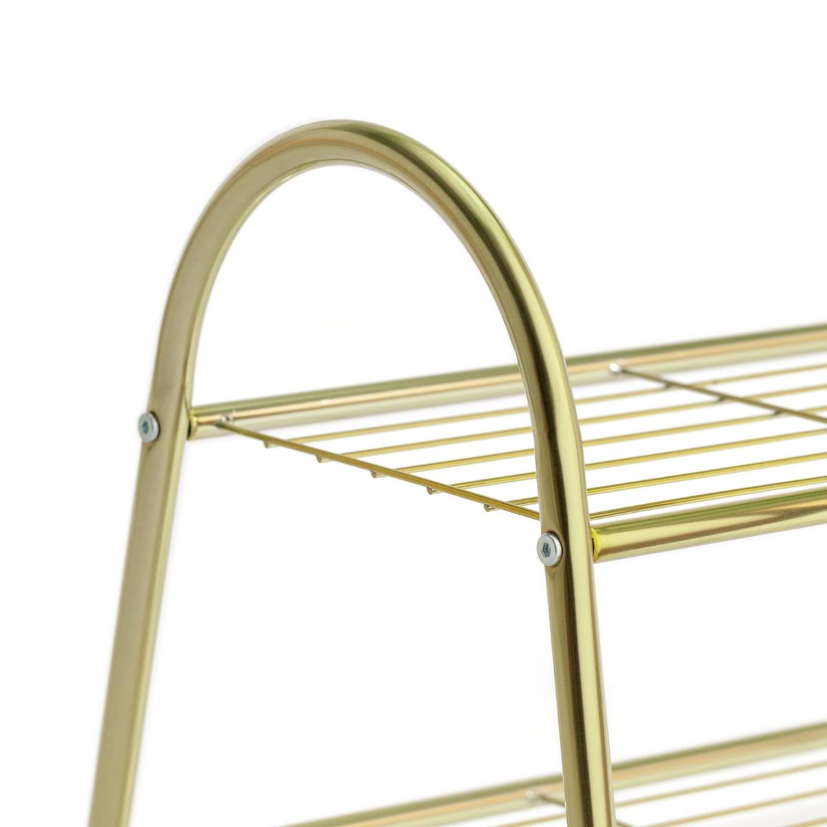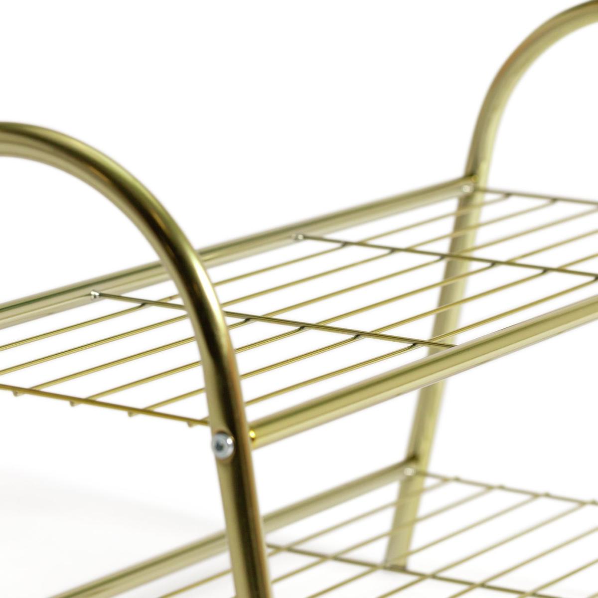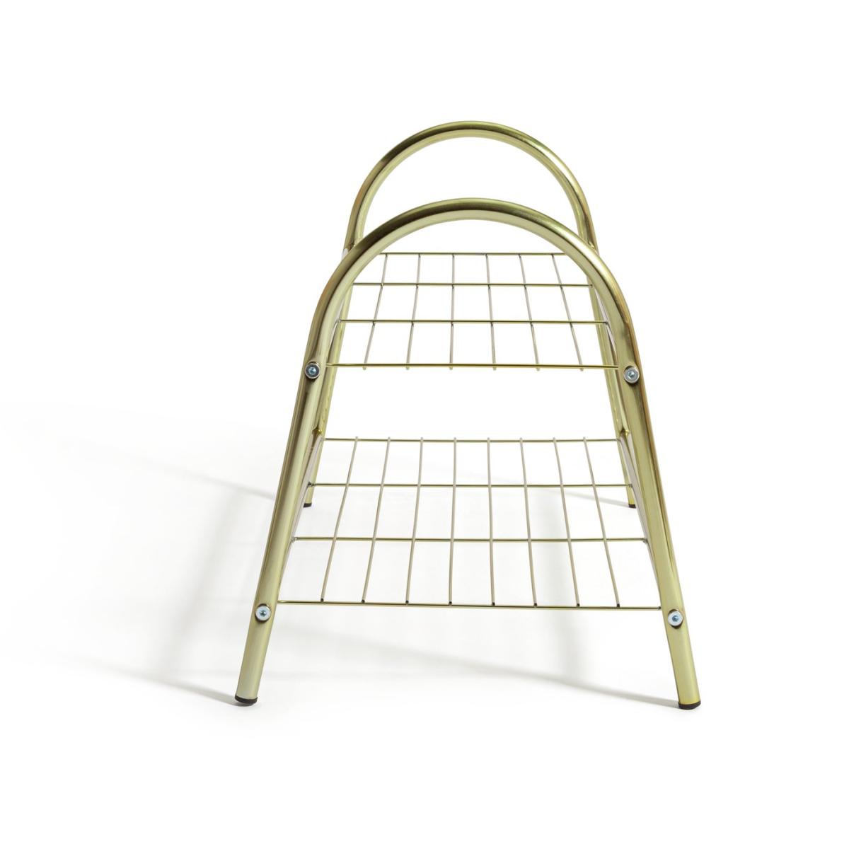 Seriously stylish storage. The Habitat Boutique 2-tier shoe rack is streamlined storage at its best. With an elegantly rounded design and 2 fixed wire shelves, this sleek gold beauty looks great wherever it's placed. Whether tucked neatly in a cupboard or by your front door, this handy structure keeps everything neat and tidy. Part of the Boutique collection. Made from steel with a metal finish. Stores an average of 6 pairs of shoes. Up to maximum shoe size 11. 2 fixed shelves. Size H36.4, W61.2, D33.7cm. Weight 2.25kg. Self-assembly. Package Dimensions: Package 1 dimensions: H58.5, W34.5, D5cm. Package 1 weight: 1.65kg. General information: We are excited to be welcoming some of our favourite HOME products into the Habitat range. Your product may arrive in Habitat or HOME packaging.