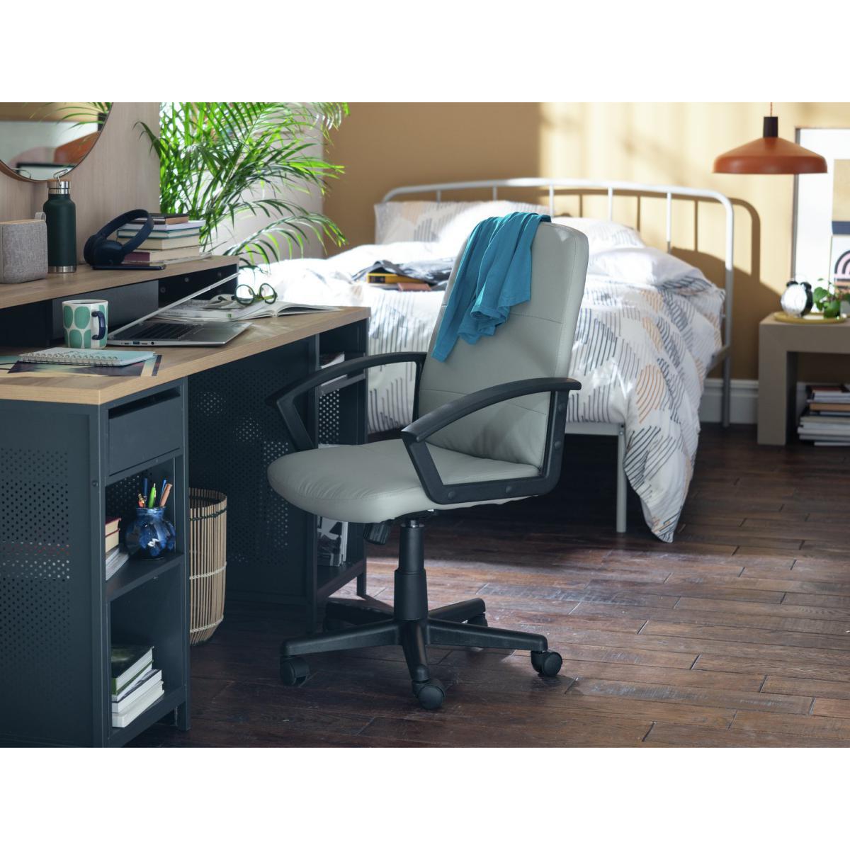 I love this faux leather manager's chair for its sleek, practical design and versatile colour. The grey adds a sophisticated touch that works well in modern or minimalist interiors, especially in home offices or contemporary workspaces. Its neutral tone makes it easy to pair with a range of colour schemes, from bold accents to subdued palettes. For styling tips, consider pairing it with a glass or metal desk for a clean look, or soften the overall feel with a textured rug and some greenery nearby. The faux leather finish is not only low maintenance but also adds a sense of polished professionalism, making it a smart choice for productive spaces that still want a touch of style.