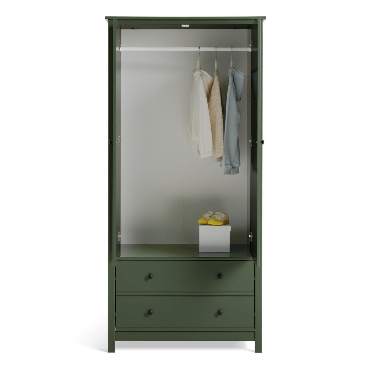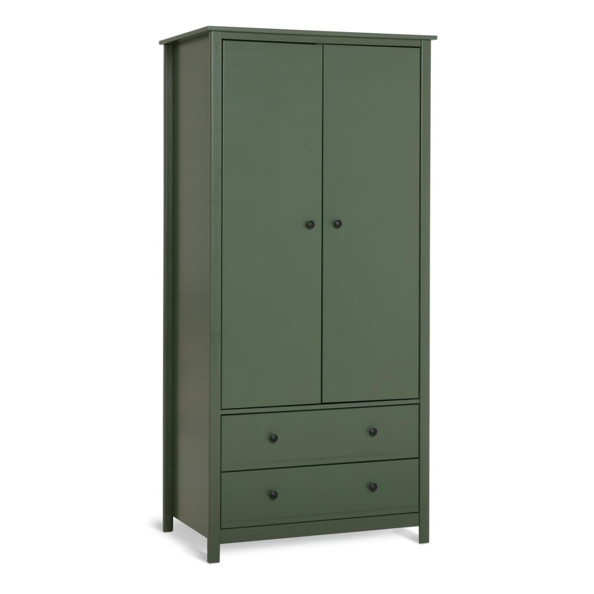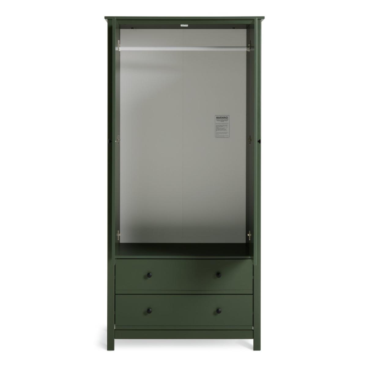 Big and little fashionistas will love Brooklyn. A spacious 2-door green painted wardrobe, perfect for kids and adults alike. Made from solid pine and MDF it's built to withstand life's knocks and bumps. With round handles and 2 easy glide drawers. Brooklyn's here for the long haul. Part of the Brooklyn collection. Made of MDF and solid pine. Metal handles. Additional handles not included. 2 doors. 2 drawers with metal runners. 1 fixed hanging rail. Hanging rail holds up to 15kg. Packed flat - 2 people recommended (includes wall fixings). If this product is over 60cm high it must be securely attached to the wall to prevent overturning. Dimensions: Size H180.1, W86, D55cm. Internal hanging space H119, W74.8, D52cm. Internal drawer H15.3, W71.6, D33.6cm. Handle size: L2.7, W2.7cm. Weight 55kg. Package Dimensions: Package 1 dimensions: H7.2, W52.5, D184.3cm. Package 1 weight: 34.6kg. Package 2 dimensions: H7.5, W59.4, D91.8cm. Package 2 weight: 20.6kg. General information: FSC certified meaning the materials used for this product are responsibly sourced. Manufacturer's 1 year guarantee.