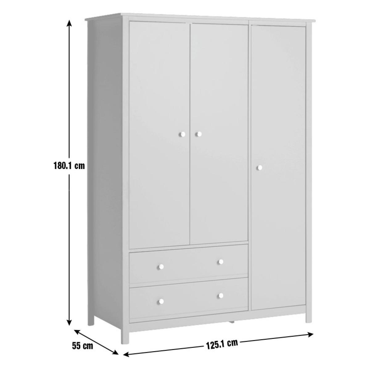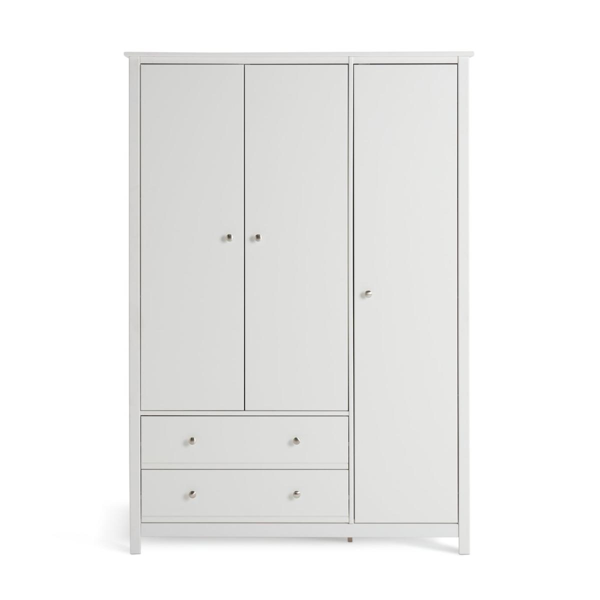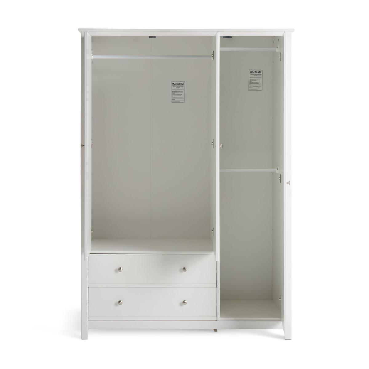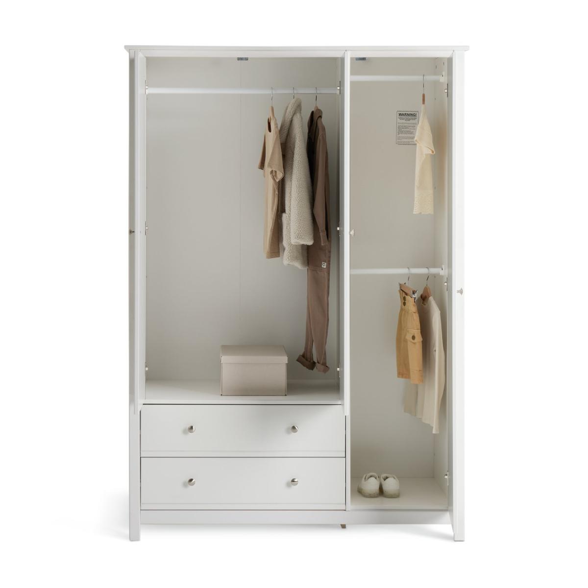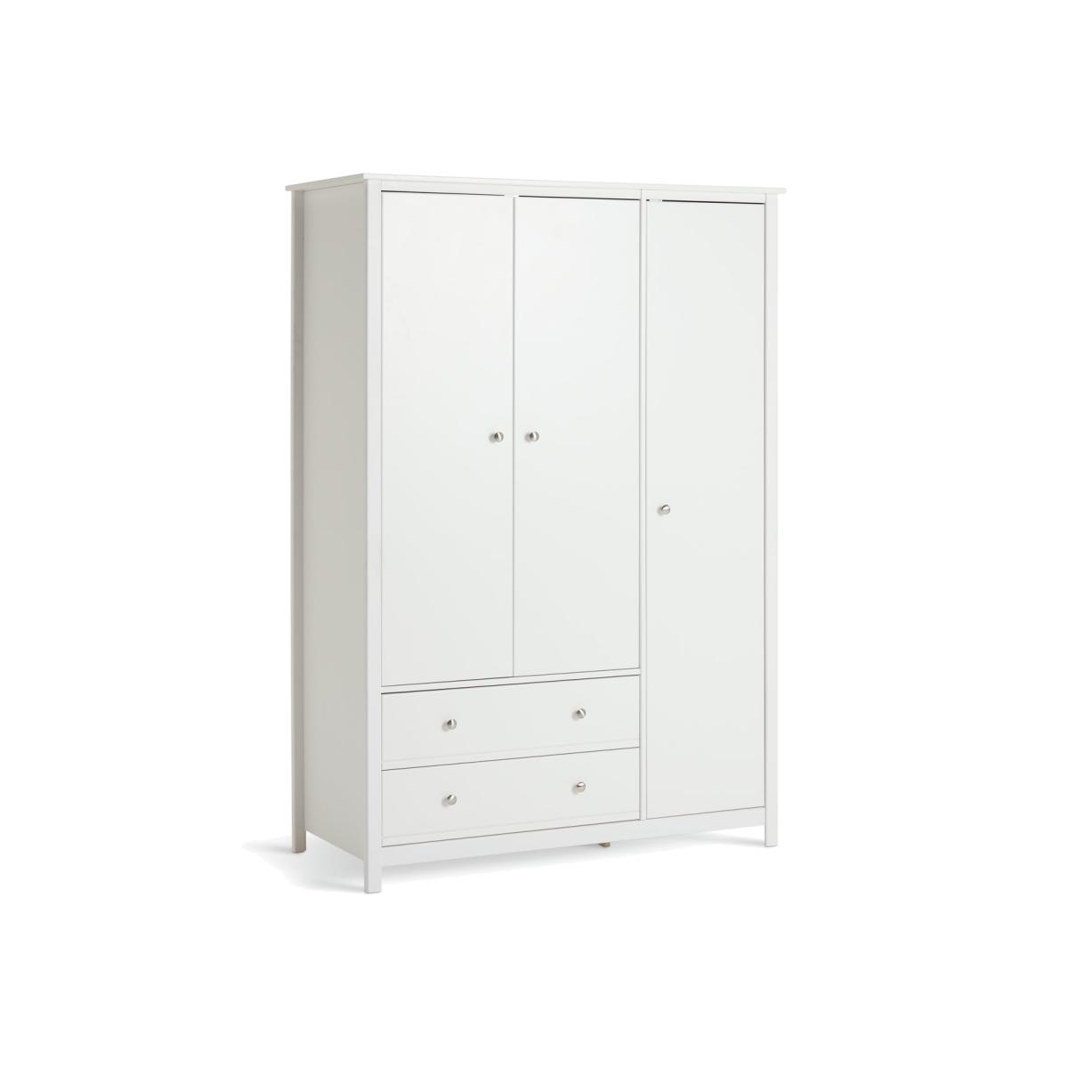Cool and classic, the Brooklyn collection is for both stylish kids and discerning adults. This spacious 3-door white wardrobe has 3 hanging rails and 2 easy glide drawers. Child friendly, smooth metal handles add the finishing touch. Kitting out a room in full? Check out the rest of our Brooklyn collection to complete the look. Plus, each piece of Brooklyn furniture is tested to the latest safety regulations and complies with British and European safety standards. Good to know. Part of the Brooklyn collection. Made of MDF and solid pine. Metal handles. Additional handles not included. 3 doors. 2 drawers with metal runners. 3 fixed hanging rails. Hanging rail holds up to 15kg. Packed flat - 2 people recommended (includes wall fixings). If this product is over 60cm high it must be securely attached to the wall to prevent overturning. Dimensions: Size H180.1, W125.1, D55cm. Internal hanging space H119, W74.8, D52cm. Internal drawer H15.3, W71.6, D33.6cm. Handle size: L2.7, W2.7cm. Weight 84kg. Package Dimensions: Package 1 dimensions: H7.4, W56.4, D130.9cm. Package 1 weight: 27.3kg. Package 2 dimensions: H6.9, W52.5, D178.3cm. Package 2 weight: 30.7kg. Package 3 dimensions: H5.2, W54.5, D184.3cm. Package 3 weight: 26kg. General information: FSC certified meaning the materials used for this product are responsibly sourced.