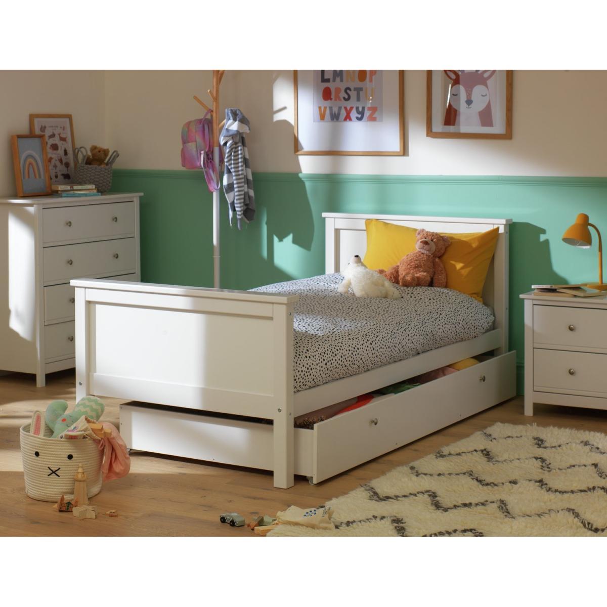 The Habitat Brooklyn bed with drawer offers a clean, versatile look that works well in a variety of children's bedrooms. I love its practical design, especially the under-bed storage which helps keep the room tidy without taking up extra space. Its simple white finish makes it easy to coordinate with both colourful and neutral decor styles, making it suitable from nurseries to pre-teens’ rooms. For styling, consider adding soft, textured bedding and playful accessories like colourful cushions or a fun bedspread to make the space inviting. This bed balances practicality with a classic aesthetic, making it a solid choice for creating a functional yet stylish child's bedroom.