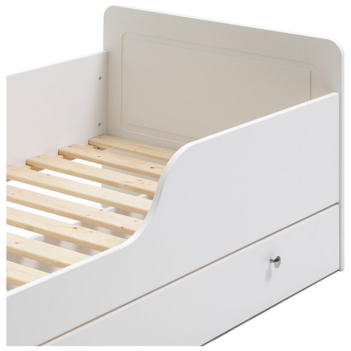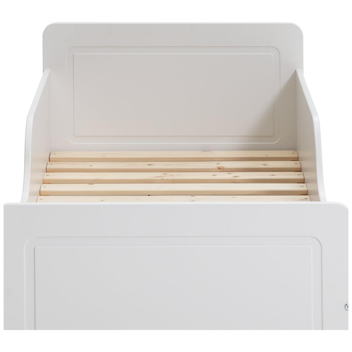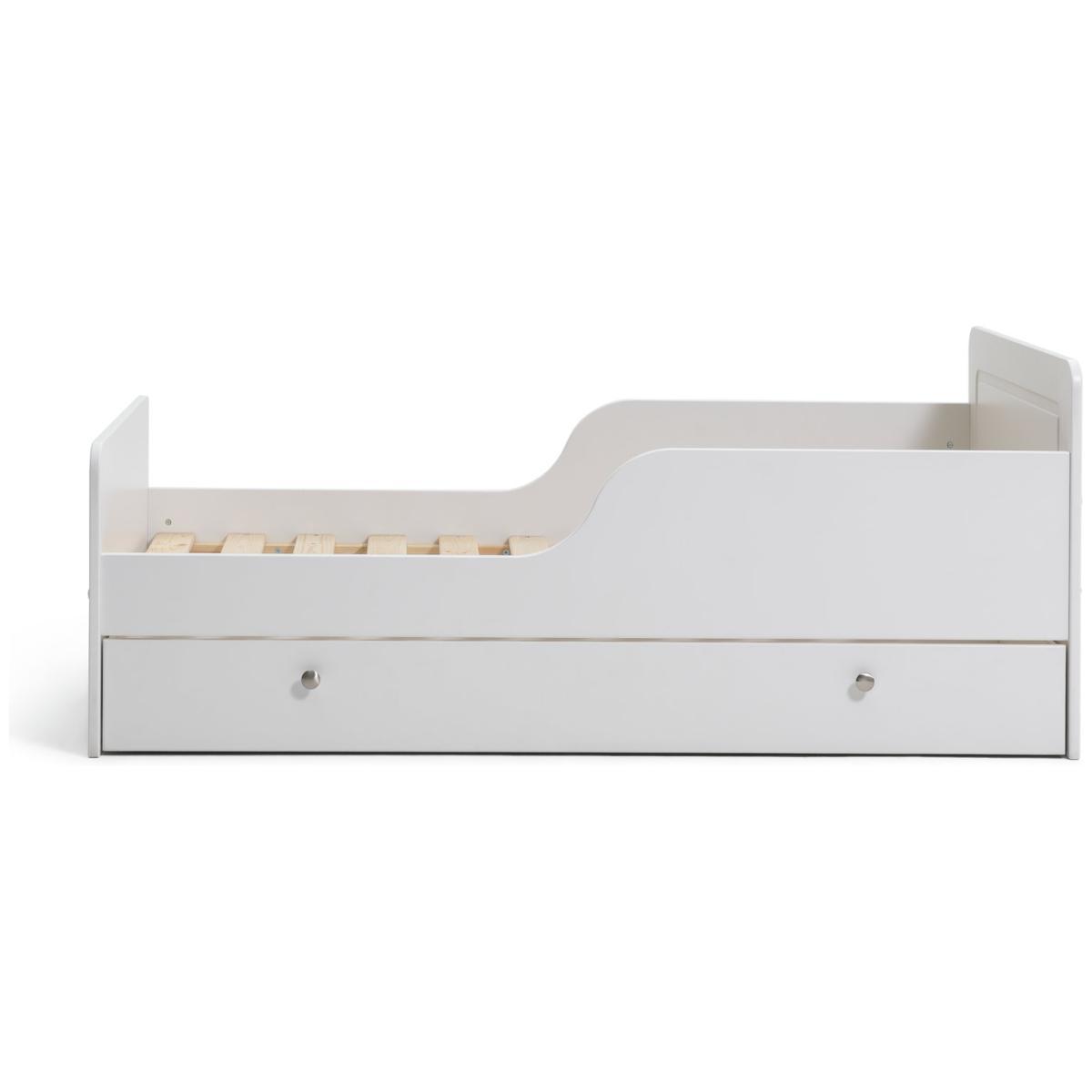 Snooze safely, store tidily. Our toddler bed frame with built-in storage is the best of both worlds. Smooth curved side panels protect your youngster as they sleep. And you have a handy space for clothes or toys. The built-in drawer has plenty of room for little outfits, or to put things away after a day of play. In white wood, it's fresh, modern and looks good with bold or neutral decor. Sweet dreams, sleepyhead.