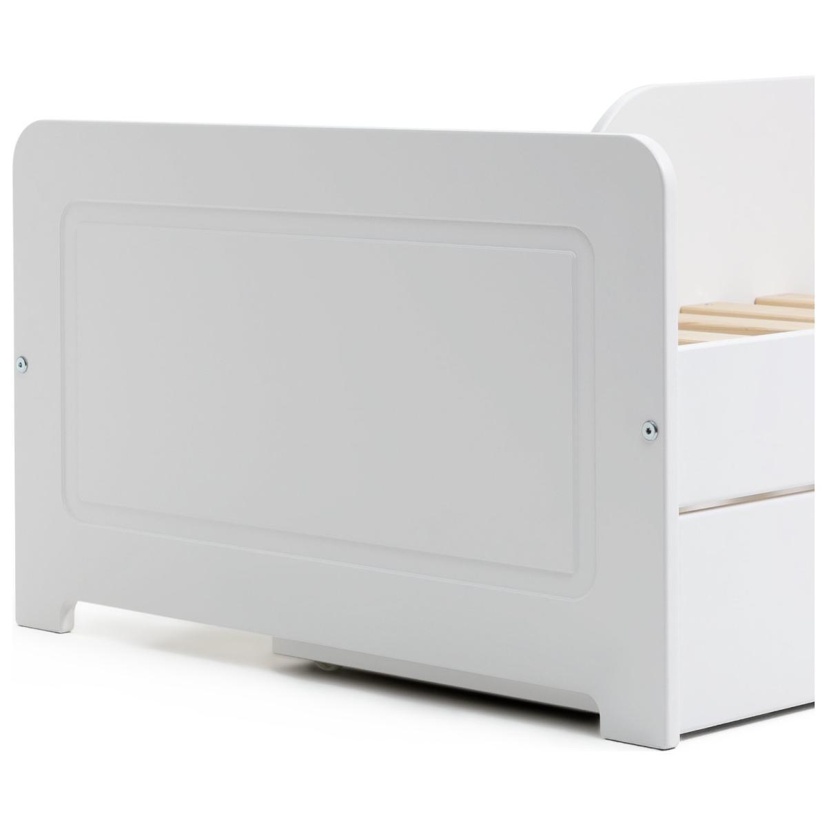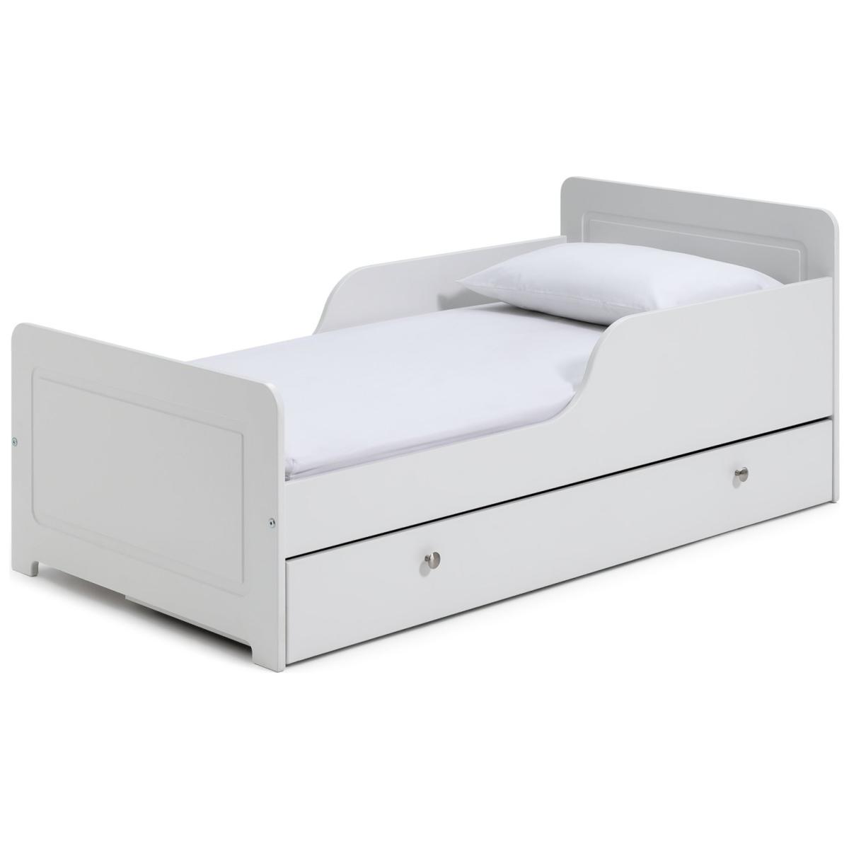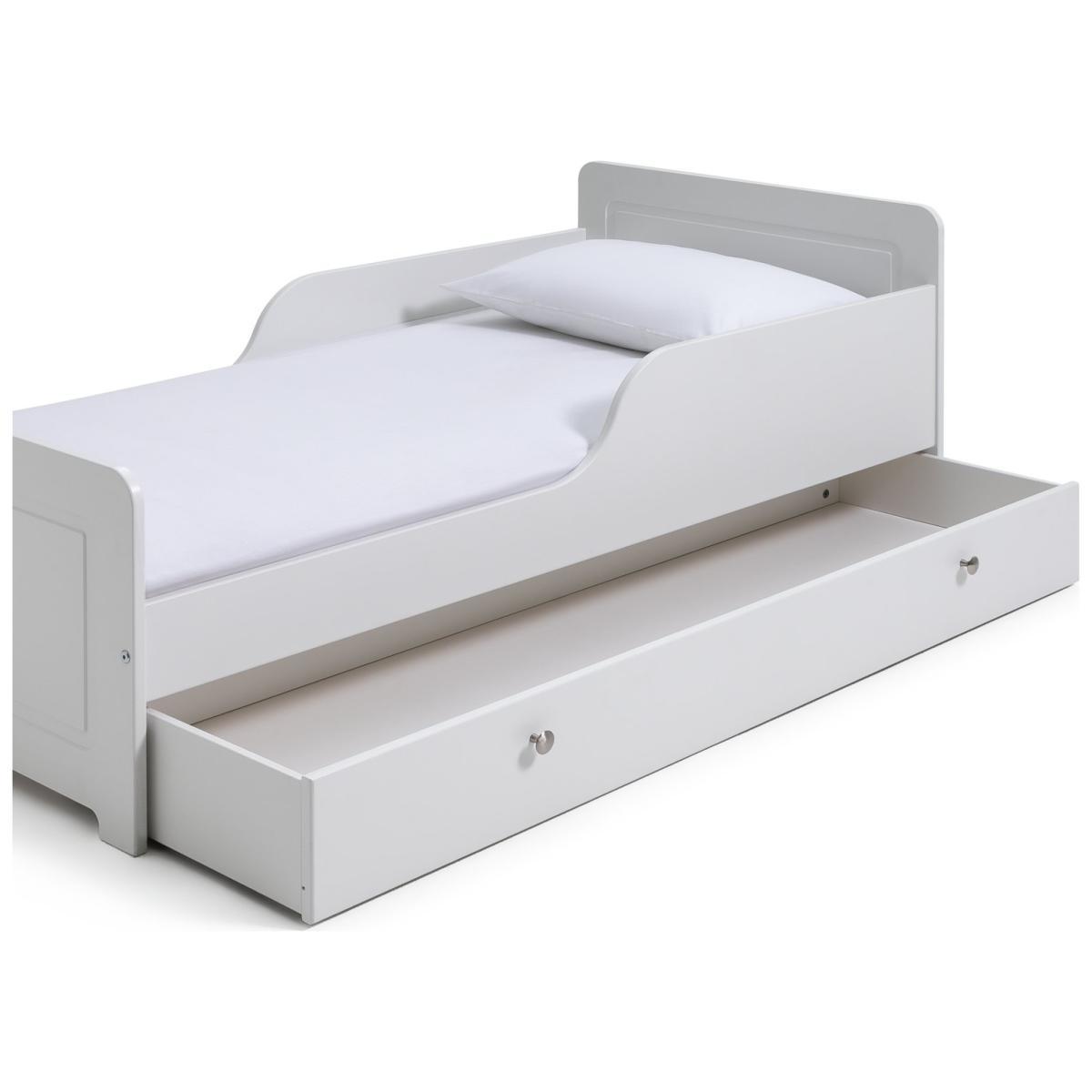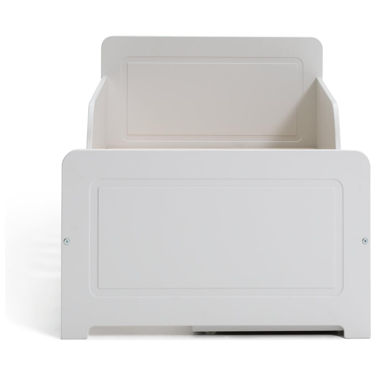 Snooze safely, store tidily. Our toddler bed frame with built-in storage is the best of both worlds. Smooth curved side panels protect your youngster as they sleep. And you have a handy space for clothes or toys. The built-in drawer has plenty of room for little outfits, or to put things away after a day of play. In white wood, it's fresh, modern and looks good with bold or neutral decor. Sweet dreams, sleepyhead.