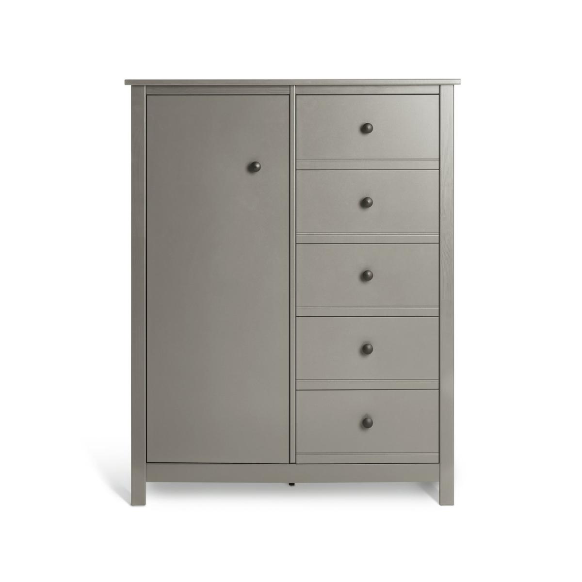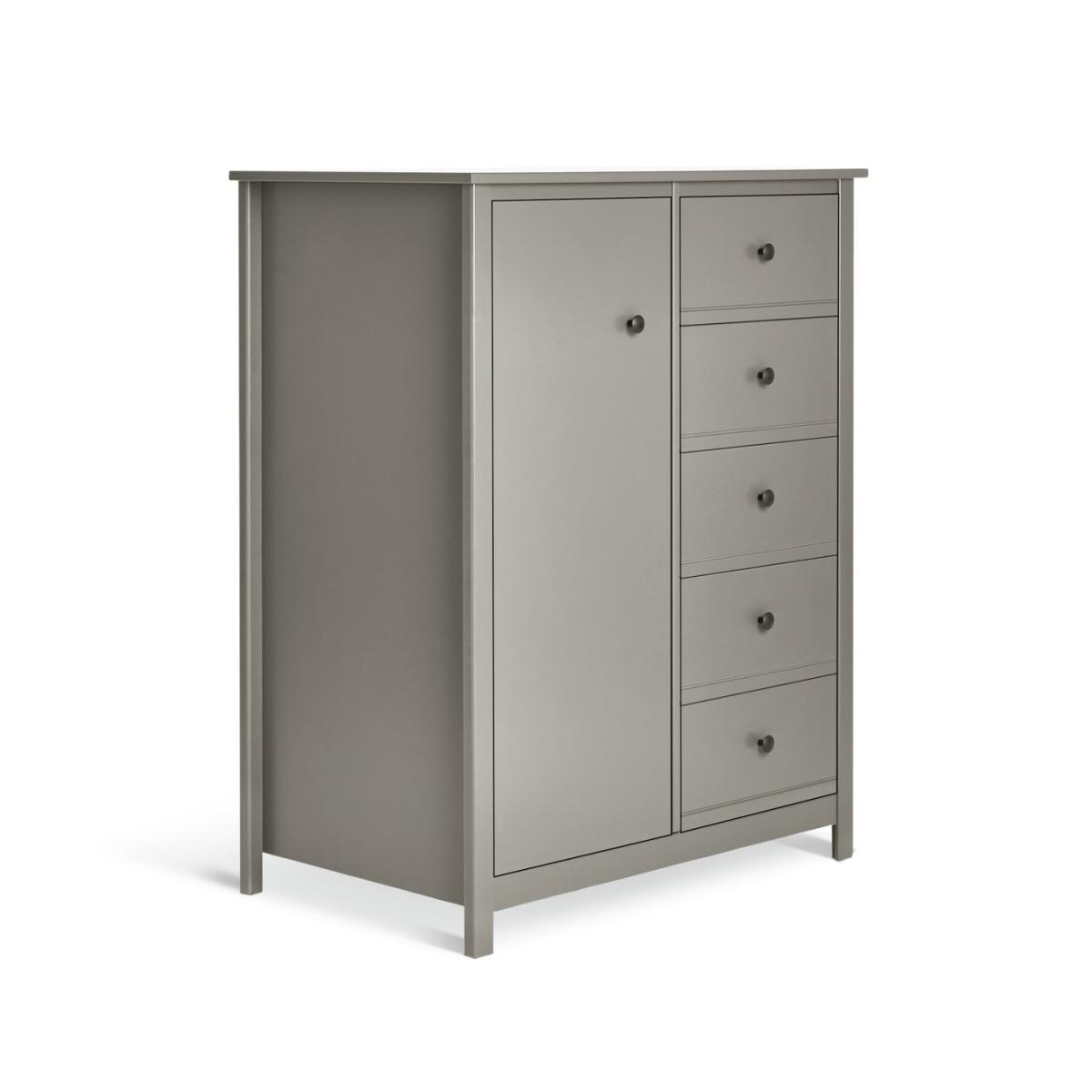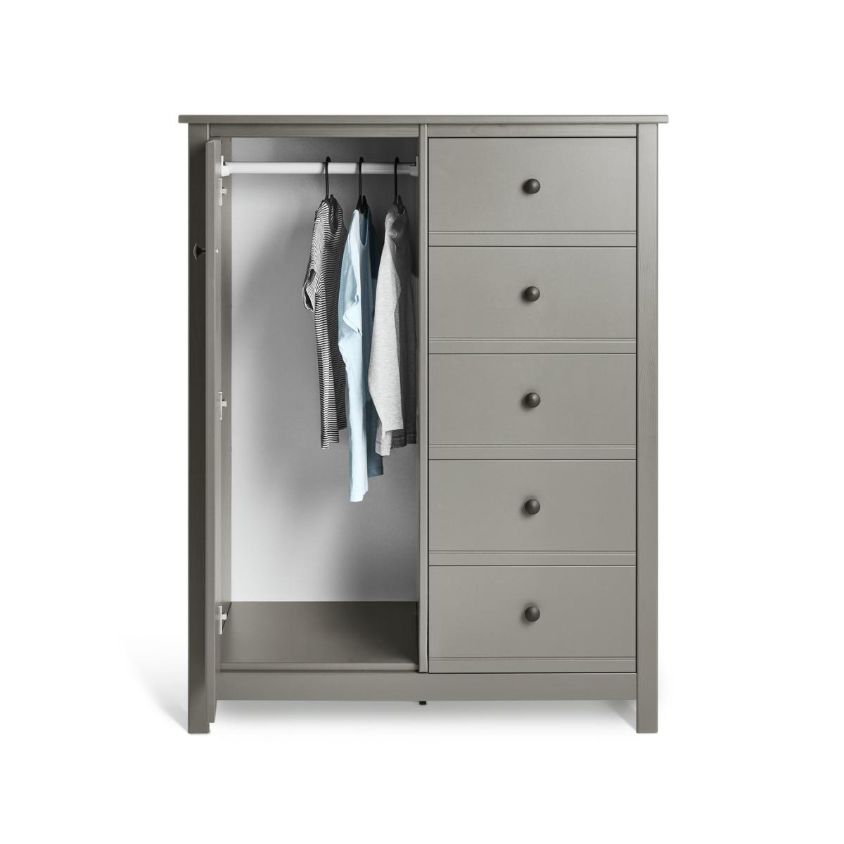 Cool and classic, the Brooklyn collection suits both stylish kids and first-time adult bedrooms. This spacious 1-door wardrobe offers smart storage with 1 hanging rail and 5 deep drawers – ideal for sharing or keeping things organised. Made from solid pine and MDF, it's sturdy and built to last. Complete the look with matching furniture from the Brooklyn range. Part of the Brooklyn collection. Made of MDF and pine. Metal handles. 1 door. 5 drawers with metal runners. 1 fixed hanging rail. Hanging rail holds up to 10kg. Self-assembly - 2 people recommended. If this product is over 60cm high it must be securely attached to the wall to prevent overturning. Dimensions: Size H125, W64, D49cm. Internal hanging space H15, W61, D46cm. Internal drawer H18, W33, D35cm. Handle size: L2, W2cm. Weight 47kg. Package Dimensions: Package 1 dimensions: H8, W139, D50.5cm. Package 1 weight: 25kg.