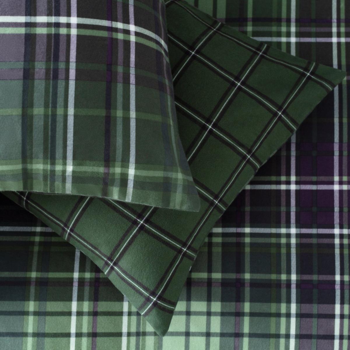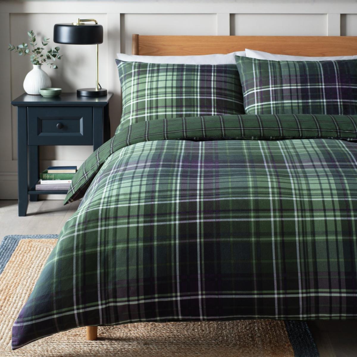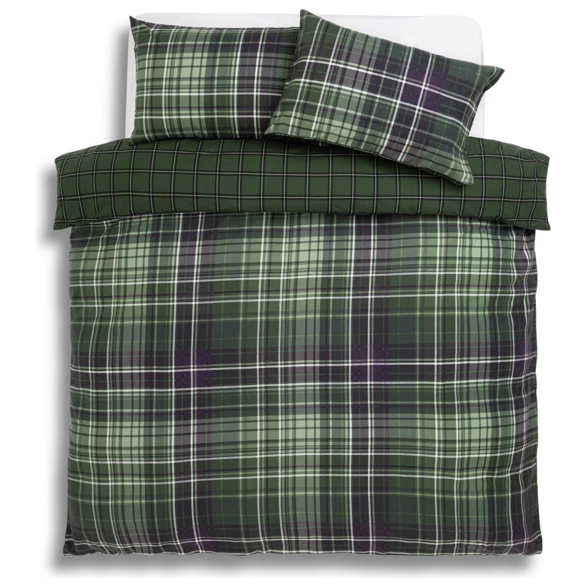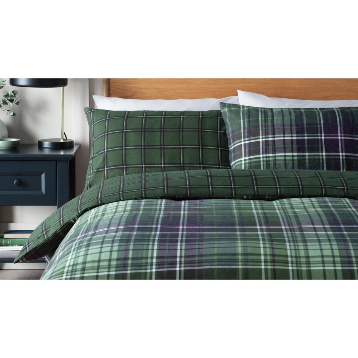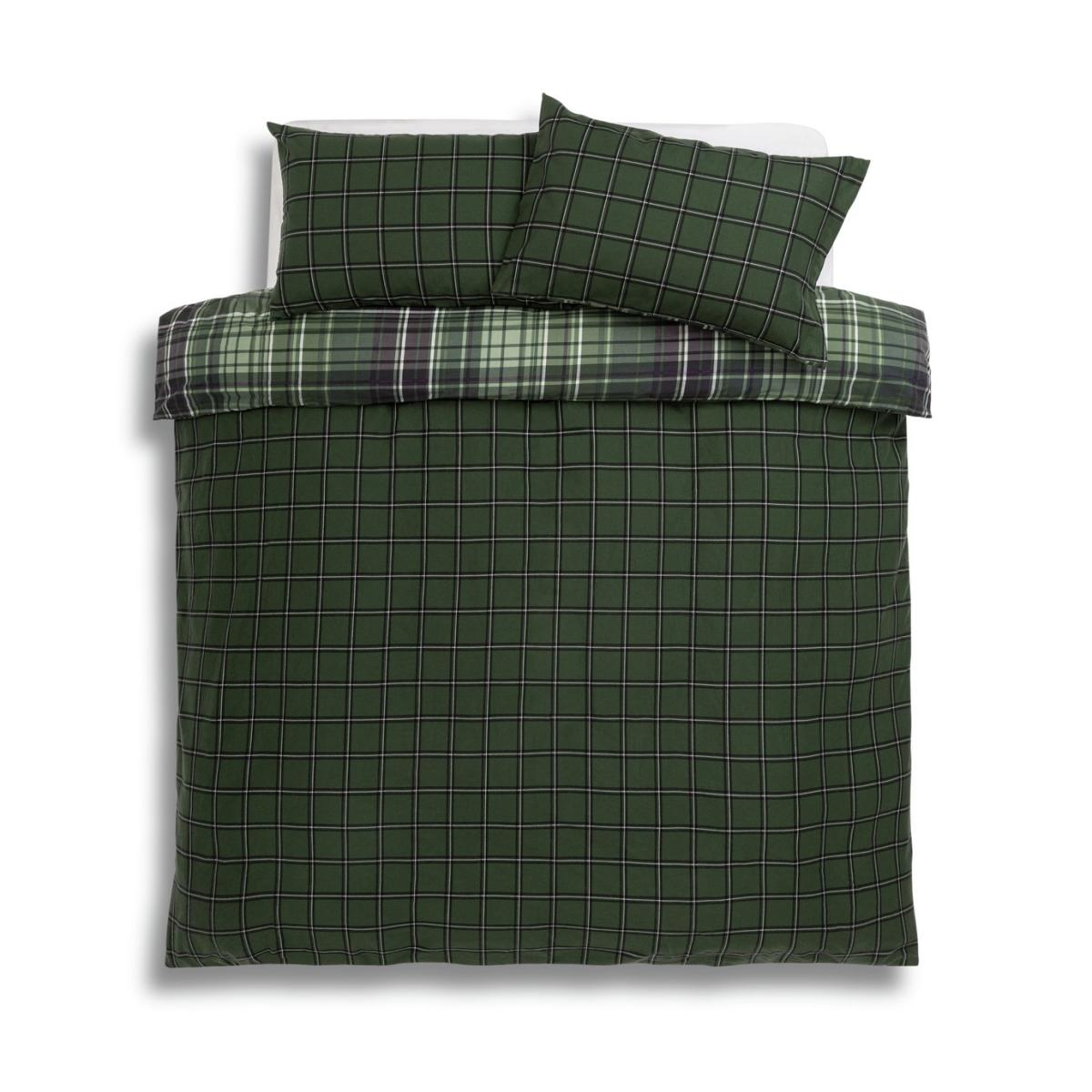 A real winter warmer. Our classic tartan green bedding set is designed with your home comforts in mind. Slip into the warm, soft 100% brushed cotton. So gentle against the skin. Check it out. With a reverse palette, just flip this duvet and pillow set to instantly lighten or darken your colour dynamic. This item carries the STANDARD 100 by OEKO-TEX logo, which means you can be certain that every component has been tested for harmful substances and is therefore harmless to human health. Finish: brushed. 100% cotton. Set includes 1 duvet cover and 2 pillowcases. Bed size: super king. Length 220cm, Width 260cm. Normal confection edging detail. Buttons for fastening. Standard pillowcase (s). Pillow case length 75cm, Width 50cm. Machine washable. Suitable for tumble drying.