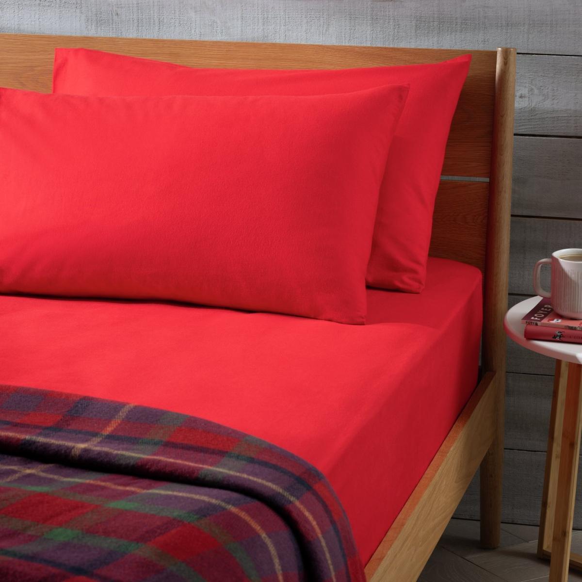 Our pair of 100% brushed cotton red pillowcases feel warm and toasty. Add the matching fitted sheet for a soft and inviting set. Enjoy falling in to our 100% Cotton brushed bed linen set, Keeping you warm & Toasty night after night. This item carries the STANDARD 100 by OEKO-TEX logo, which means you can be certain that every component has been tested for harmful substances and is therefore harmless to human health. 2 pillowcases. Pillowcase style: Standard. Finish: woven. 100% cotton. 110 thread count. Size L75, W50cm. Gentle wash at 40 C. Suitable for tumble drying.