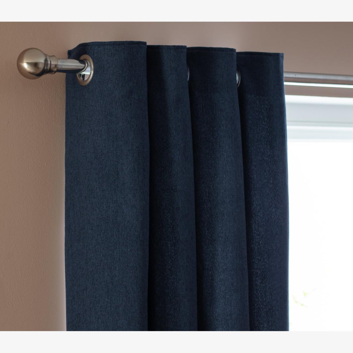 Easy, cosy curtain comfort. That's the big draw of these brushed thermal eyelet curtains. In relaxing navy, they have a homely style. Designed for warmth, the thermal backing helps keep the cold out and the heat in. And being lined also means they fall into soft satisfying folds from the shiny stainless-steel eyelets. Simply stylish. This pair of curtains have a thermal lining. So that's a big yes for snuggly privacy and luxury lie-ins. Bring out the natural beauty of these textured fabric curtains by choosing cushions and rugs that pick up on the soothing decor. Navy Plain Design. Silver Stainless Steel Eyelets. Features Made from 100% polyester. Lining made from 100% polyester. Dimensions Size 168cm (66 inches) wide by 229cm (90 inches) drop. Eyelet diameter: 4cm. General information Contains one pair of curtains. Suitable for curtain poles. Curtain pole not included. Professional clean only. General Information: We are excited to be welcoming some of our favourite HOME products into the Habitat range. Your product may arrive in Habitat or HOME packaging.