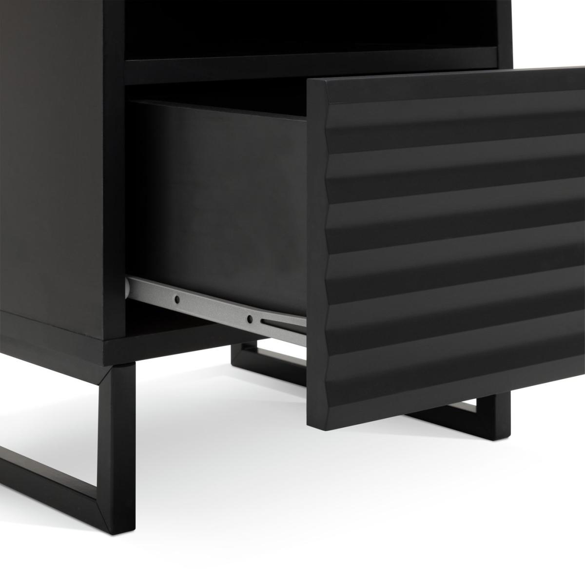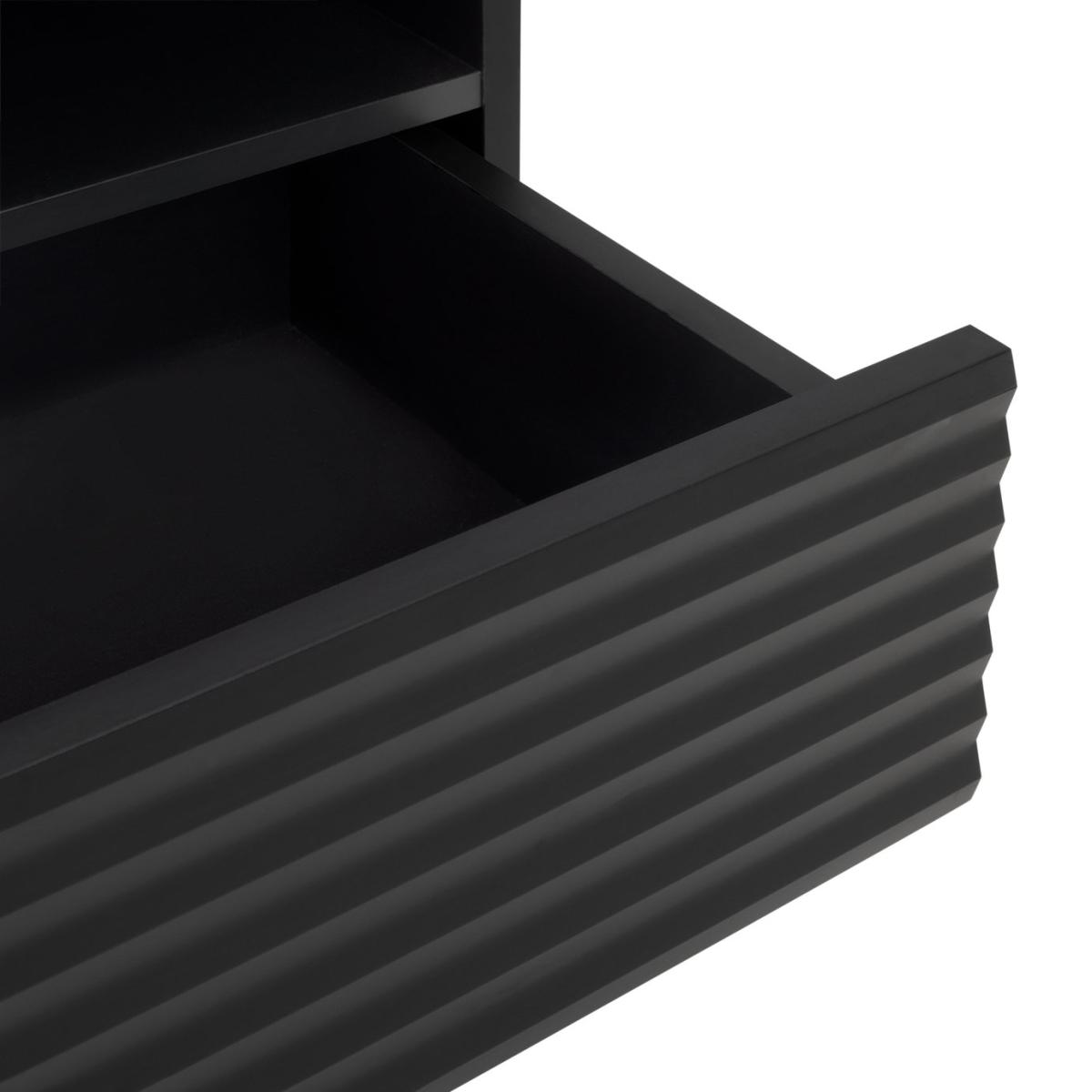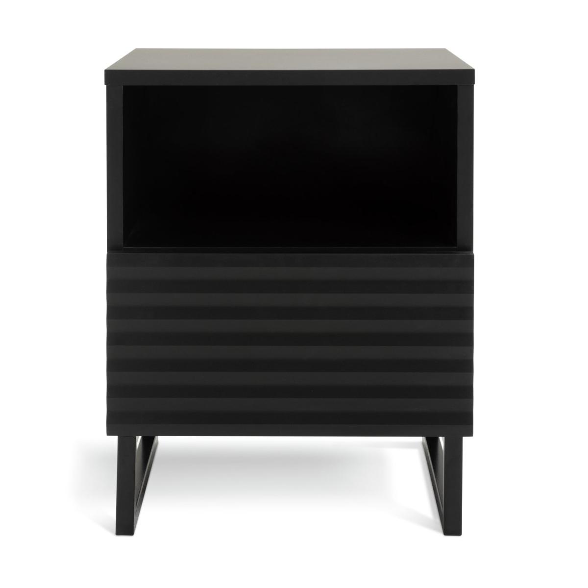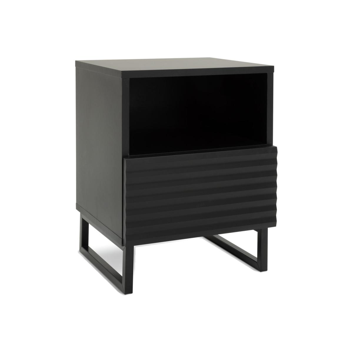 Clean lines and a high-end luxury look. Our bedside table offers the best in contemporary design. With 1 deep, push-to-close drawer behind its seamless ribbed front. And an open top easy reach space for creams, notebooks, tablets, remotes and more. Set on angular legs and finished in midnight black, this modern cabinet is a showpiece for sure. Part of the Cairo collection. Made of particleboard. 1 drawer with metal runners. 1 fixed shelf. Self-assembly - 1 person recommended. If this product is over 60cm high it must be securely attached to the wall to prevent overturning. Dimensions: Size H54.2, W40, D36.7cm. Internal drawer H14, W30, D28cm. Weight 14.3kg. Package Dimensions: Package 1 dimensions: H19.8, W59.4, D38.2cm. Package 1 weight: 14.3kg. General information: We are excited to be welcoming some of our favourite HOME products into the Habitat range. Your product may arrive in Habitat or HOME packaging. Manufacturer's 1 year guarantee.