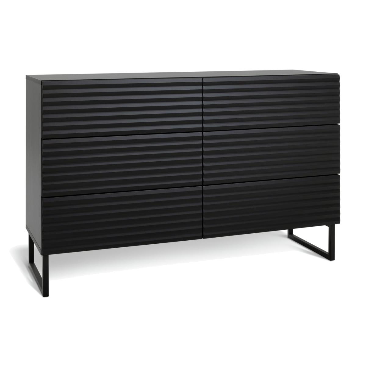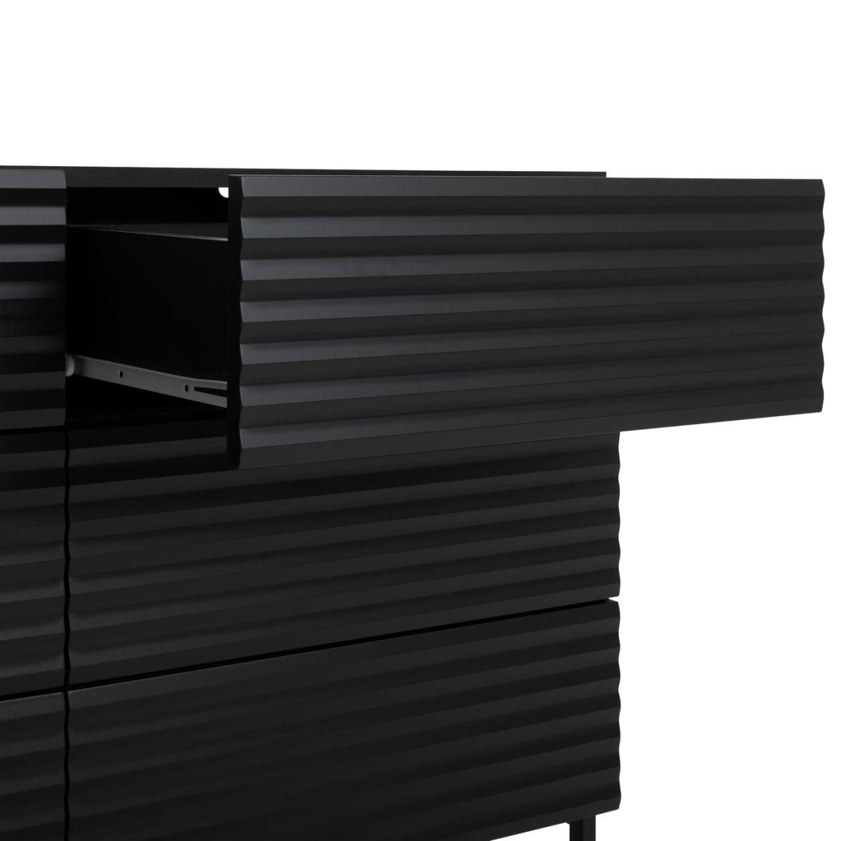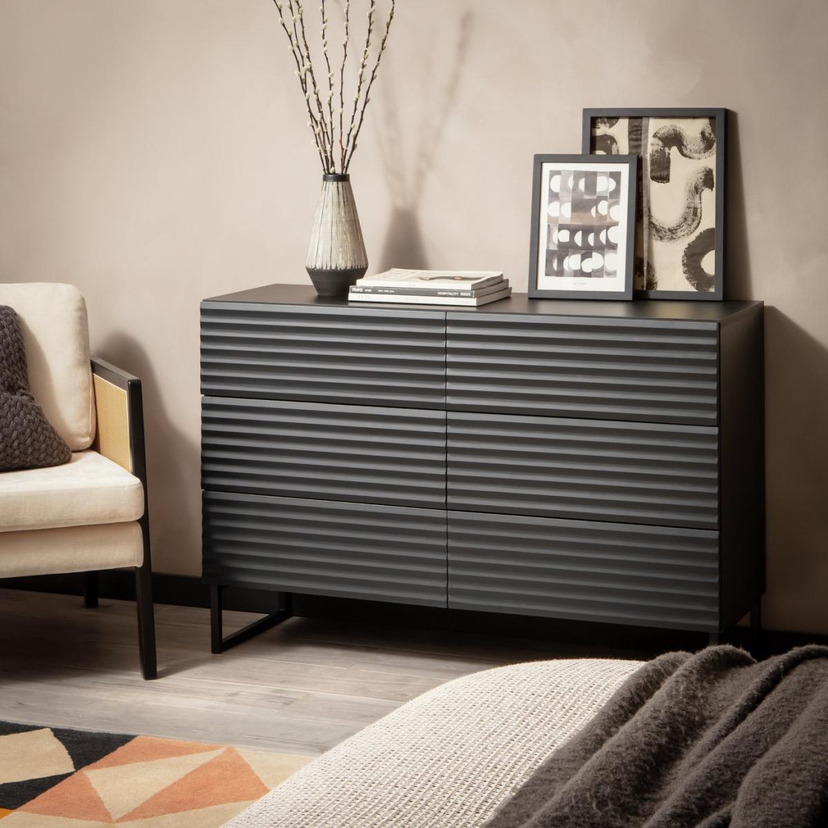 Clean lines and a high-end luxury look. This is a chest of drawers worth showcasing. With 6 deep, push-to-close drawers that glide open from the seamless ribbed front. A textural masterpiece for those that love contemporary design. Set on angular legs and finished in midnight black. Part of the Cairo collection. Made of particleboard and MDF. 6 drawers with metal runners. Self-assembly - 2 people recommended. If this product is over 60cm high it must be securely attached to the wall to prevent overturning. Dimensions: Size H80.6, W120, D39.7cm. Internal drawer H21, W57.2, D33.1cm. Weight 56kg. Package Dimensions: Package 1 dimensions: H1062, W414, D146cm. Package 1 weight: 27kg. Package 2 dimensions: H1416, W414, D97cm. Package 2 weight: 28kg. General information: FSC certified meaning the materials used for this product are responsibly sourced. Manufacturer's 1 year guarantee.