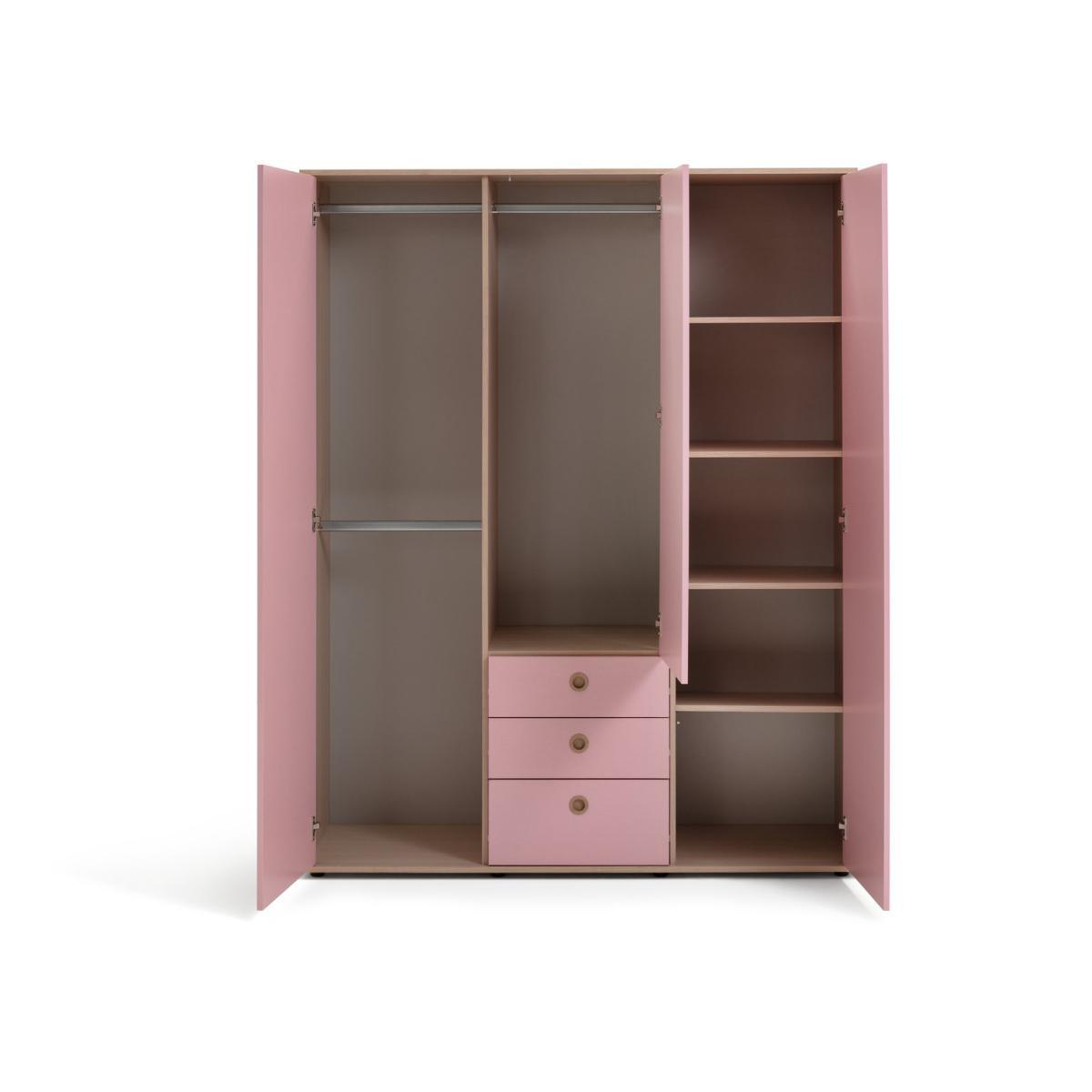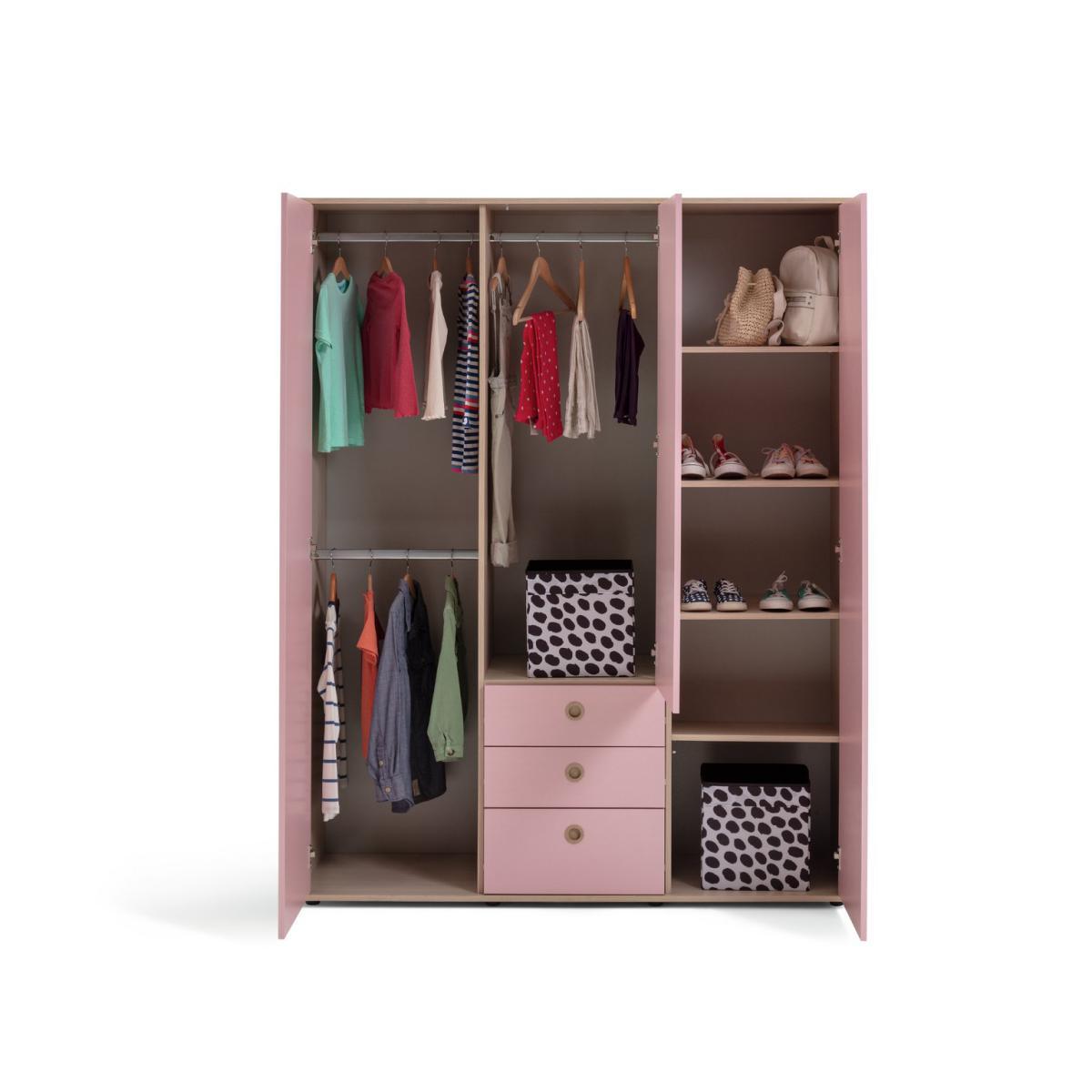I love this wardrobe for its playful yet practical design, making it a great focal point in any child's bedroom. The pink and acacia finish adds warmth and colour, perfect for brightening up a colourful or neutral interior. It works well in modern or Scandi-inspired spaces thanks to its clean lines and soft tones. For styling tips, consider pairing it with simple, functional bed linen and accessories in complementary pastel shades to create a cohesive look. Adding some organisation solutions inside-like storage boxes or hanging organisers-helps keep the space tidy and functional for little ones. Overall, it's a fun yet versatile piece that brings colour and practicality together effortlessly.