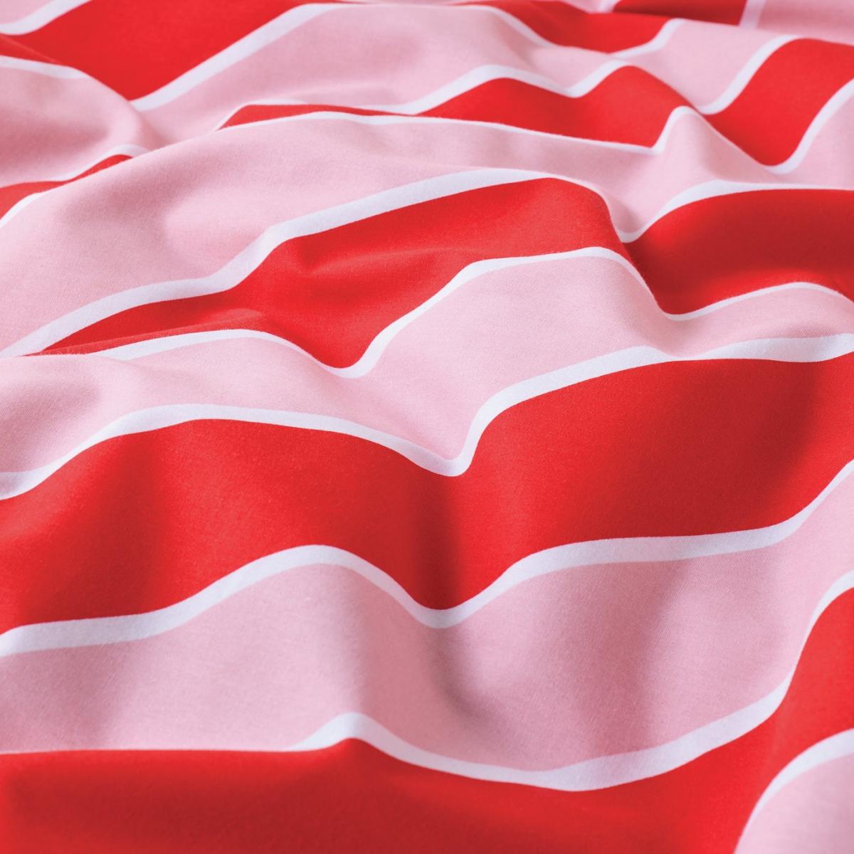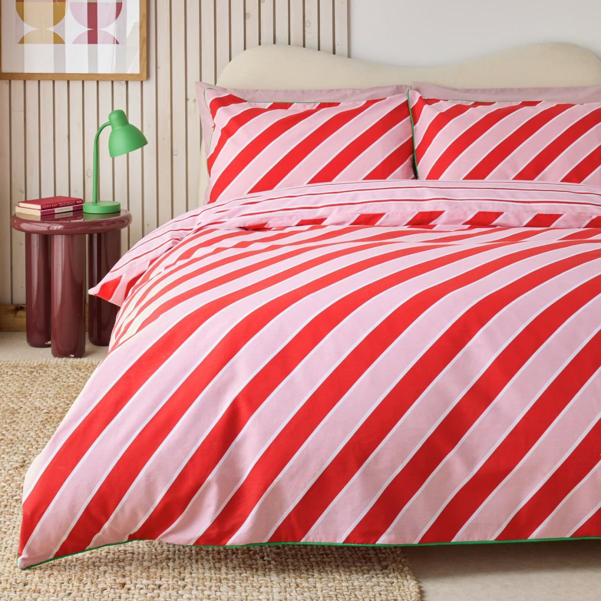 Bold, bright and playful. This candy stripe double bedding set brings instant joy and comfort to the bedroom. Diagonal bands of red and pastel pink are framed with crisp green piping for a fresh finish. Fancy a softer look? Flip it over for a simpler pattern with fine lines. Sleep sweetly. Fabric finish: percale. 52% recycled polyester, 48% cotton. 144 thread count. Set includes 1 duvet cover and 2 pillowcases. Bed size: double. Length 200cm, Width 200cm. Reversible. Buttons for fastening. Standard pillowcase (s). Pillowcase length 75cm, Width 50cm. Machine washable at 40 C. Suitable for tumble drying.