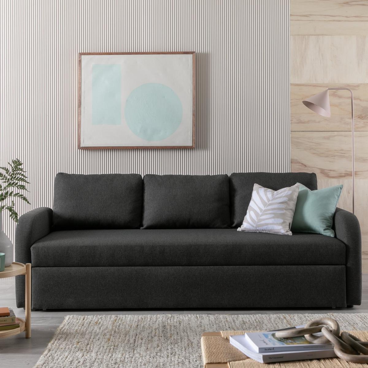 Meet Carter. Comfy sofa to stayover bed. Just pull out, pull up. Hey presto. You've done it, and it's just as easy to reverse. In a 'go with everything' shade of charcoal, Carter comes with elegant, curved arms. A versatile, foam seated sofa with softness at its heart. Check out the highly soft, plumpable cushions on the backrest that make Carter such a popular sofa bed choice. Part of the Carter collection. Material: Made from 100% polyester. Plastic feet. Fixed seats with foam filling. Fixed cushion(s) with foam filling. Dimensions: Sofa size H86, W224, D54cm. Floor to seat height: 45cm. Depth of seat: 54cm. Height of seat back: 43cm. Width of seating area between arms: 198cm. Height of arm rest: 60cm. Weight 102kg. Dust or wipe with a damp cloth only. Plump cushions regularly to maintain shape. Minimal assembly - just add feet. Maximum individual user weight 130kg. Packaged dimensions: Package size H77, W234, D100cm. Second package size H33, W204, D90cm. General information: We are excited to be welcoming some of our favourite HOME products into the Habitat range. Your product may arrive in Habitat or HOME packaging. Manufacturer's 2 year guarantee. FSC certified meaning the materials used for this product are responsibly sourced.