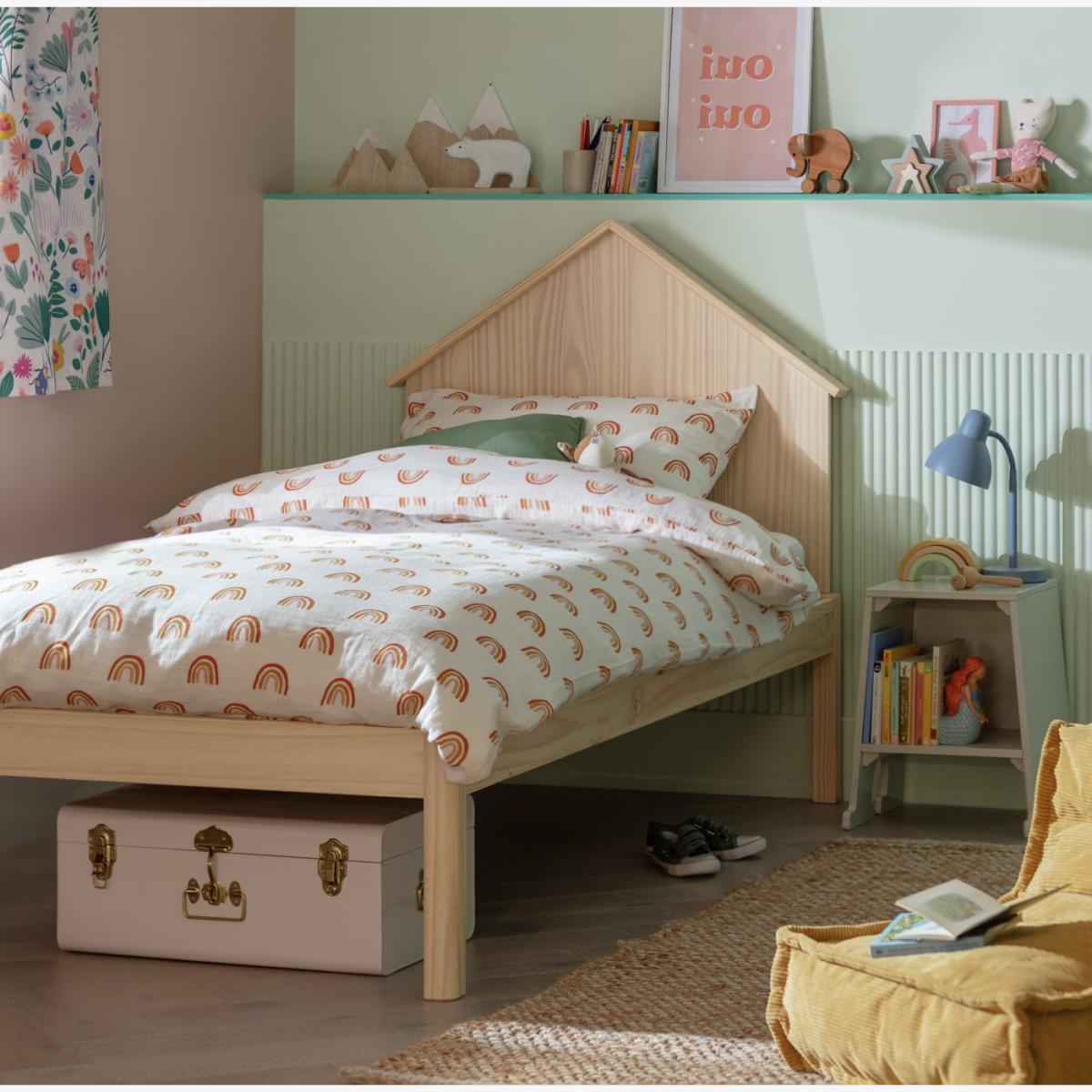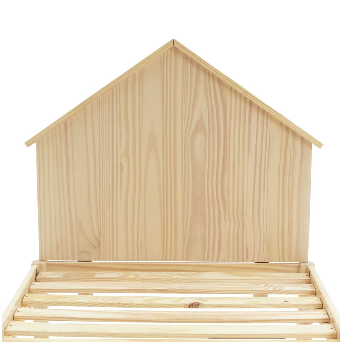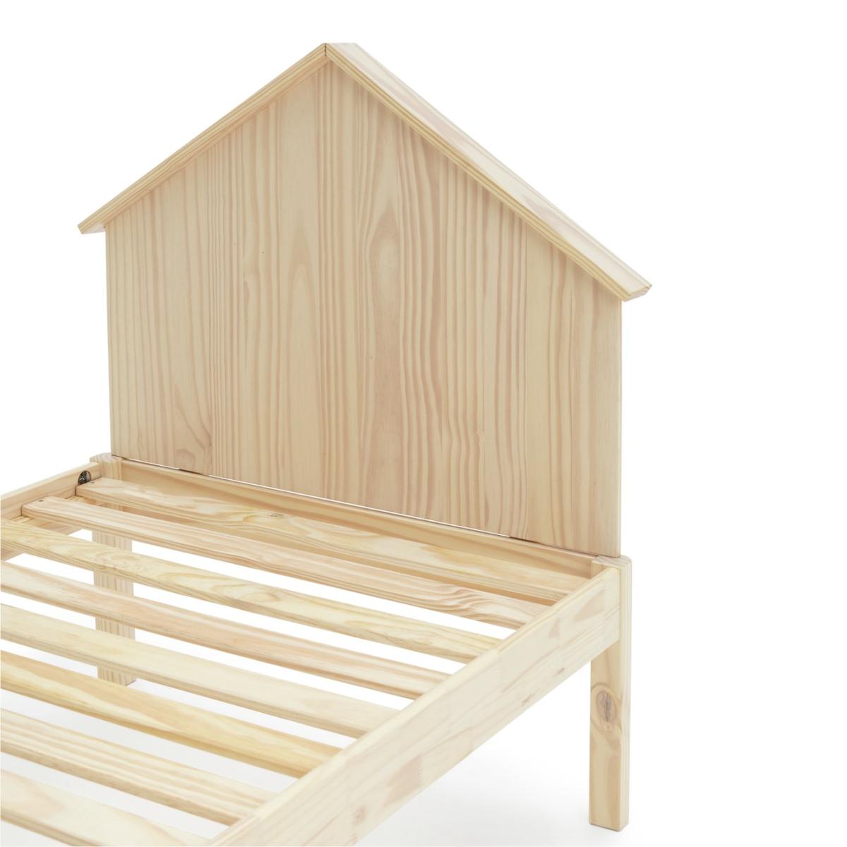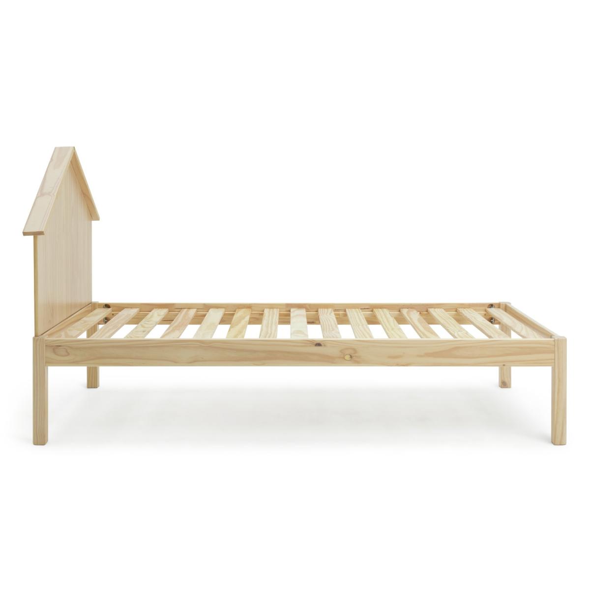 Mi casa, su casa. Kids will love the cute house headboard on this natural pine bedframe. It turns an essential piece of furniture into a fun feature. The legs have child friendly rounded edges, and the base has wooden slats to let your mattress breathe. Plus, the platform style means plenty of room underneath for tucking away boxes of toys or clothes.