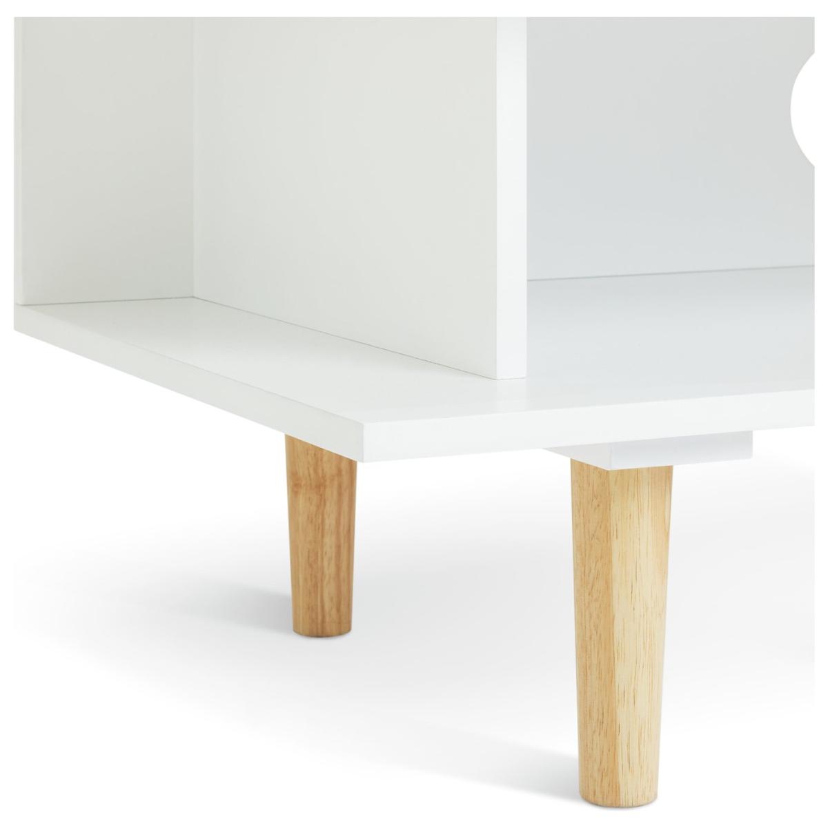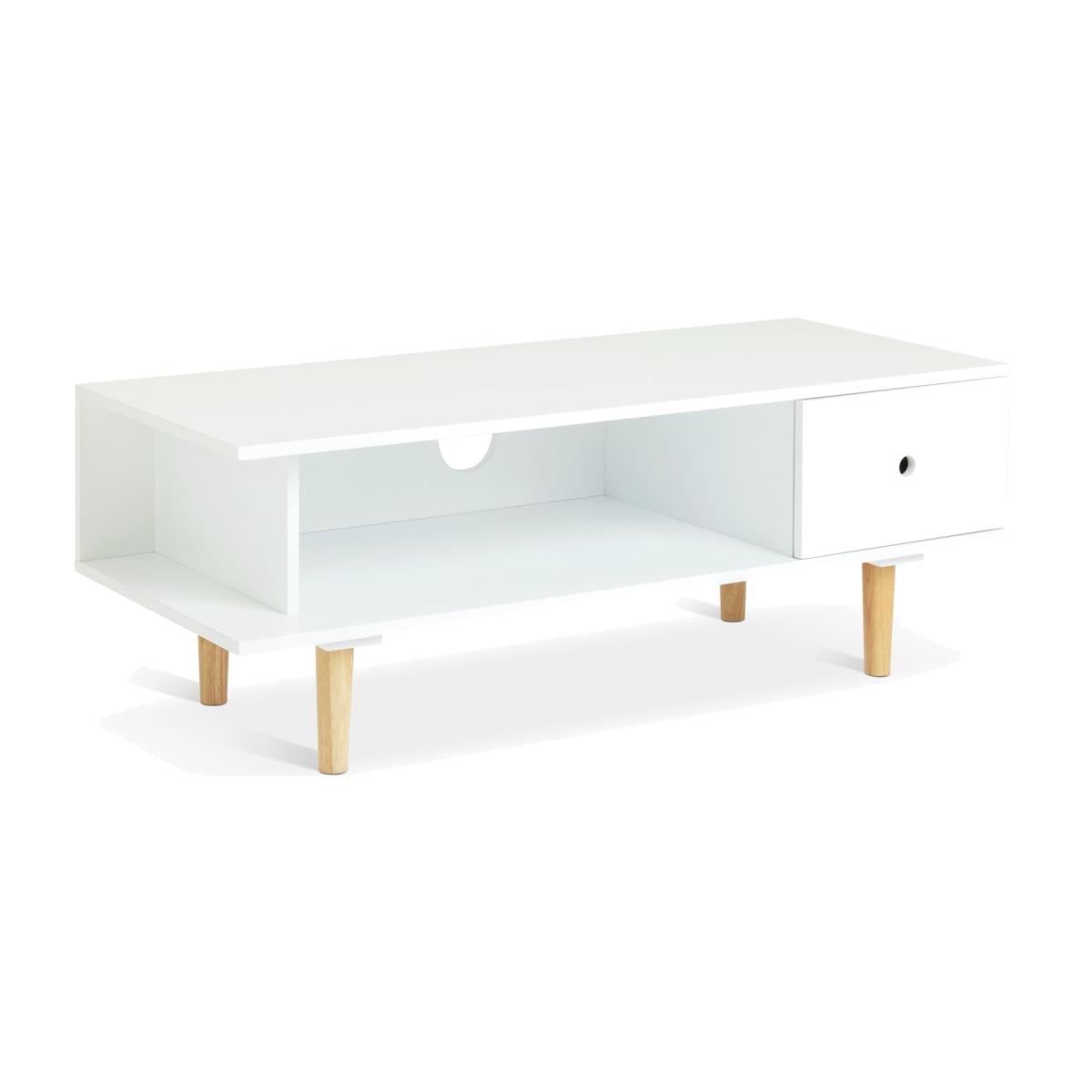 Simple, spacious and super sleek. Store your TV on this stylish and practical entertainment unit. There's more than a nod to Skandi design in the white and natural wood materials. We've kept it simple with one shelf and one drawer for storage. The quirky circular drawer opening is something we think you'll love too. And for cable tidiness, just thread them through the back of the unit. Sit this sleek TV unit against a wall in your lounge or bedroom and dress it up with a pot plant or two. Beautiful. Part of the Cato collection. Made from MDF and solid wood with a painted finish. Size H 39.9, W 110, D 45cm. Weight 20.5kg. 1 drawer with metal runners. 1 shelf. Easy cable access. Maximum weight of TV 20kg. Self-assembly - 2 people recommended. General information: Manufacturer's 1 year guarantee.