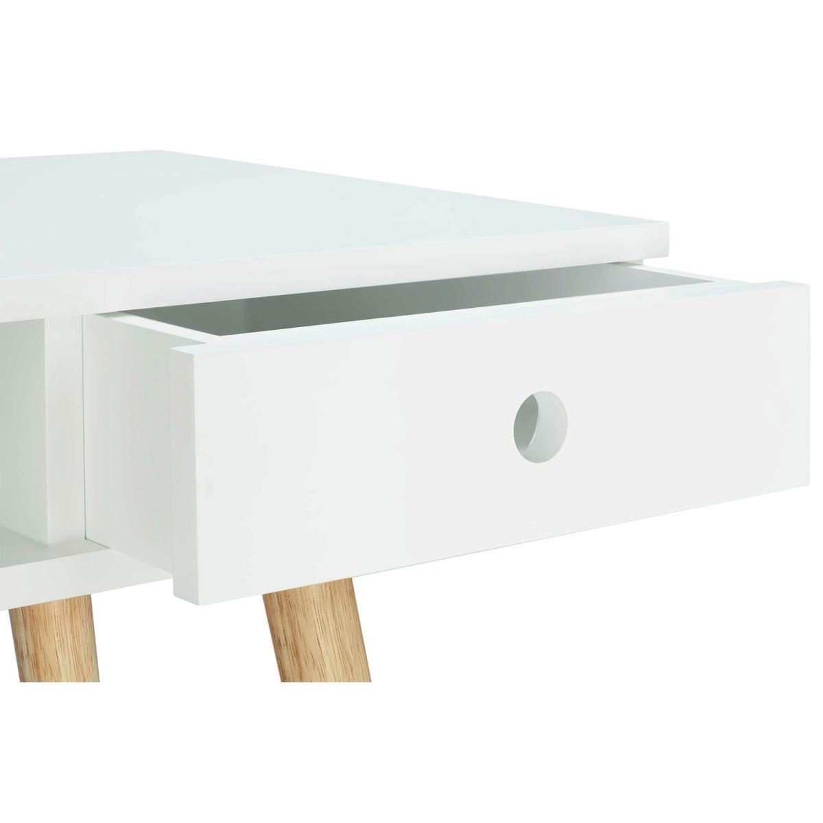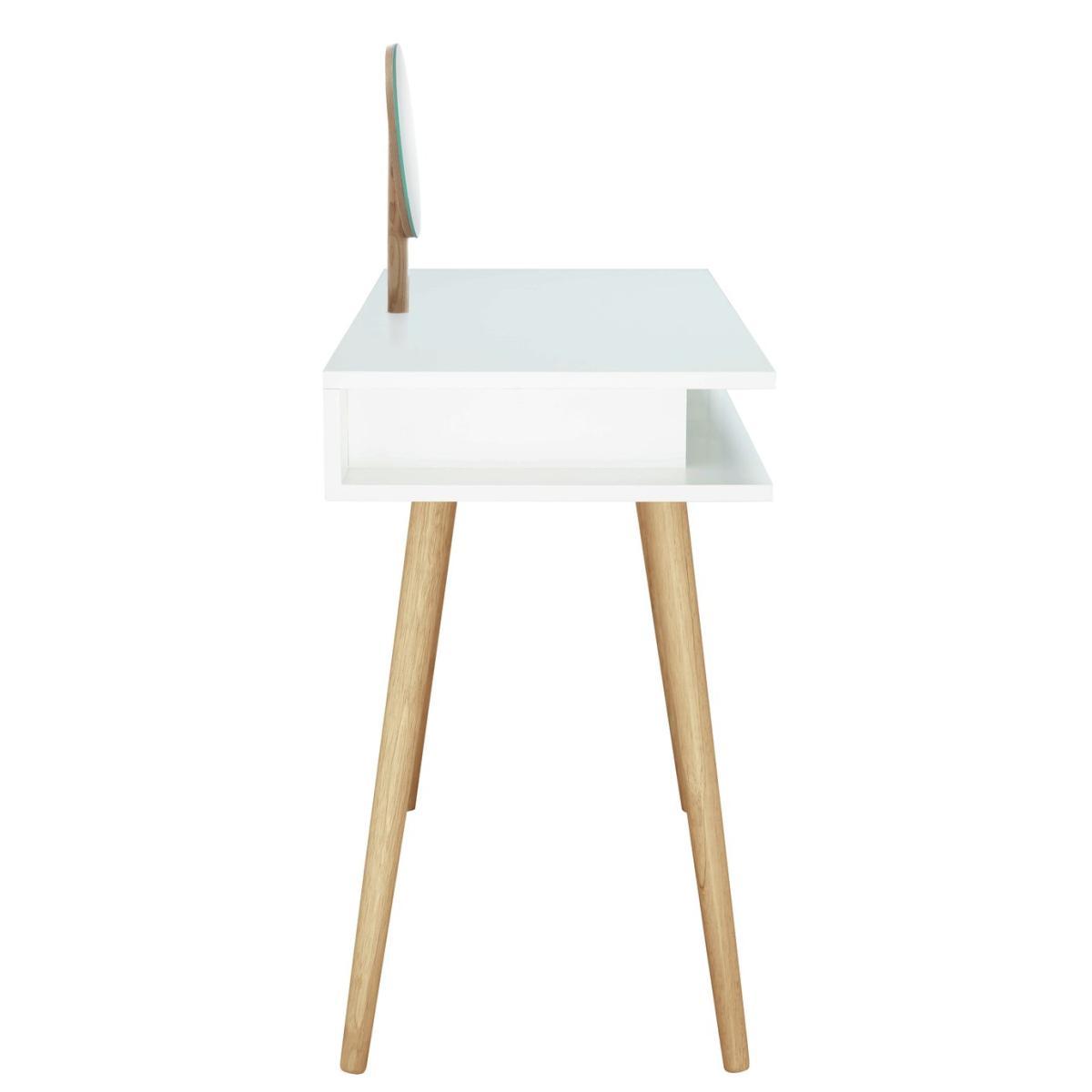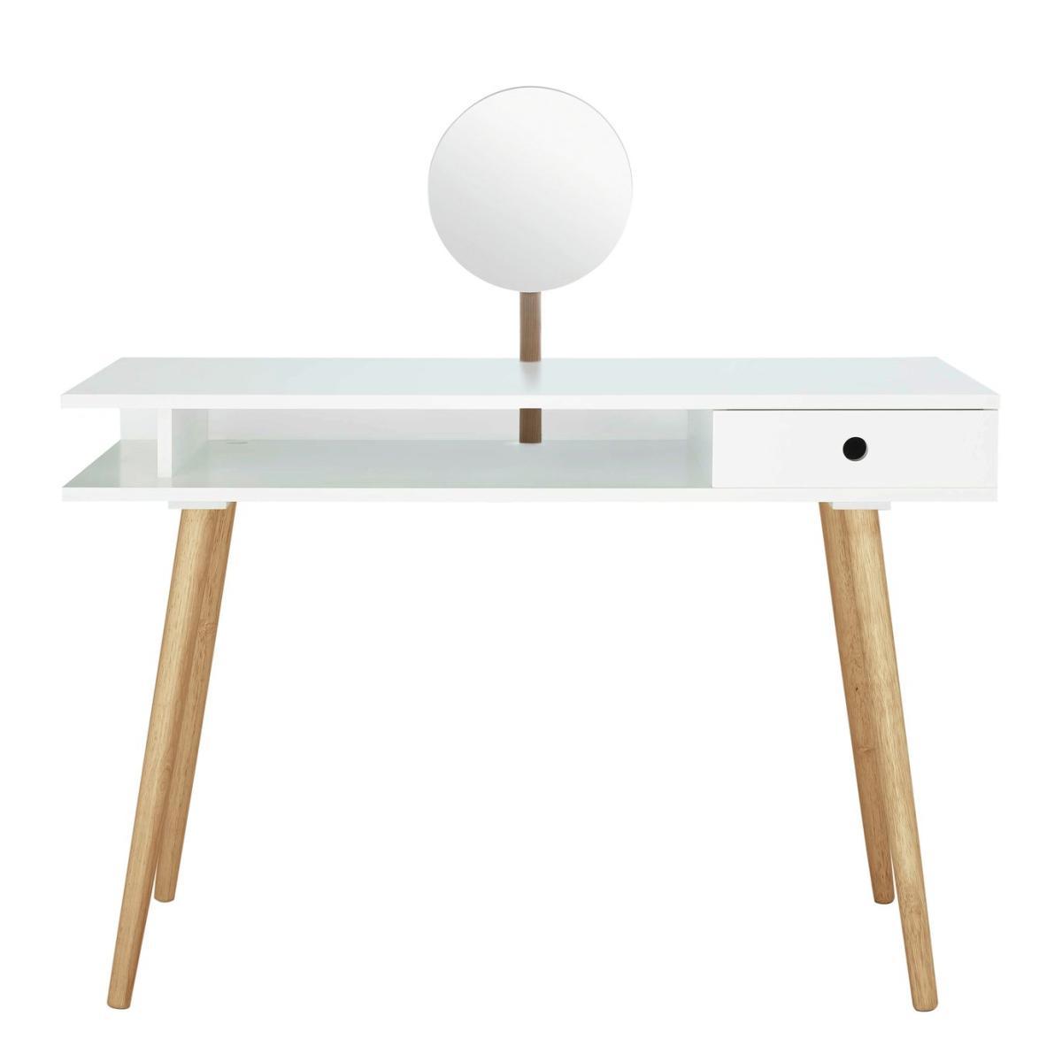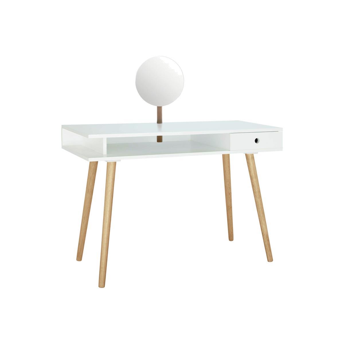 The Cato white dressing table with mirror is perfect for smaller spaces. A contemporary design with elegant, slim line legs. It has a drawer for storing away a few of your favourite cosmetics. Easy to assemble, this versatile piece has a round mirror which can be removed to use the dressing table as a desk. Part of the Cato collection. Made from rubberwood. Complete with mirror. Minimal assembly. If this product is over 60cm high it must be securely attached to the wall to prevent overturning. Dimensions: Size H85, W120, D21cm. General Information:Manufacturer's 1 year guarantee.