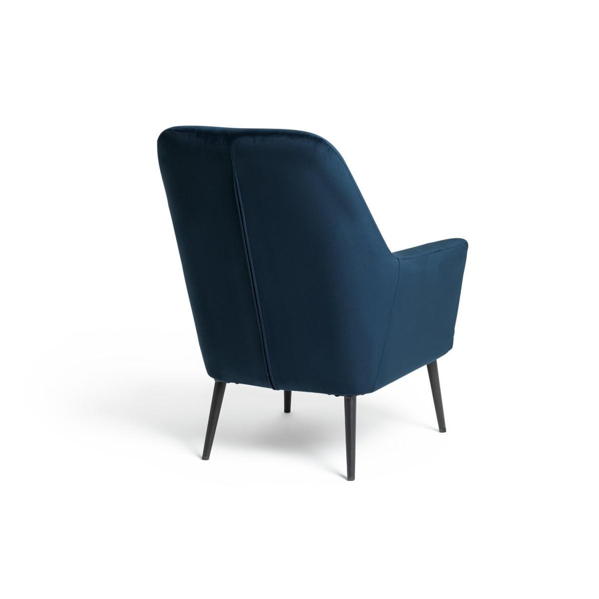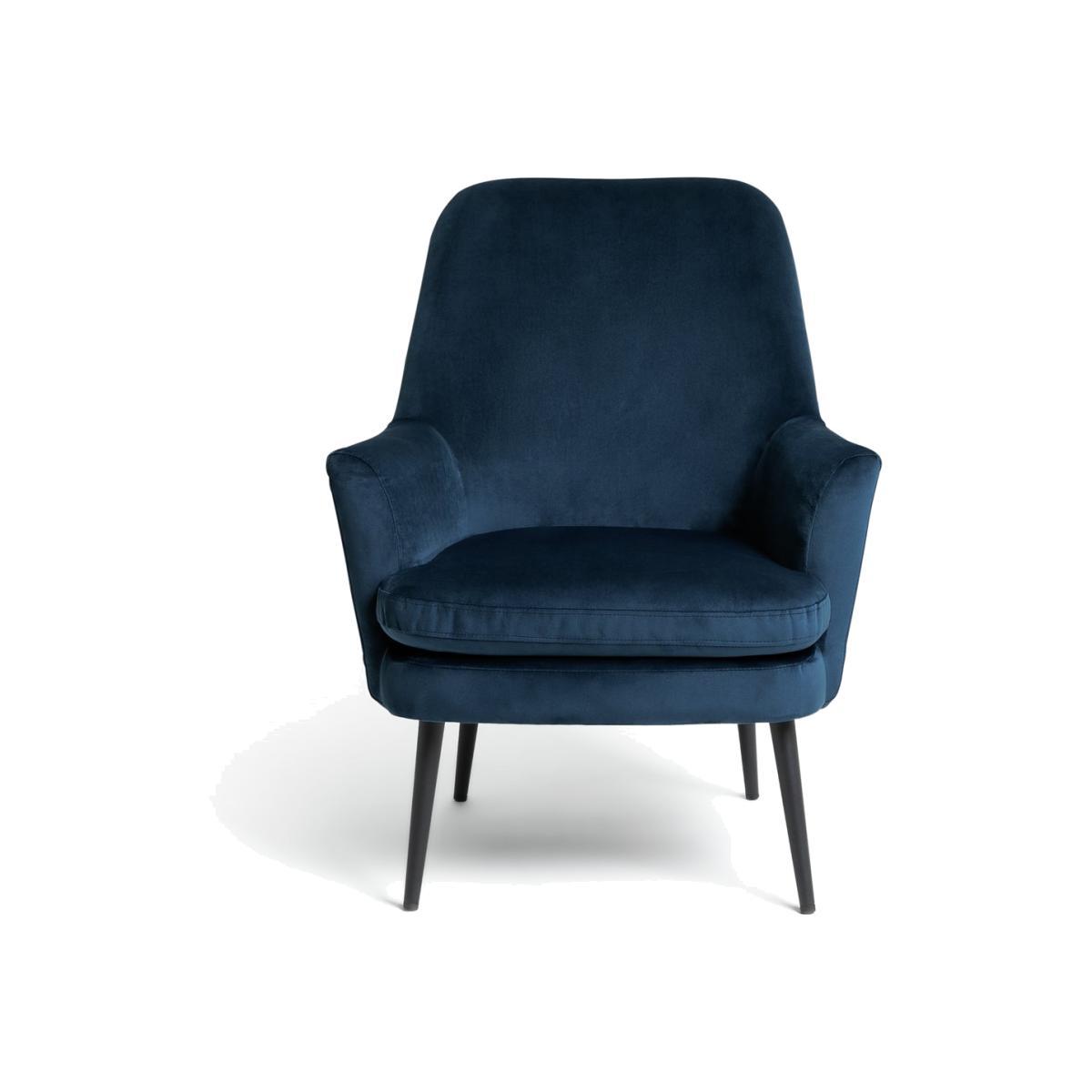 I love this chair for its rich navy velvet upholstery, which instantly adds a touch of sophistication and colour to any space. Its high back and plush cushioning make it both comfortable and visually striking, perfect for use as an accent piece in living rooms, bedrooms, or even home offices. It works particularly well in modern, mid-century, or eclectic interiors, where its bold colour can stand out against neutrals or complement other jewel tones. Practical styling tips include pairing it with a patterned cushion or layered textured throws to add depth, and placing it alongside a brass or woodside table to finish the look. The accompanying footstool makes it a versatile choice for relaxation and is ideal for creating a cosy corner in your home.