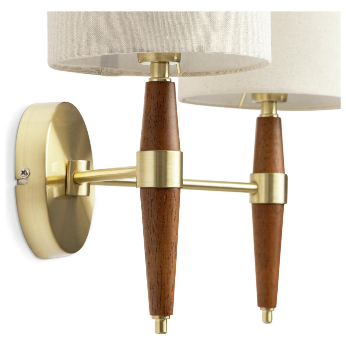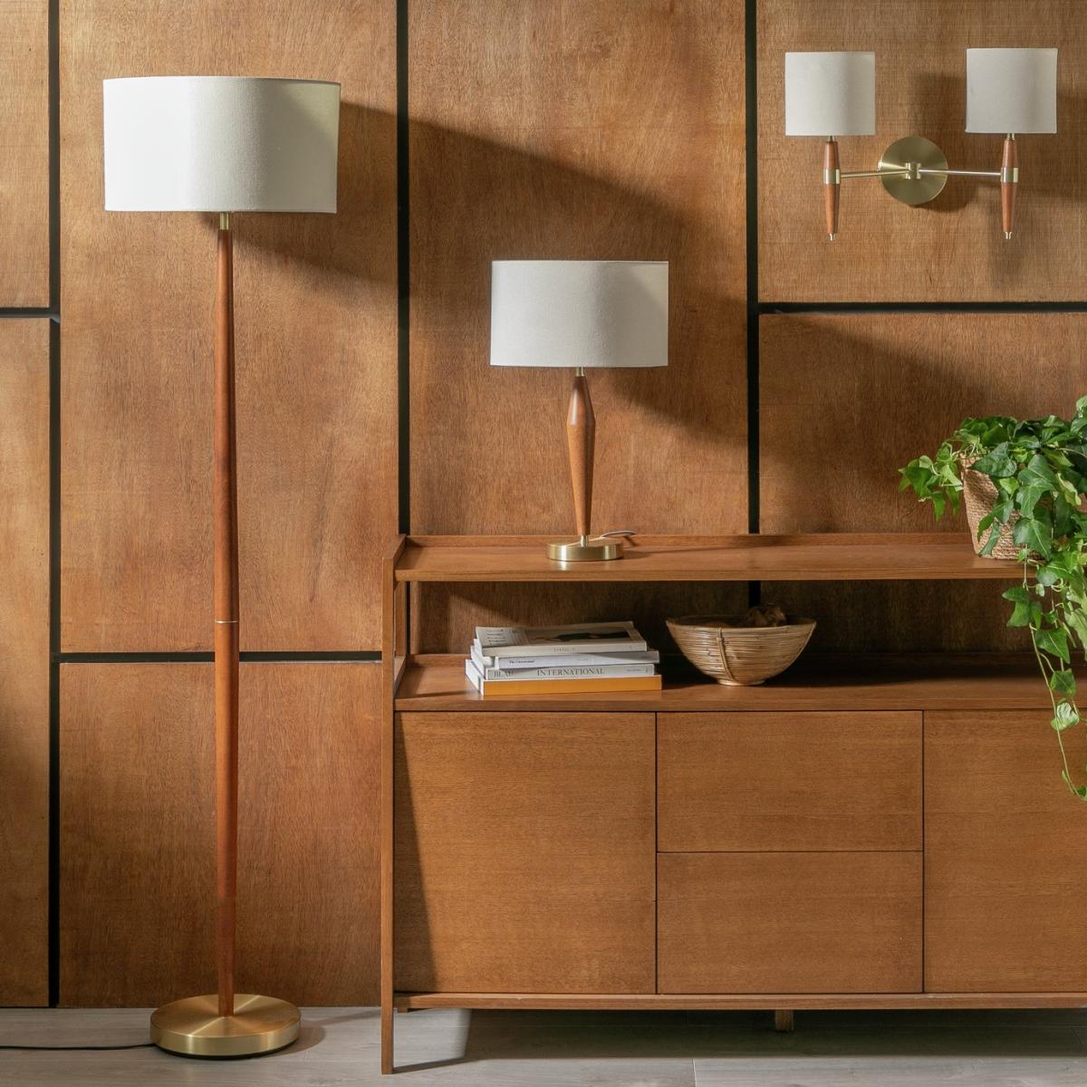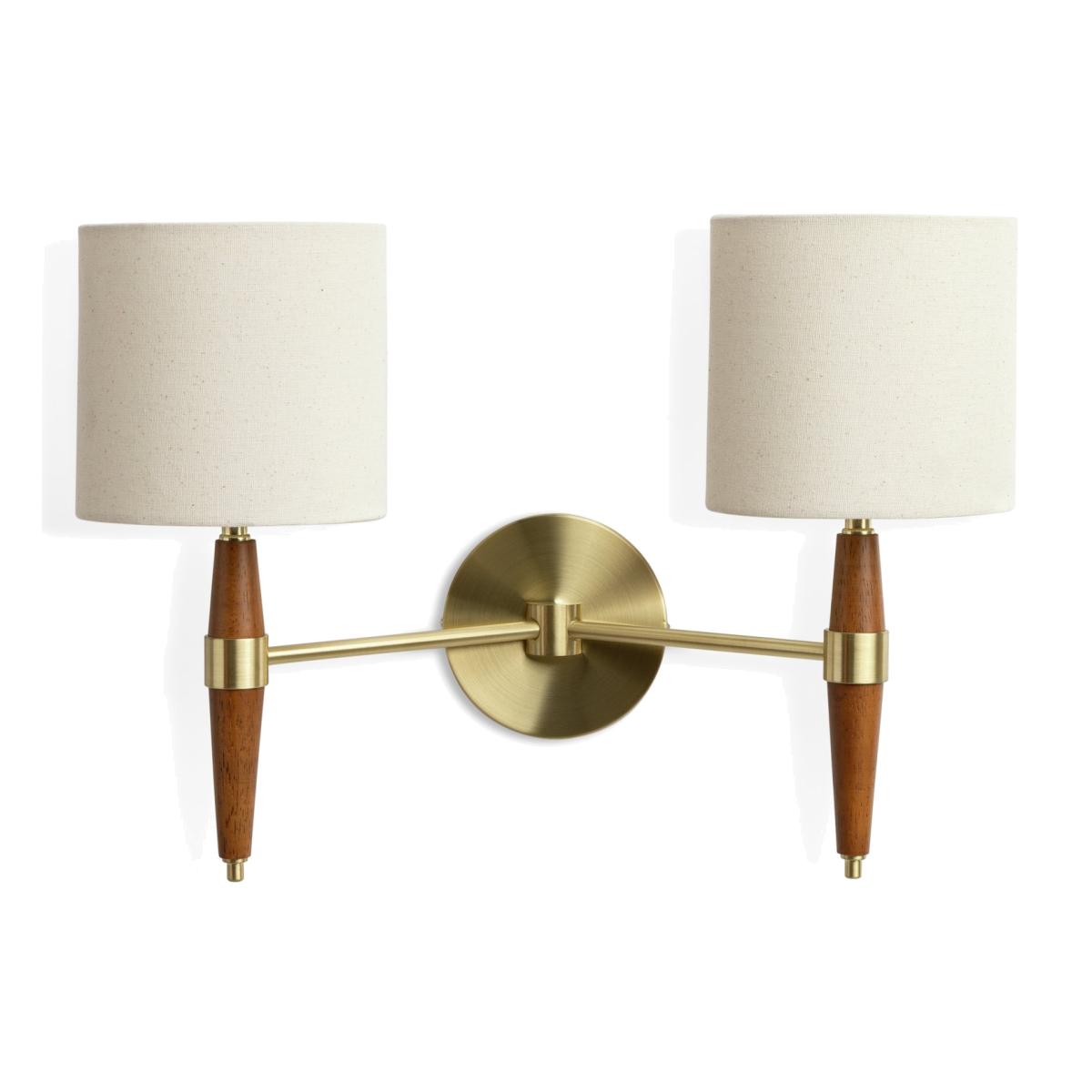 Walnut, brass and linen. A classic combo given a mid-century modern makeover. Our twin wall light have a quiet elegance you can feel comfortable with. Enjoy the design. Clean bold lines, the warmth of walnut stained wood against brushed brass, topped with cream fabric drum shades. A welcome home for your wall. Balance the aesthetics. A pair of these lamps will look doubly smart. This is timeless lighting you can appreciate for years. Dimensions: Size H32, D21cm, Diameter 45cm. Bulb Information: Bulbs required 2 x globe E14 small edison screw LED (not included). Recommended maximum wattage: 8 watts. Can not be used with a dimmer switch. LED bulb only. General Information: Metal and fabric. IP rating 20 - not suitable for bathroom use. Weight: 1kg. App needed for use: No. Self-assembly. Product is hard-wired into electrics. This lighting product is a class 2 fitting. We are excited to be welcoming some of our favourite HOME products into the Habitat range. Your product may arrive in Habitat or HOME packaging. Manufacturer's 1 year guarantee. FSC certified meaning the materials used for this product are responsibly sourced.
