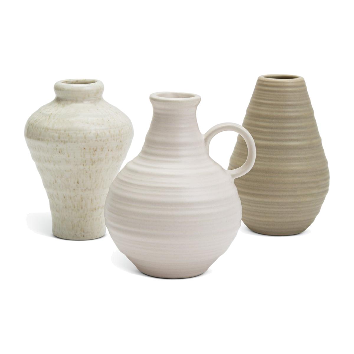 Ceramics with character. Our trio of bud vases come with handcrafted looks. And each has its own shape and personality. Neutral and natural. Just add grasses, fresh, faux or dried stems. There's a bunch of ways to make the most of them. Size H10.5, W8.9, D8.1cm. Diameter 8.1cm.