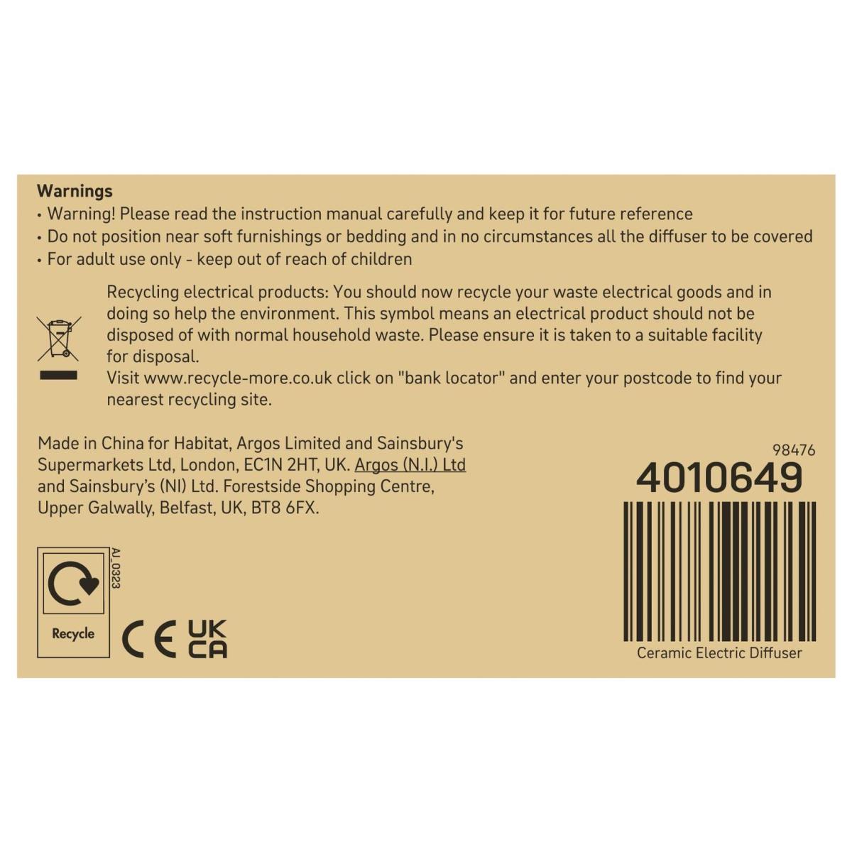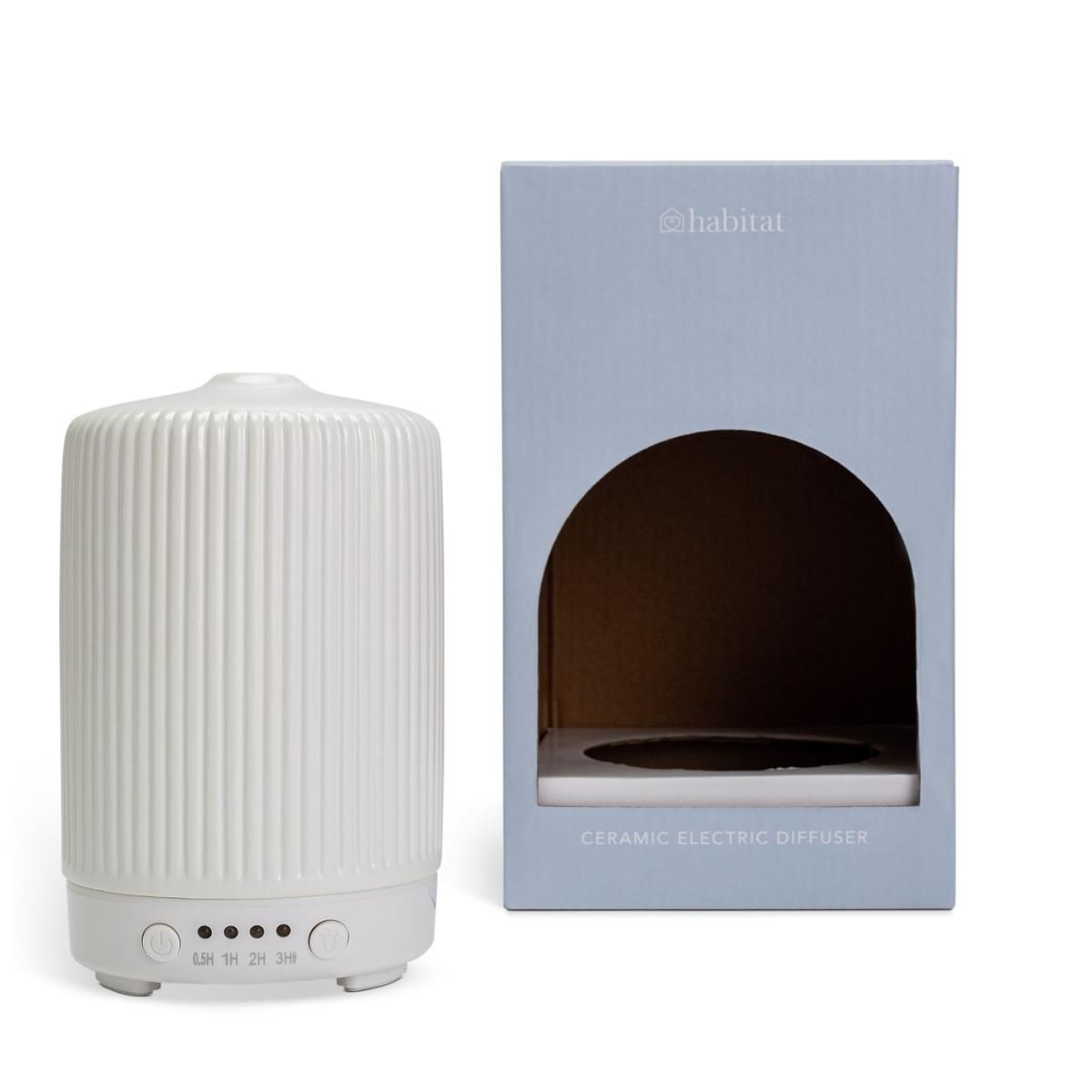 Ready to relax? Bask in a fine mist of your favourite fragrance at the flick of a switch with this smart ceramic diffuser. Just fill with water, add a few drops of scented oil and enjoy. Comes with an auto on/off switch and a 4-mist timer. What a mood maker. Refills available. Gift boxed. 100ml capacity. Size H15.5, W9.2, D9.2cm.