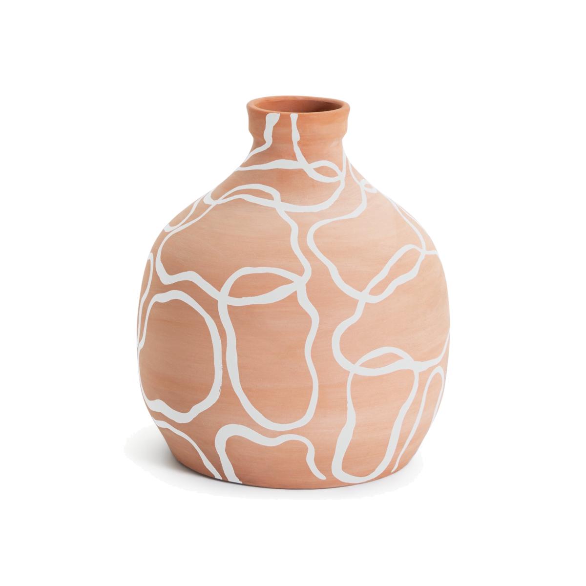 A handsomely hand-painted display. Our rounded terracotta vase with white detail brings home a touch of organic Mediterranean charm. The intricate squiggle patterns make each piece subtly unique. Fill its slim, tapered rim with a few dried flowers, or show it off as a standalone design statement. Arty and a la mode. In the mood for more memorable pieces? We've got plenty more to pick from. Size H22, W19, D19cm. Diameter 19cm.
