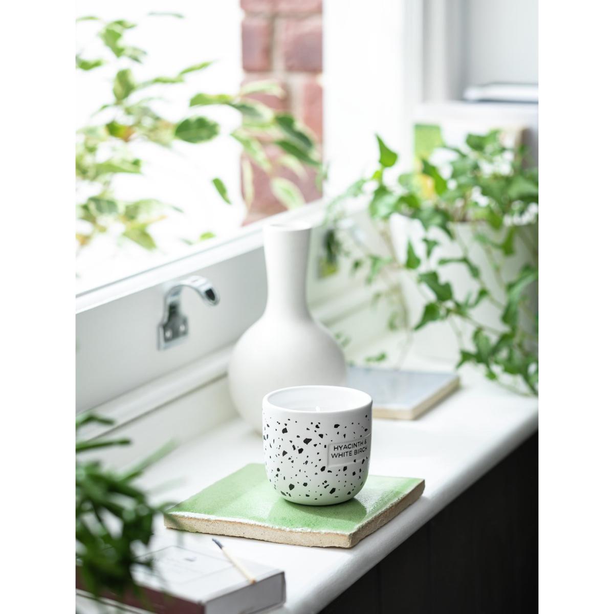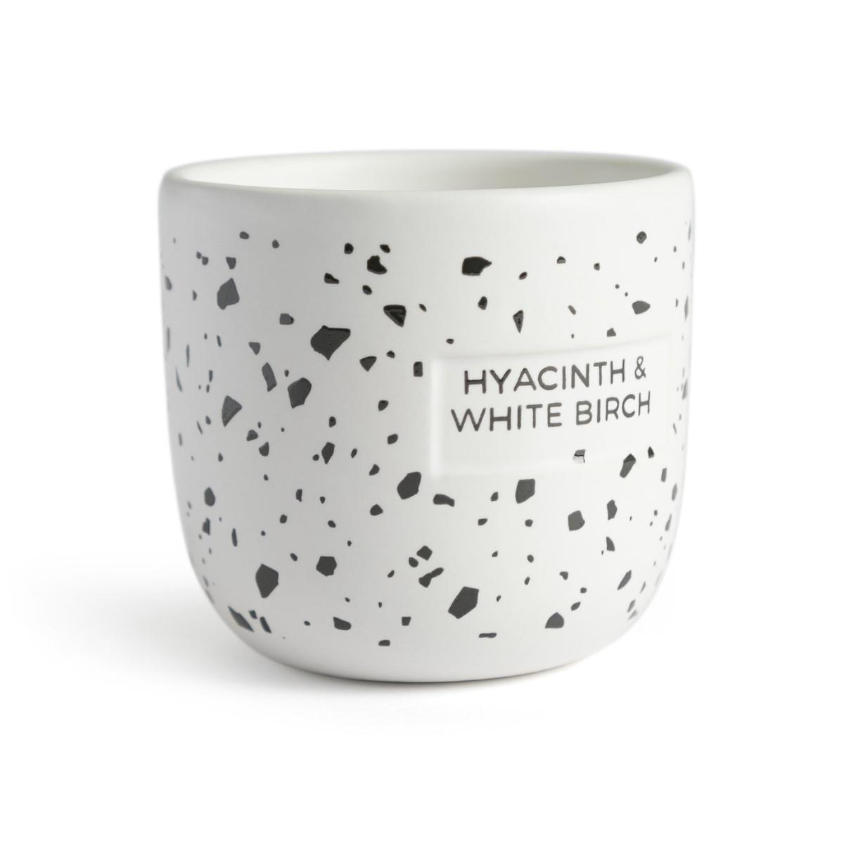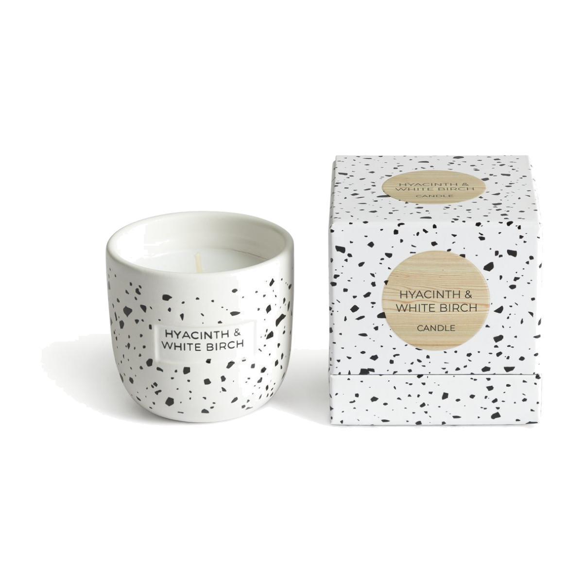 Wake up and smell the flowers. Our calming ceramic candle will refresh and infuse your home with its soothingly elegant scent. Fresh top notes of green apple, hyacinth and water lily blend beautifully with a smooth base of soft birchwood. Sitting pretty in a speckled black and white jar it's clean and contemporary. Place it on the mantle, coffee table or bedside table and relax in its soft, peaceful glow. With a burn time of 20 hours, it'll last. What a delight. This fragrant candle is beautifully packed in its own matching speckled box. An ideal gift, don't you think? Water Lily & White woods scent. Paraffin wax. Approximate burn time 20 hours. Size H7, W7, D7cm.