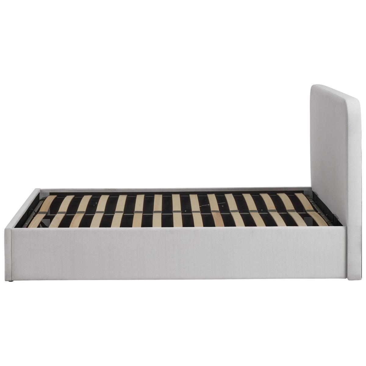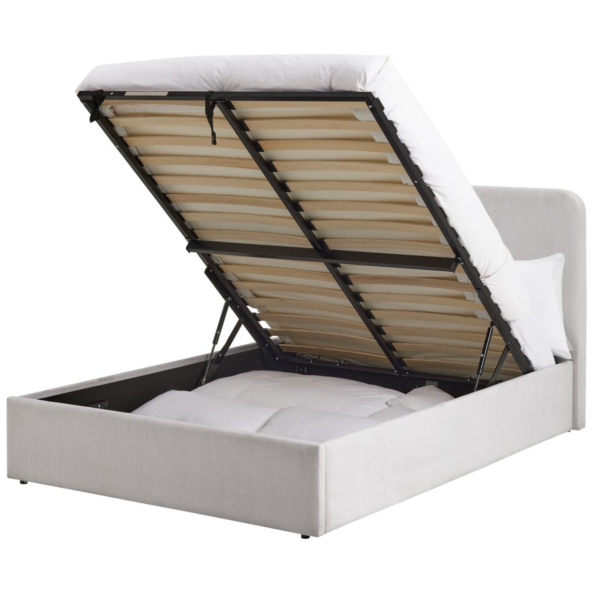 Sleep well, store well. With its smart padded headboard and linen-style upholstery this Chadwell ottoman bedframe offers relaxed and modern looks. Designed with an easy gas lift mechanism, it's easy to raise the end to reveal oodles of hidden storage. An absolute clutter buster for the bedroom. Sprung wooden slats provide comfortable mattress support and healthy ventilation. Part of the Chadwell collection. Headboard included. Upholstered frame. Linen look fabric - 100 % polyester. Plastic feet. Base with sprung wooden slats. End lift. Ottoman: end opening. Storage capacity: 720 litres. Size W164.5, L213.5, H106cm. Height to top of siderail 32.5cm. 1.5cm clearance between floor underside of bed. Internal storage space H21.5, W200.5, D153. Weight 58kg. Total maximum user weight 220kg. Packed flat - 2 people recommended. Headboard: Upholstered headboard. Headboard fixings included. Headboard size H106, W164.5, D9cm. Package Dimensions: Package 1 dimension H10.5, W168, D103cm. Package 1 weight: 37kg. Package 2 dimensions: H9, W206, D34.5cm. Package 2 weight: 21kg. General information: Manufacturer's 2 year guarantee. FSC certified meaning the materials used for this product are responsibly sourced.