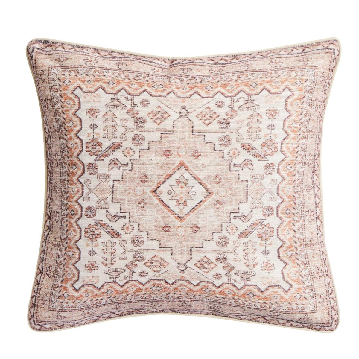 Vintage charm upgraded. The soft luxe chenille of this large cushion in a tapestry-style print is framed with sharp cream piping. It's plush enough to melt into after a long day and stylish enough to instantly refresh your sofa, armchair or bed. Go boho, but make it effortless. Cover 72% Polyester, 28% Cotton. Filling 100% Polyester,. Size L50, W50cm. This cover is sponge clean only.