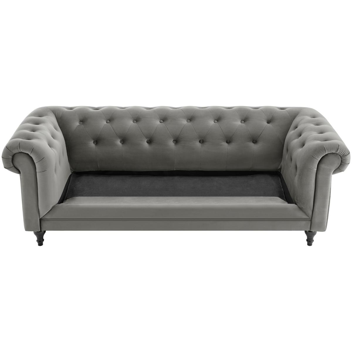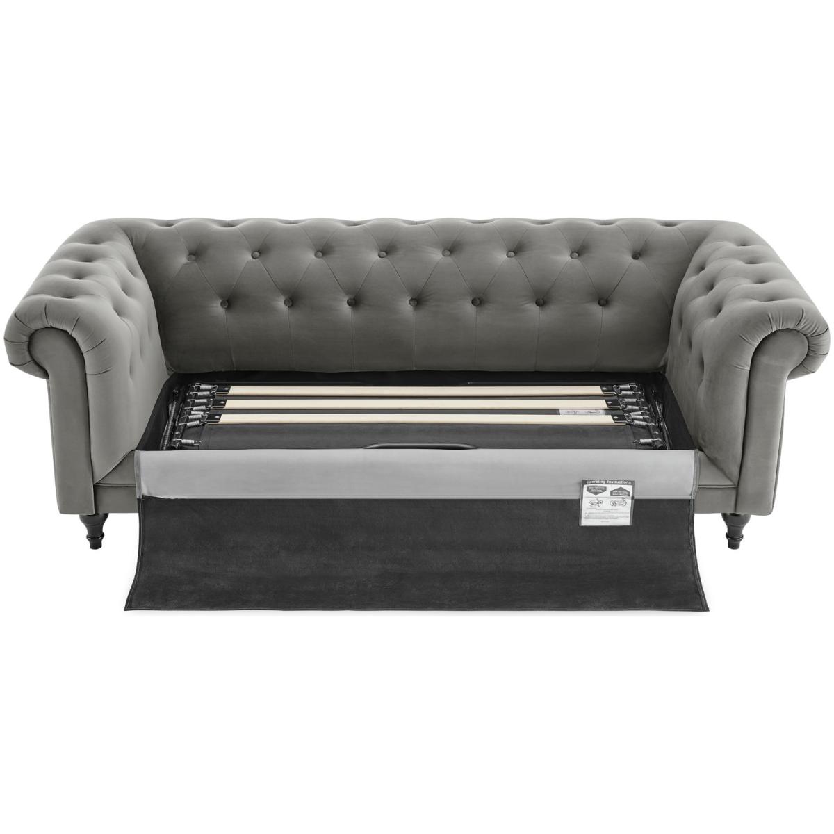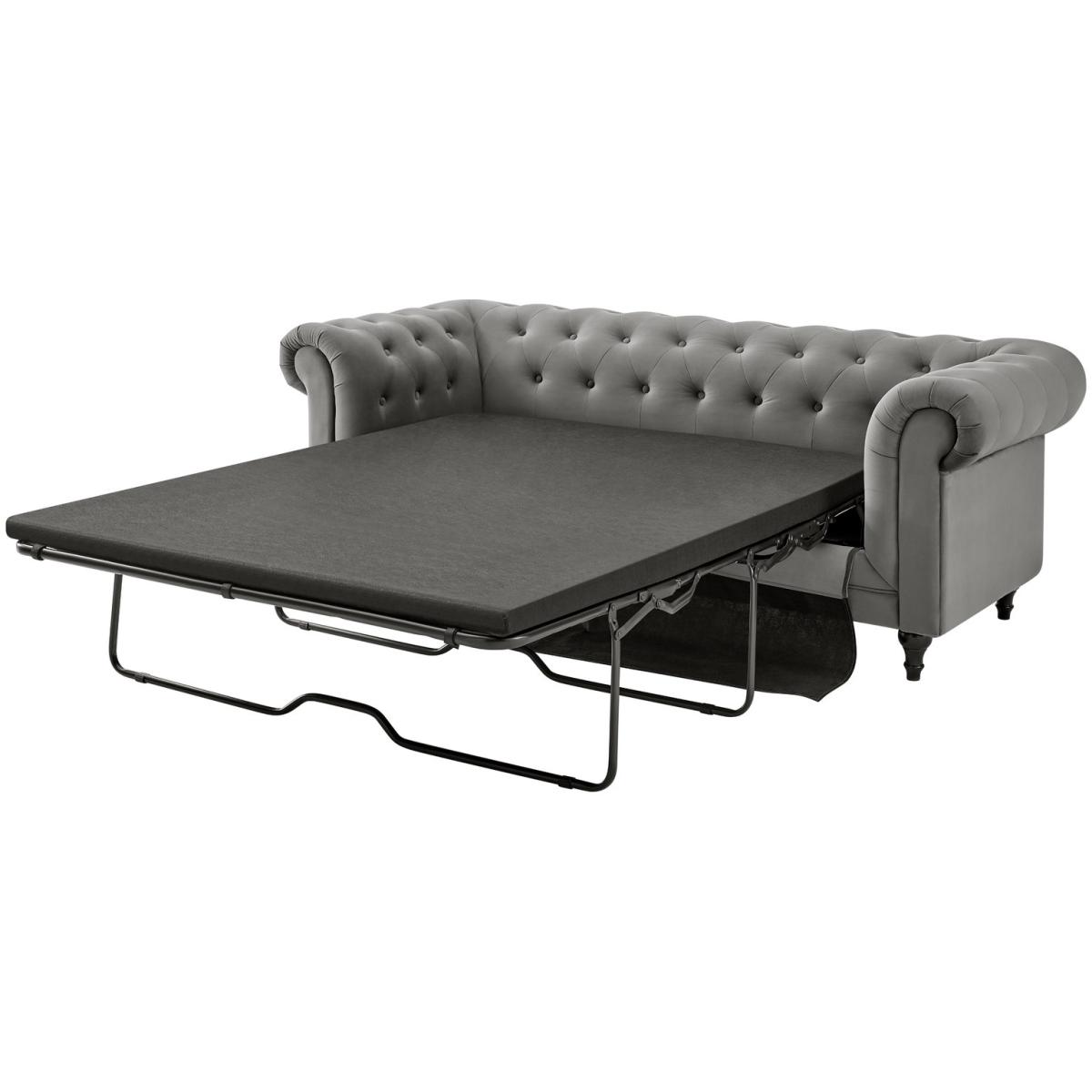 Here's an iconic design with a hidden secret. This luxe velvet Chesterfield sofa can be transformed into a pull-out sofa bed with mattress quickly and easily. Yet by day, you still have the sumptuous deep buttoning, scroll arms, plump pocket-sprung cushions and piping detail of a timelessly tasteful sofa. Spontaneous stayover anyone? Part of the Chesterfield collection. Metal action mechanism. Double bed. Material: Made from 100% polyester. Dark wood feet. Removable seats with pocket sprung foam filling. Fixed cushion(s) with foam filling. Free fabric swatch available on this line. Dimensions: Size H74.5, W218, D91.5cm (Depth as bed 178cm). Size of sleeping area W139, L178cm. Mattress depth: 5cm. Floor to seat height: 48cm. Depth of seat: 65cm. Height of seat back: 26.5cm. Width of seating area between arms: 153cm. Height of arm rest: 74cm. Weight: 64kg. Packaged dimensions: Package size H71, W9.5, D219cm. General information: FSC certified meaning the materials used for this product are responsibly sourced. Dust or wipe with a damp cloth only. Suitable for occasional use. Minimal assembly - just add feet. Maximum individual user weight 110kg. Manufacturer's 1 year guarantee.