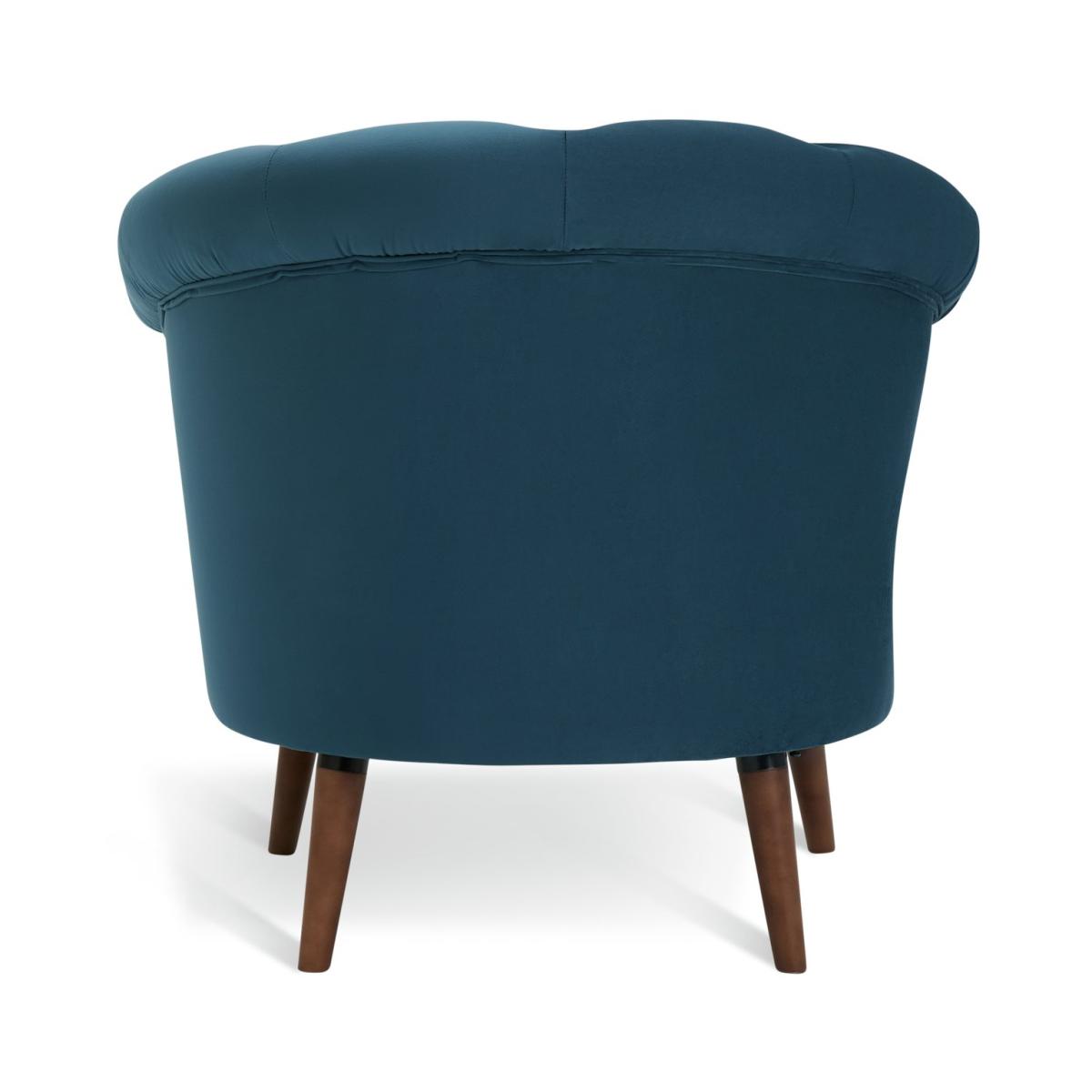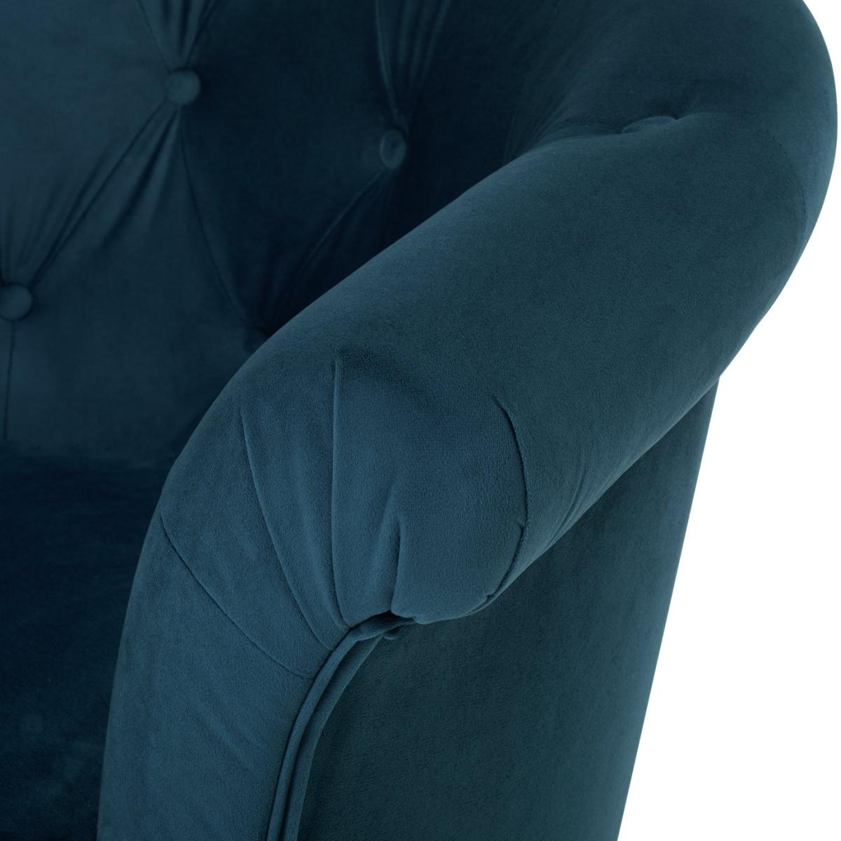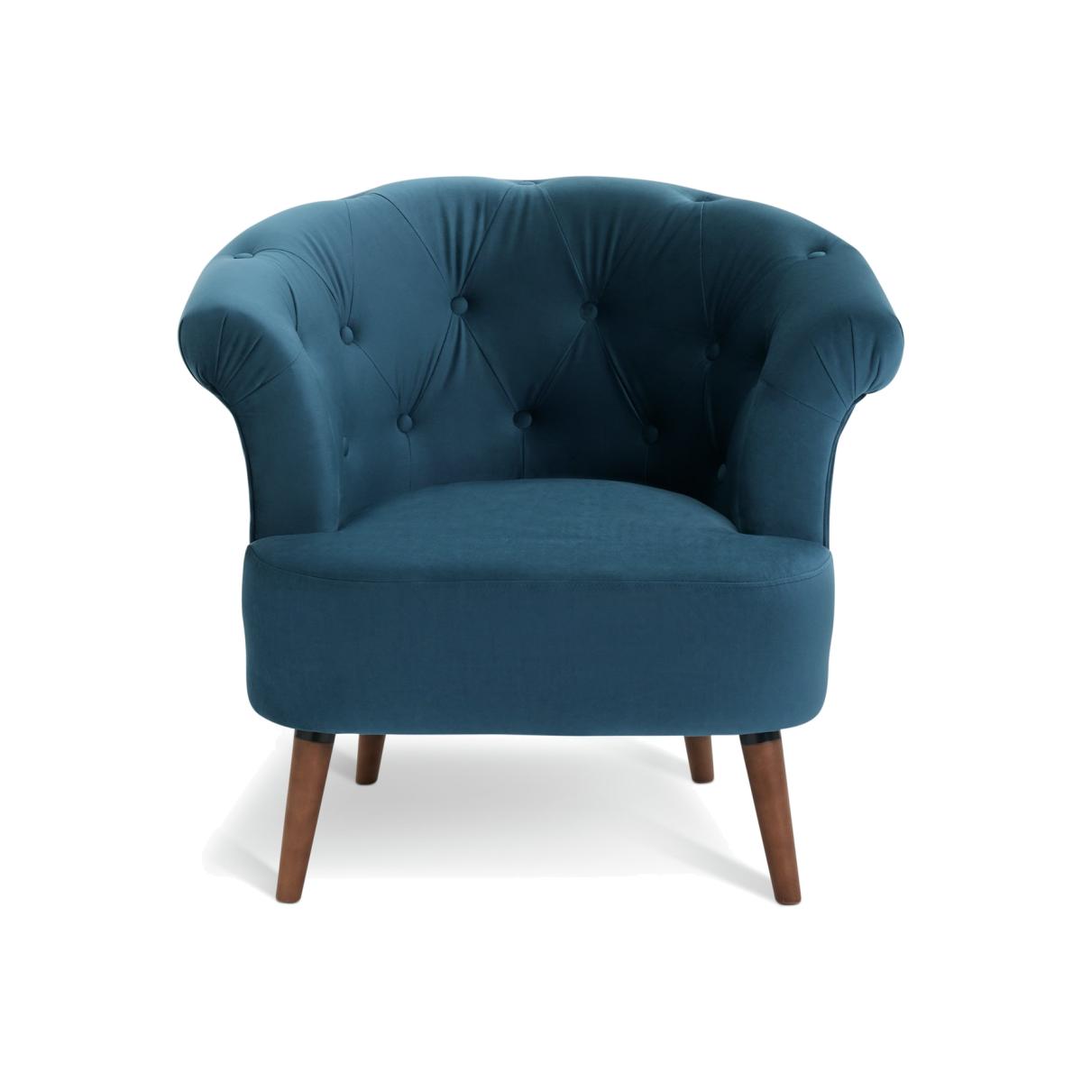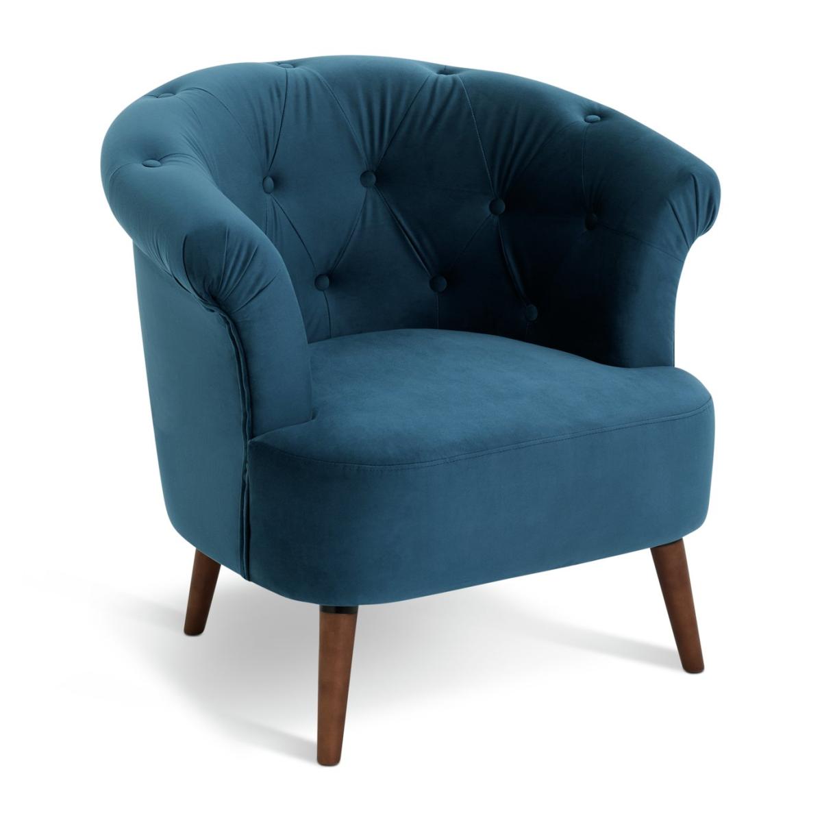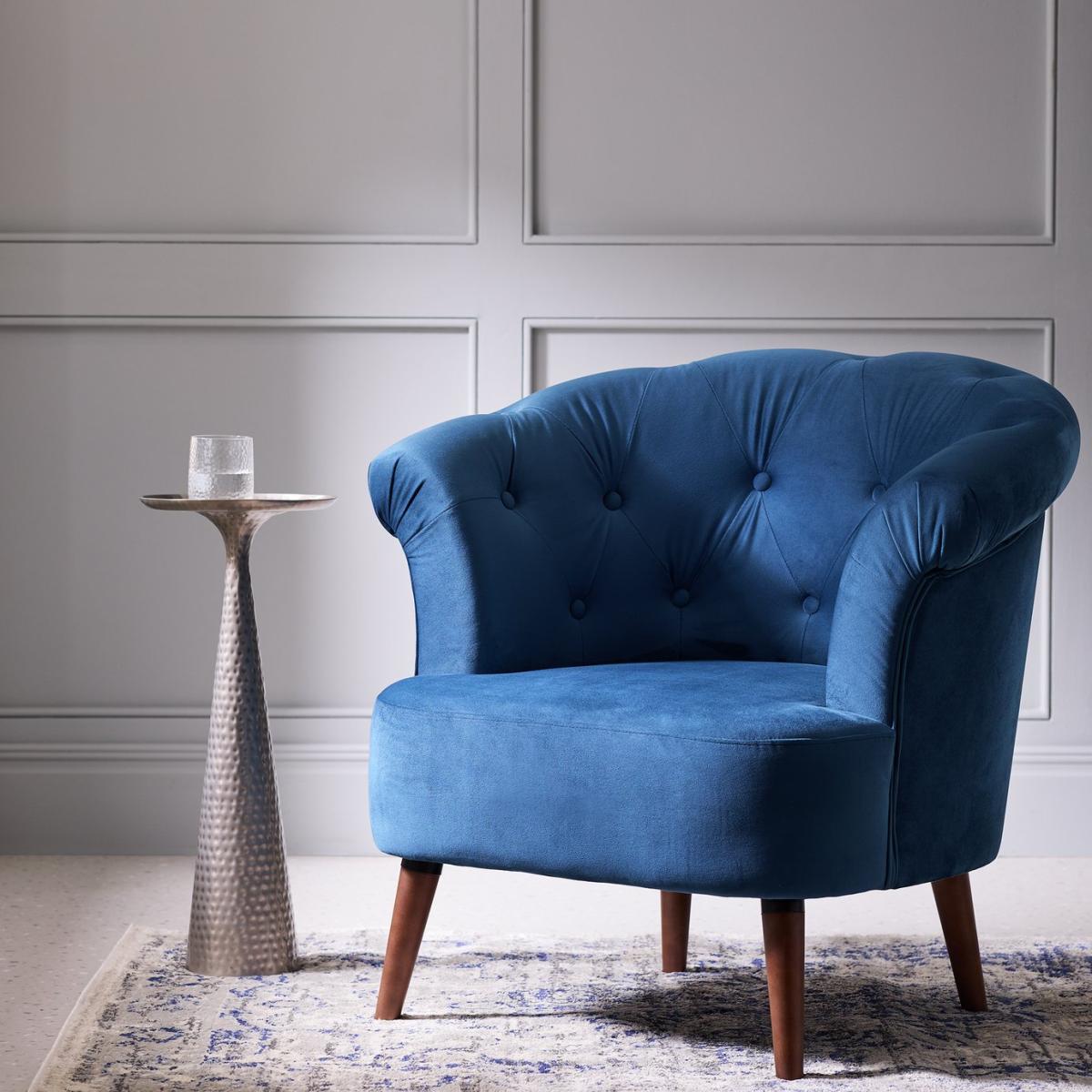 Looking for an accent chair as a visual treat? Here it is. A rich navy velvet seat that transports much-loved Chesterfield characteristics into a modern style. Still rolled and buttoned but with a fanned open shape that elevates its refreshingly desirable design. While walnut stained legs add the warmth of wood to this luxe treat of a chair. Part of the Chesterfield collection. Material: Made from 100% polyester. Wooden feet. Fixed seat with foam fibre wrap filling. Free fabric swatch available on this line. Dimensions: Size H72, W85, D78cm. Floor to seat height: 43cm. Depth of seat: 56cm. Height of seat back: 29cm. Width of seating area between arms: 85cm. Height of arm rest: 70cm. Weight: 16.6kg. Packaged dimensions: Package size H61, W91.5, D78cm. General information: FSC certified meaning the materials used for this product are responsibly sourced. Professional clean only. Plump cushions regularly to maintain shape. Self-assembly - just add feet. Maximum individual user weight 120kg. Manufacturer's 2 year guarantee.