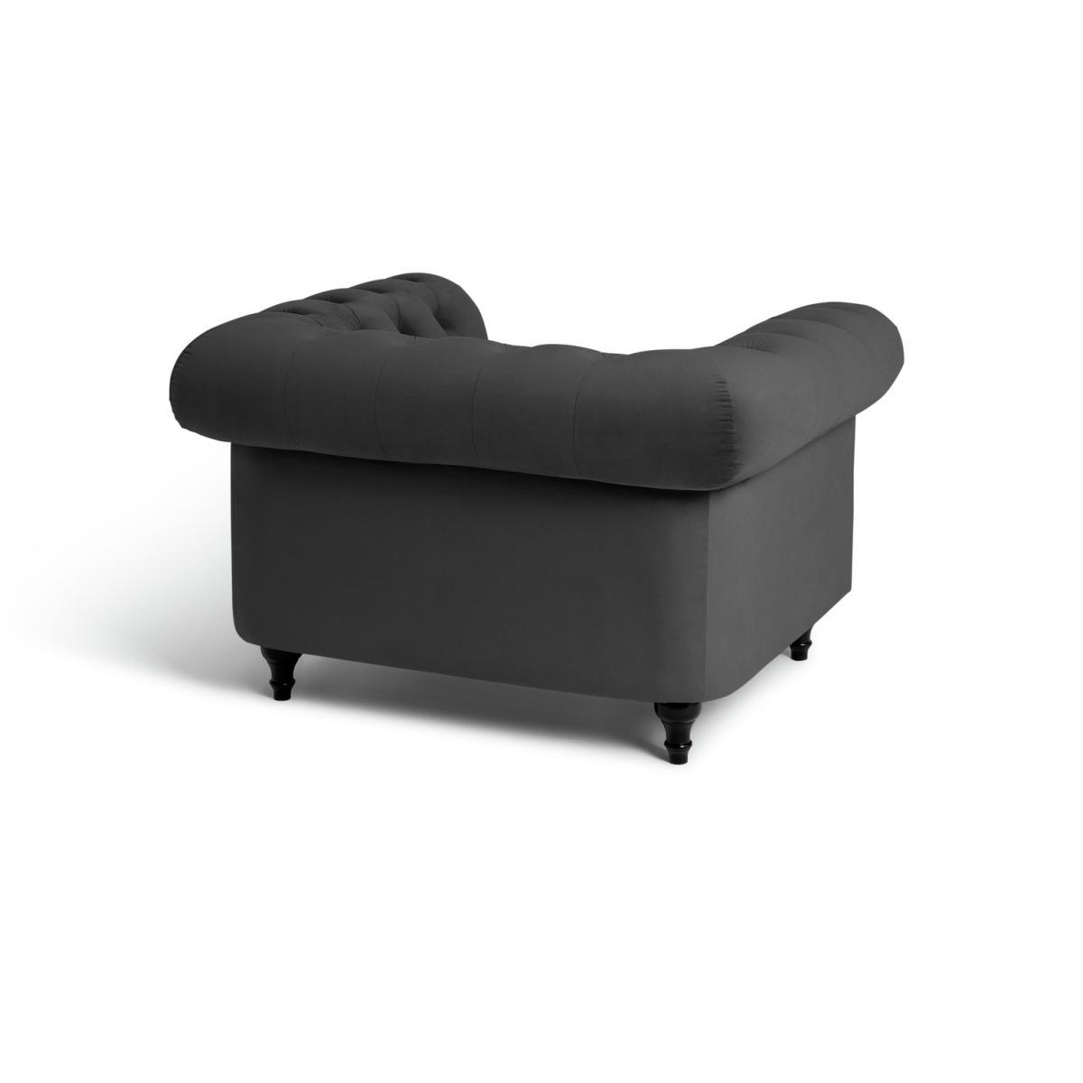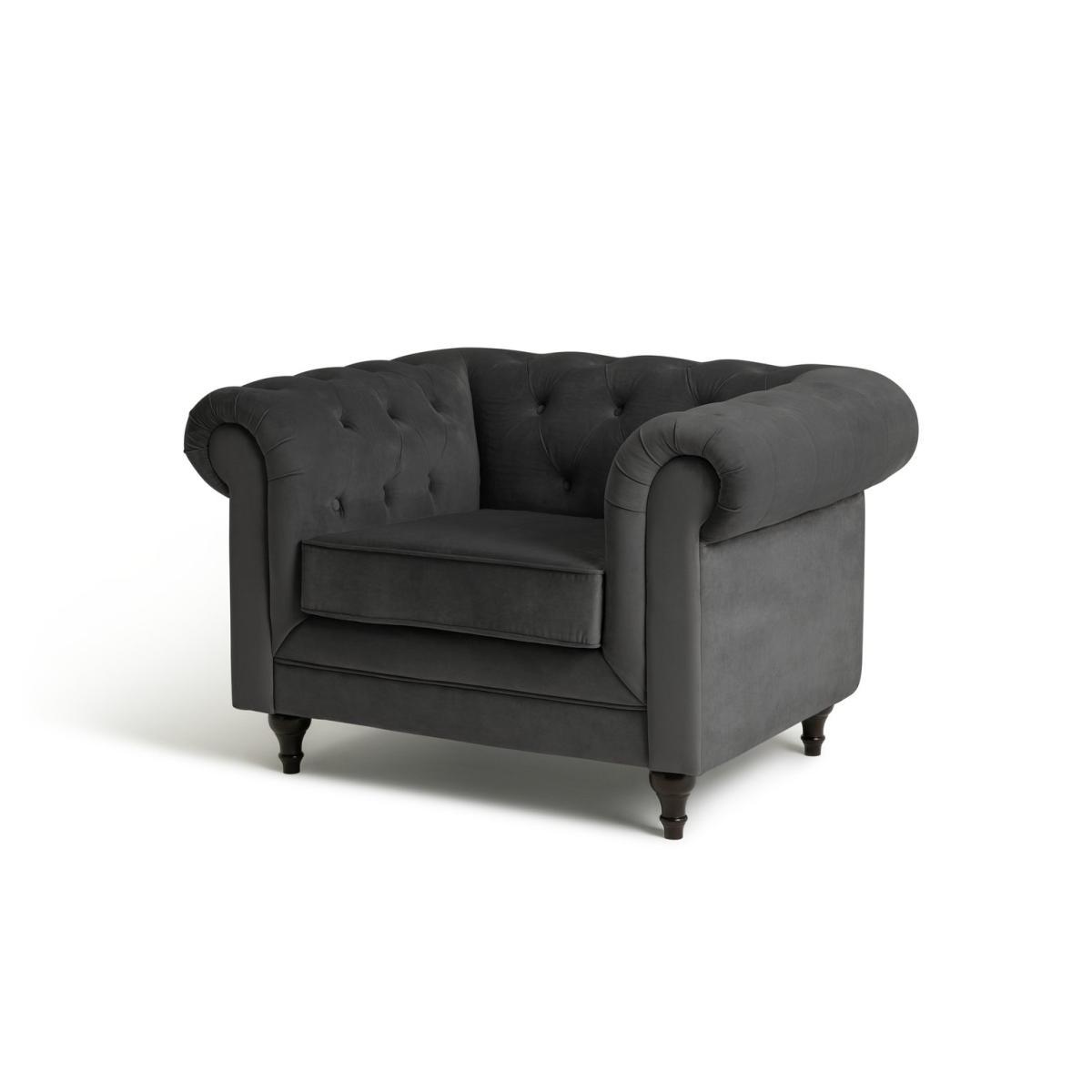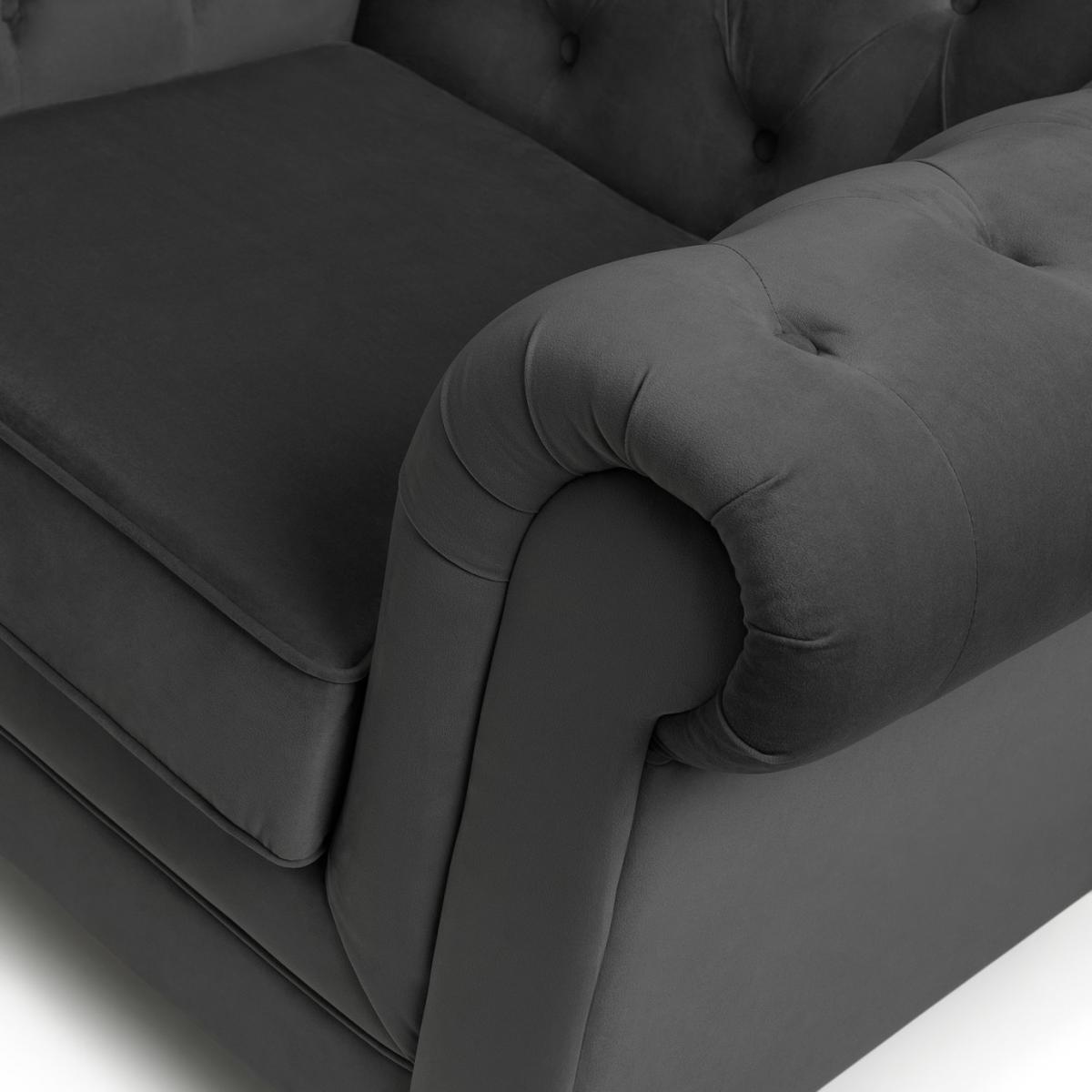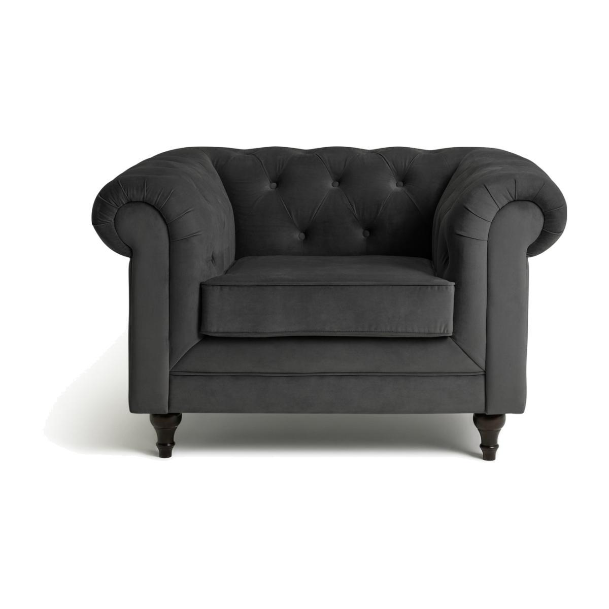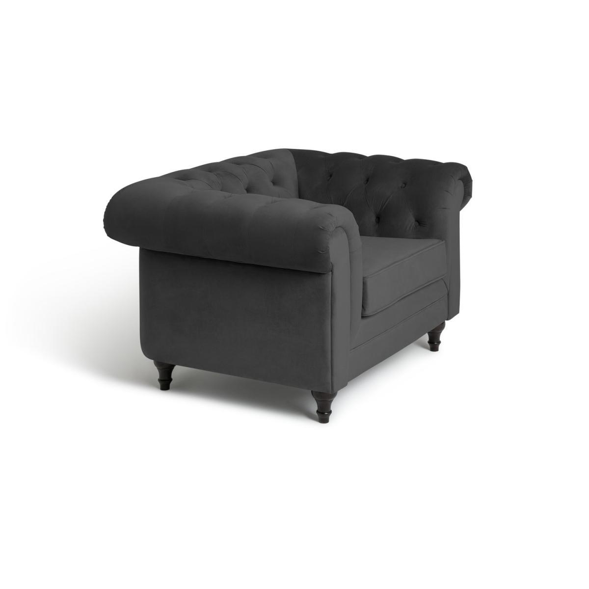 Our classic Chesterfield armchair is so incredibly inviting you'll want to stop and sit. Upholstered in rich velvet, this smart, charcoal charmer is everything an accent chair should be. Eye-catching, welcoming and full of character. Pleated padded arms and traditional button-back bring wrap-around luxury, while the deep seat cushion offers instant lounge appeal. Style with a soft throw and get down to some serious loafing.