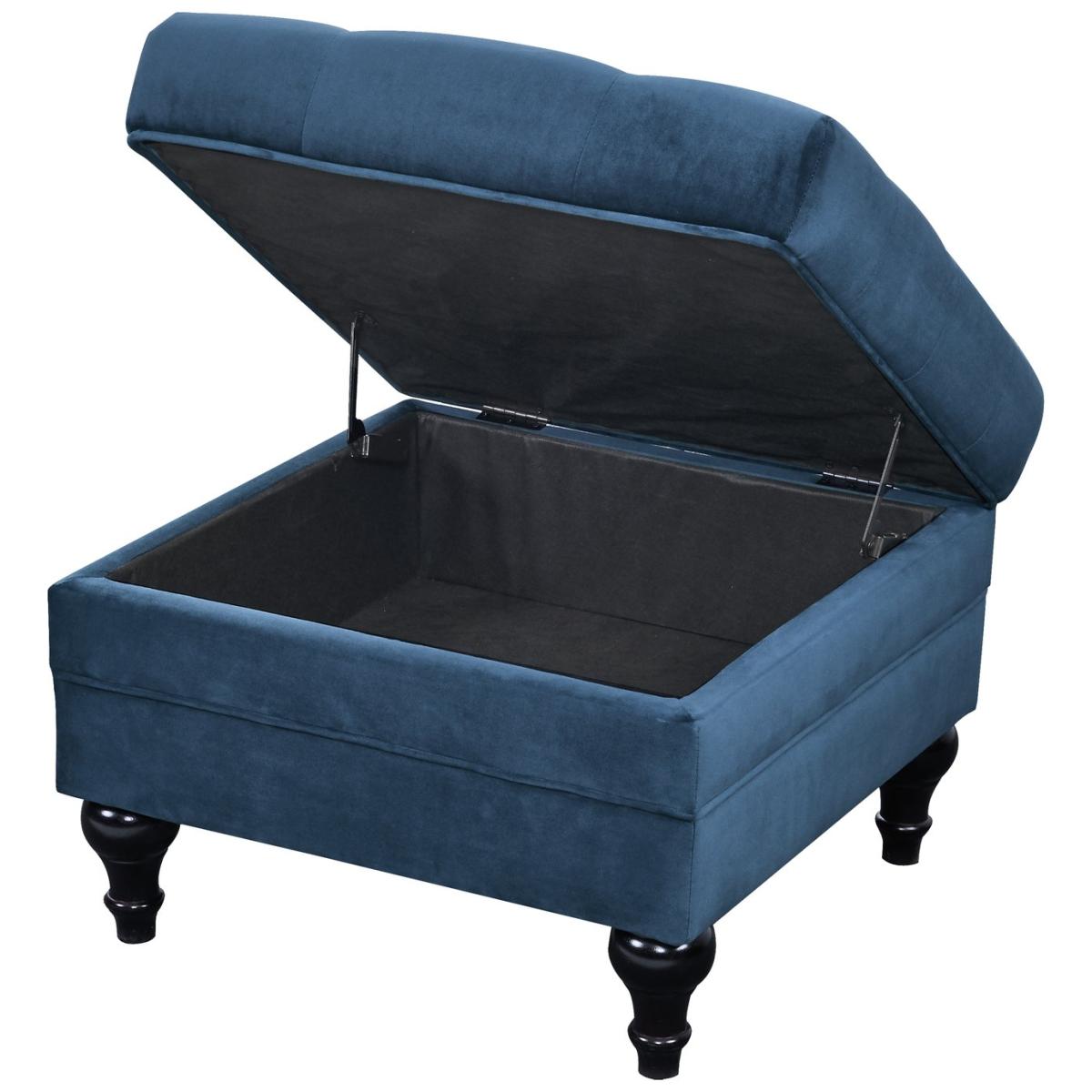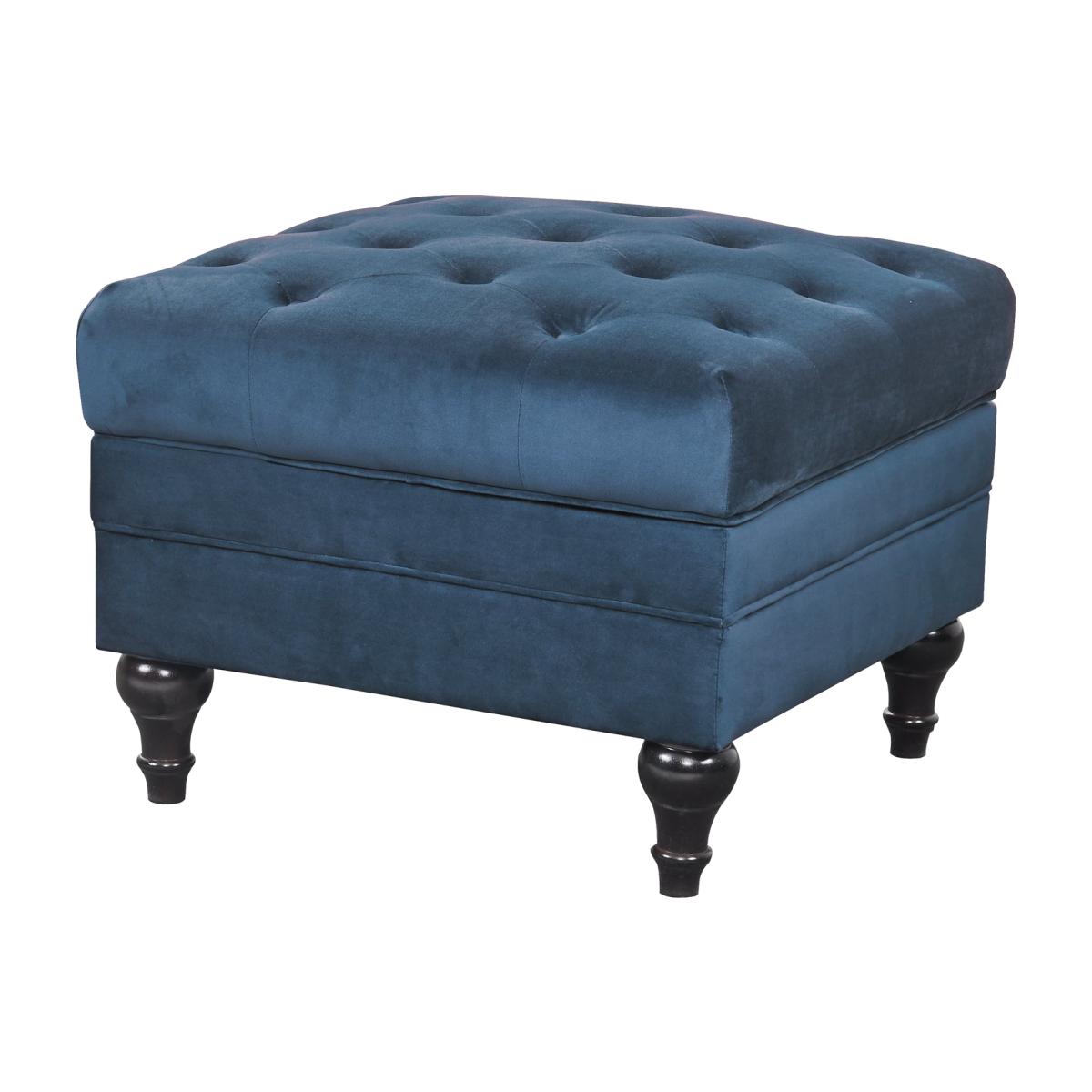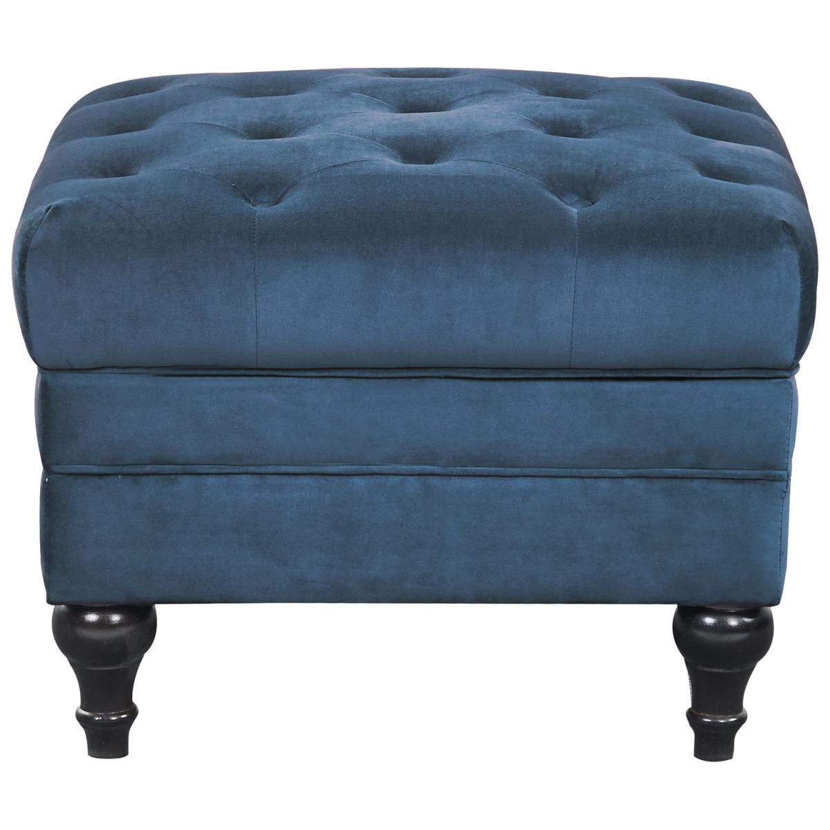 Put your feet up and unwind with this iconic ottoman. Spot those classic Chesterfield details like the deep button tufting and shapely turned wooden legs. The piped edges and rich blue velvet upholstery add to its luxurious style. And with clever concealed storage it's the perfect addition to your lounge or bedroom. Prepare to relax.