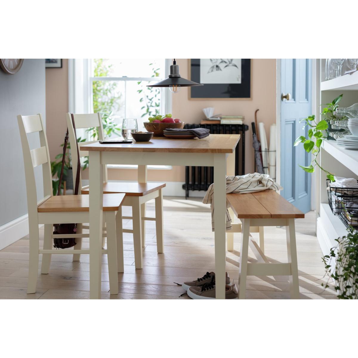 This dining set offers a clean, versatile look that works well in both contemporary and rustic interiors. I love how the mix of natural wood tones with the white finish keeps it light and adaptable, making it easy to style with various colour palettes and accessories. It’s practical for smaller spaces and can be dressed up with a runner, colourful placemats, or modern tableware for a more polished look. The bench and chairs provide a relaxed, family-friendly setup, perfect for casual dining or entertaining guests. For styling tips, consider pairing it with understated lighting and simple tableware - adding a few houseplants or statement centrepieces can elevate the space without overpowering its approachable charm.