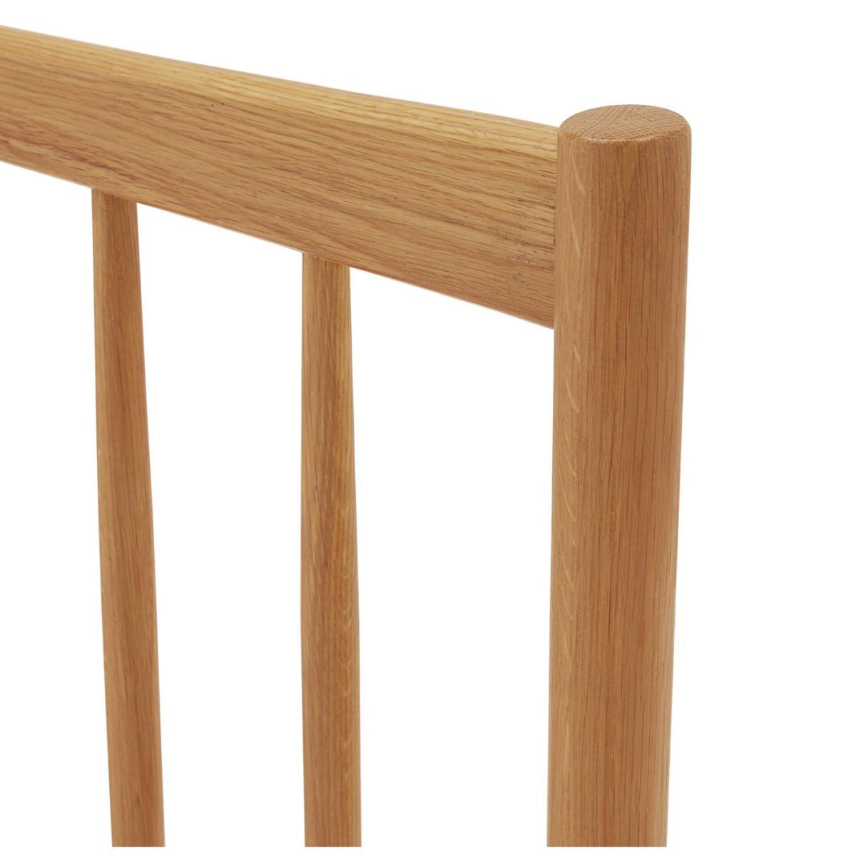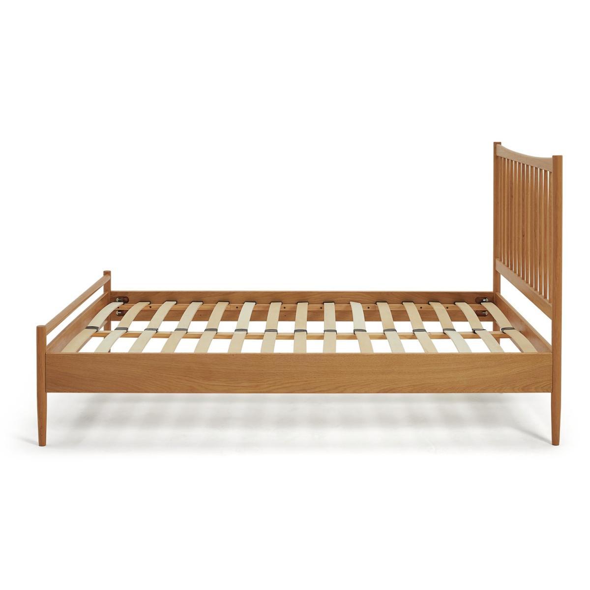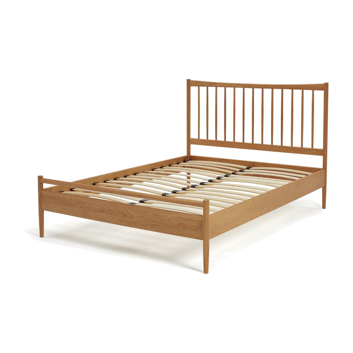 Crafted in solid wood with a stunning oak veneer, this is a double bedframe to lie for. Spot the hallmarks of iconic British design that also combine perfectly with the form and function of popular Scandi design. The finesse of a strong but elegant headboard structured from wood turned spindles and a carved top bar. Full length legs integral to the frame for extra strength. Sprung wooden slats with reinforced central posts for mattress support and ventilation. Need we go on?