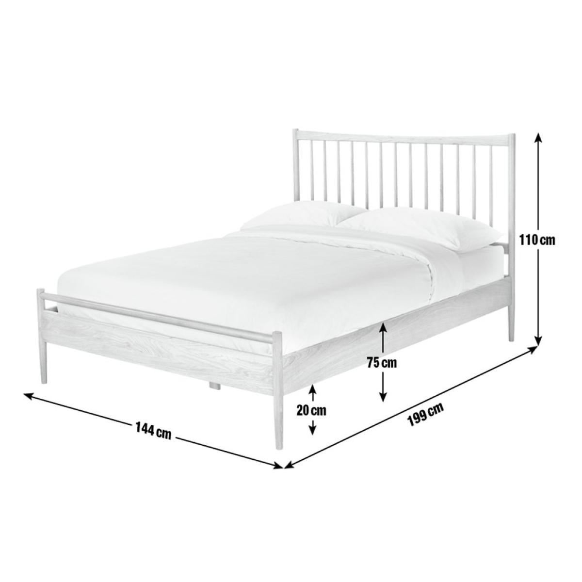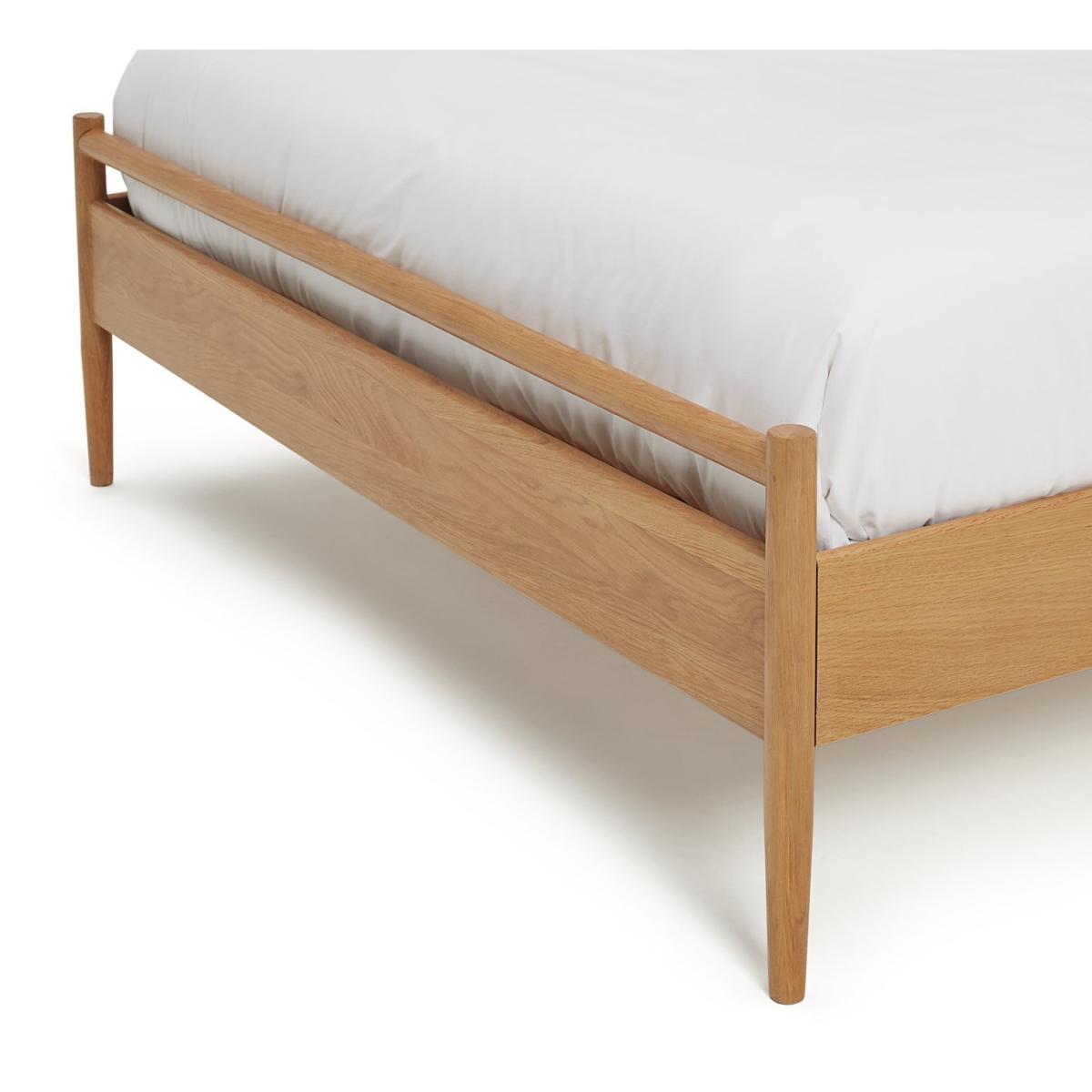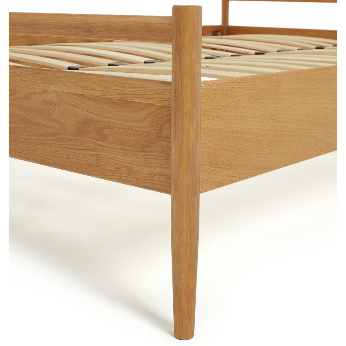 Crafted in solid wood with a stunning oak veneer, this is a double bedframe to lie for. Spot the hallmarks of iconic British design that also combine perfectly with the form and function of popular Scandi design. The finesse of a strong but elegant headboard structured from wood turned spindles and a carved top bar. Full length legs integral to the frame for extra strength. Sprung wooden slats with reinforced central posts for mattress support and ventilation. Need we go on?