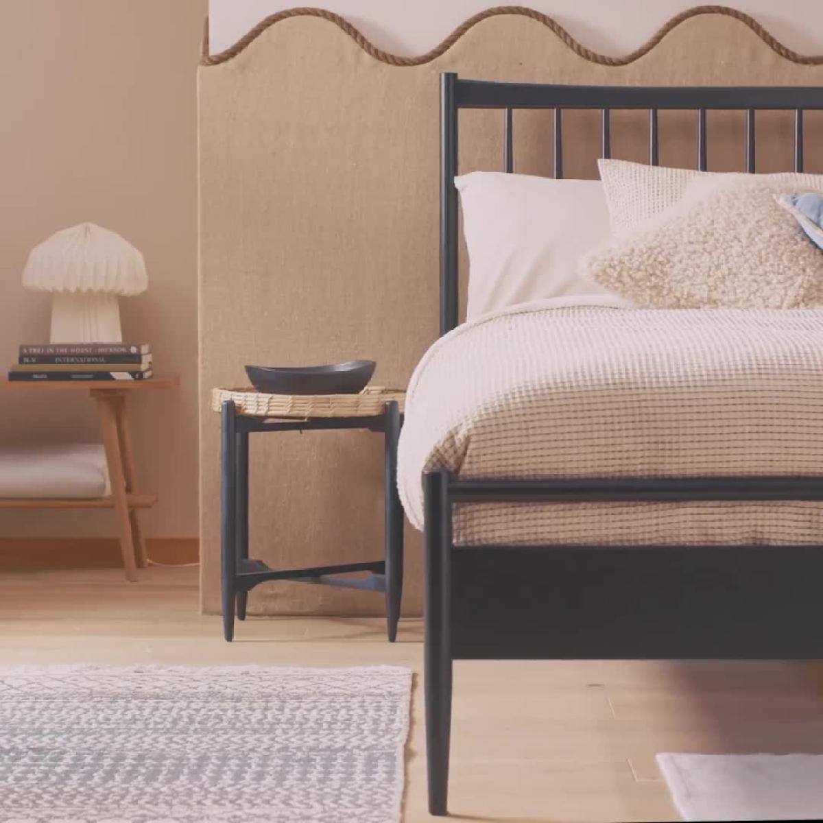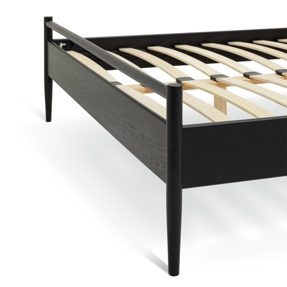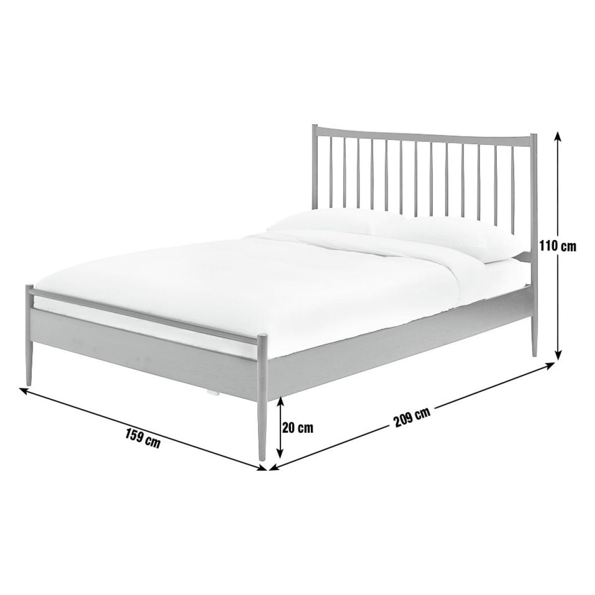 Inspired by modern Scandinavian design, our bedframe is crafted from solid wood with a beautiful black stained finish. We love the simplicity of the headboard, made from wood-turned spindles and the carved top and bottom bar, which are elegant but strong. Elevated from the floor, you even have room for a little underbed storage. This solidly constructed base has sprung wooden slats for mattress aeration, support and comfort. Part of the Chiltern collection. Wooden frame. Base with wooden slats. No storage. Size W159, L209, H110cm. Height to top of siderail 35cm. 20cm clearance between floor and underside of bed. Weight 36kg. Self-assembly - 2 people recommended. Package Dimensions: Package 1 dimensions: H11, W151, D117.5cm. Package 1 weight: 22kg. Package 2 dimensions: H10, W200, D27.5cm. Package 2 weight: 11.5kg. General Information: We are excited to be welcoming some of our favourite HOME products into the Habitat range. Your product may arrive in Habitat or HOME packaging. Manufacturer's 1 year guarantee. FSC certified meaning the materials used for this product are responsibly sourced.