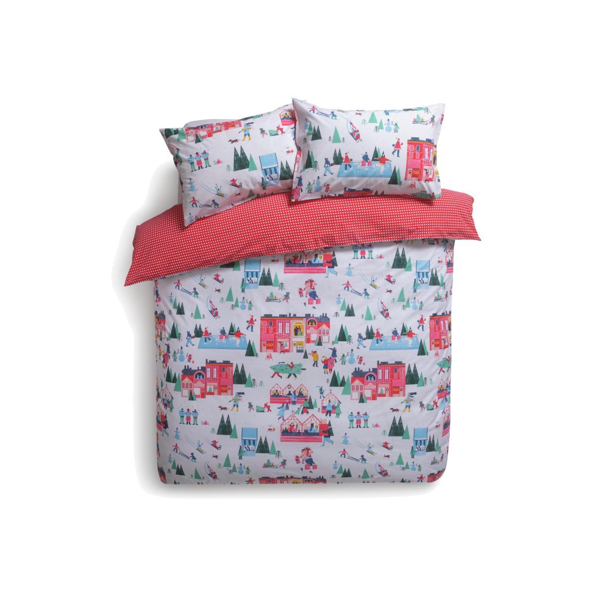 Dreaming of the big day? Our reversible king size duvet bed set makes the build-up to Christmas even more exciting. Slip in among the carol singers, shoppers and sledgers, all eagerly awaiting Santa's arrival. And when Christmas is over, flip it over for pretty polka dots in red and white. Made from clever polycotton, it's durable and a dream to clean too. Let the countdown begin. Set includes 1 duvet cover and 2 pillowcases. 144 thread count. Gentle wash at 40 C. Suitable for tumble drying. 52% Polyester, 48% Cotton percale. Reversible. Buttons for fastening.