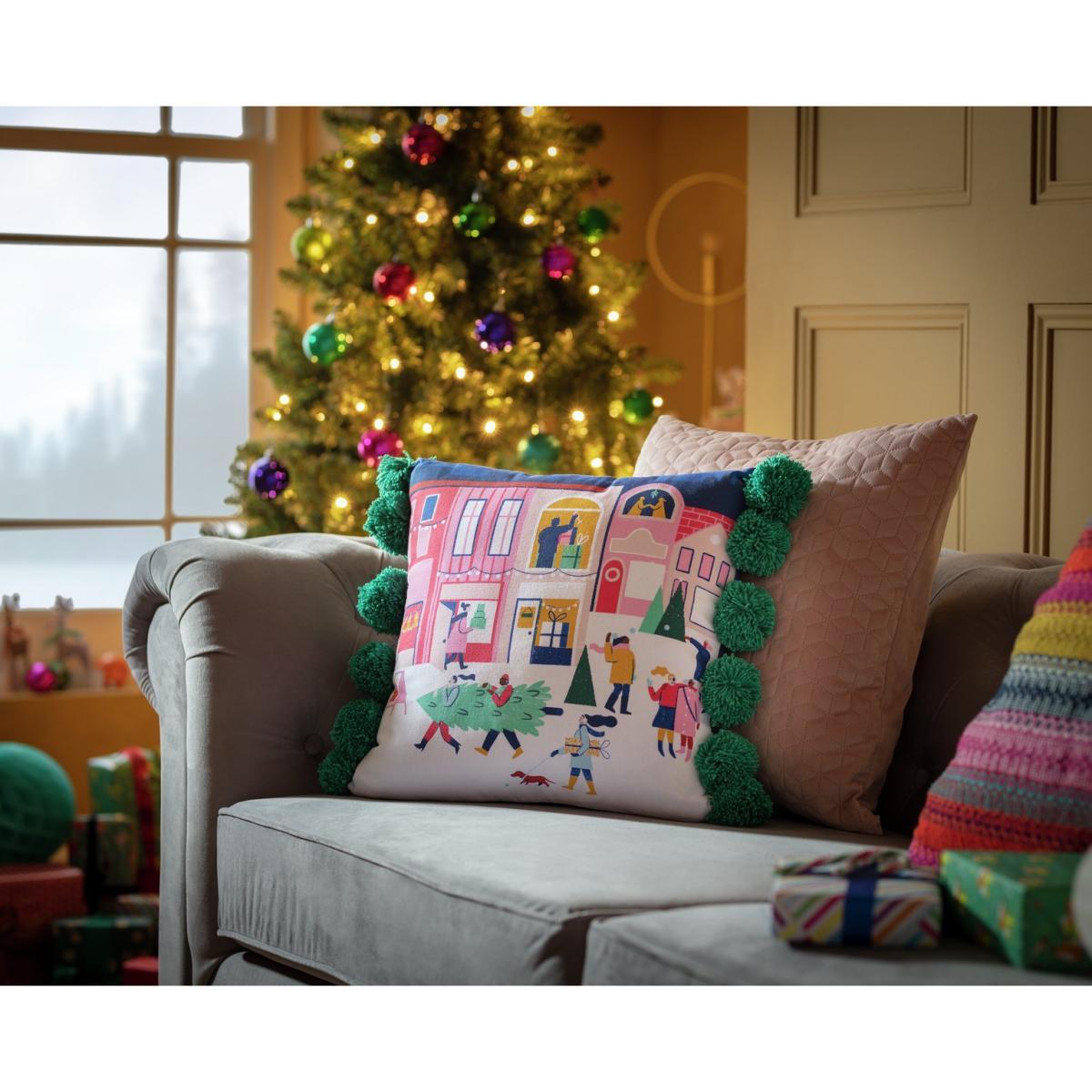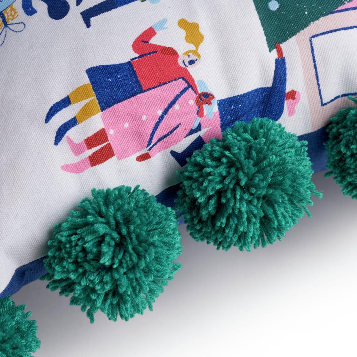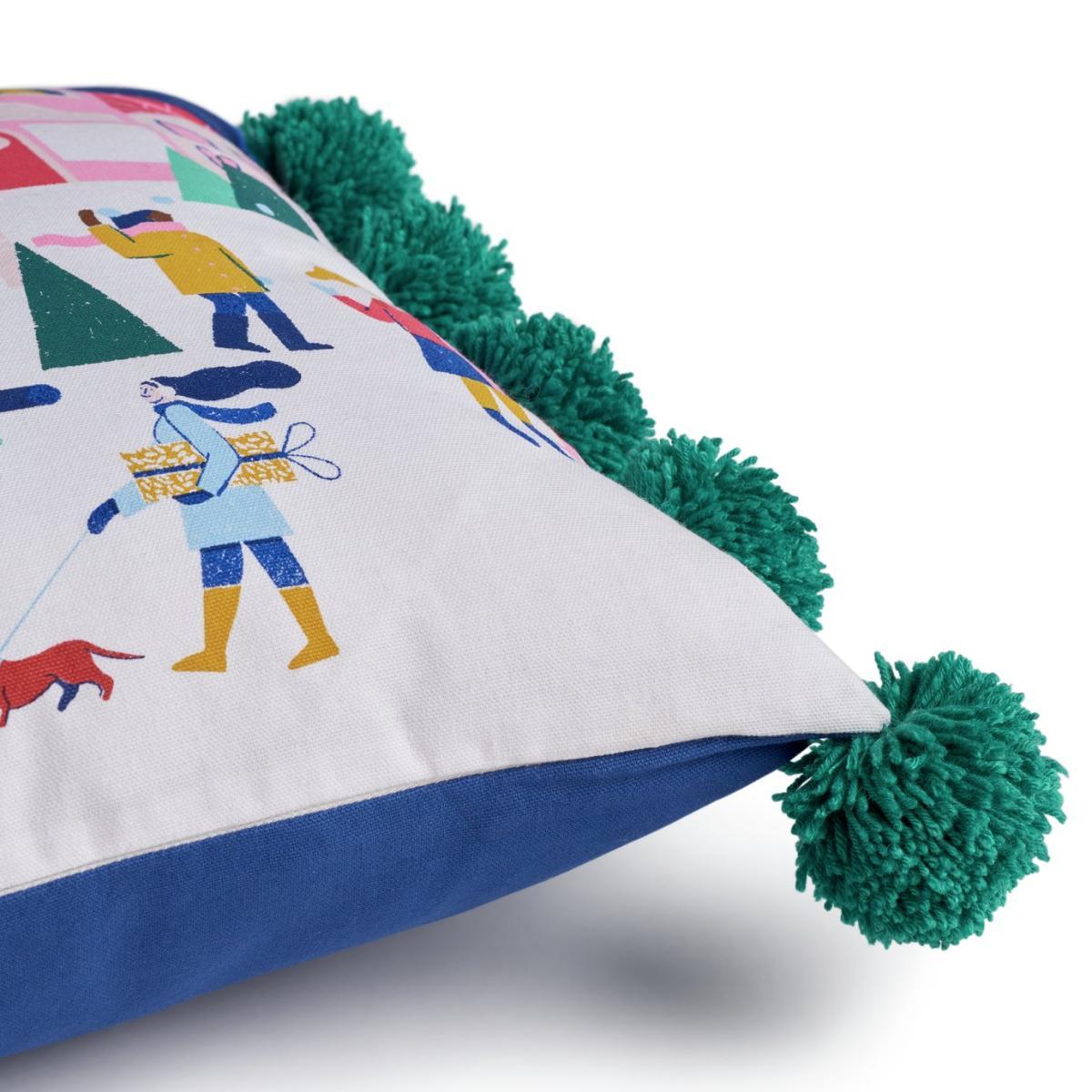 Pompoms and parties. That's what Christmas is about. Our festive cushion captures all the merriness of the season. With colourful illustrations of people shopping for presents and collecting their tree for the big day. The 12 jolly pompoms add a playful touch. Made from 100% cotton, it's super soft. And with 100% recycled polyester filling, you know you're being kind to the planet. Easy to keep good as new. Unzip the cover and pop it in the wash. Pass the mince pies. Channel your Christmas spirit with our collection of seasonal soft furnishings. Zip fastening. Cover 100% Polyester. Filling 100% Polyester. Size L43, W43cm. This cover is machine washable.