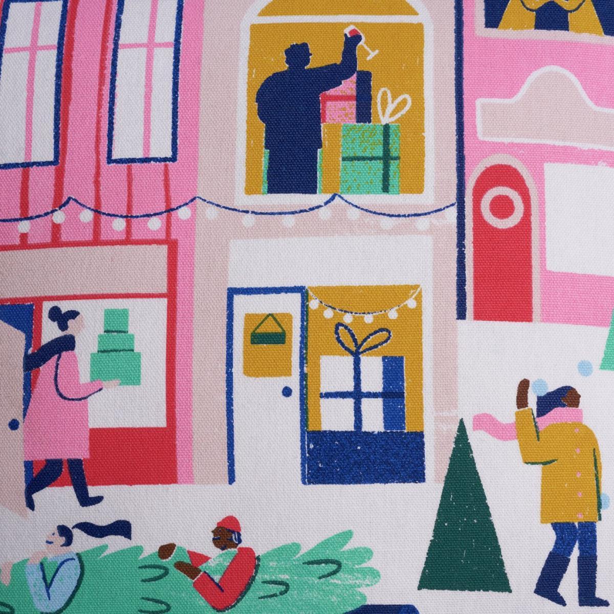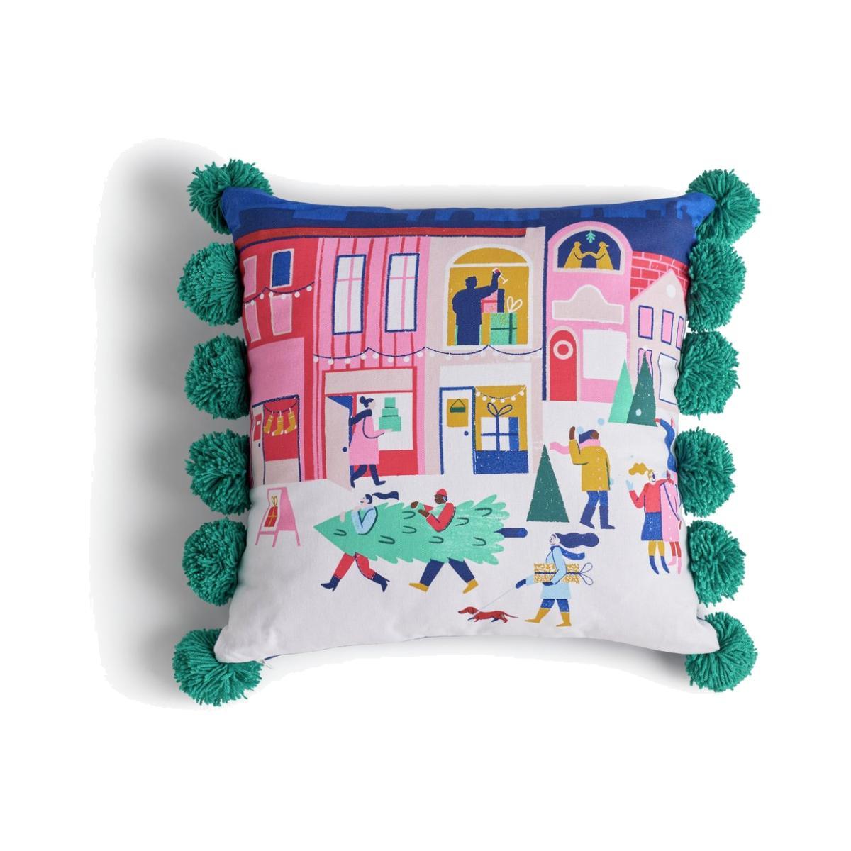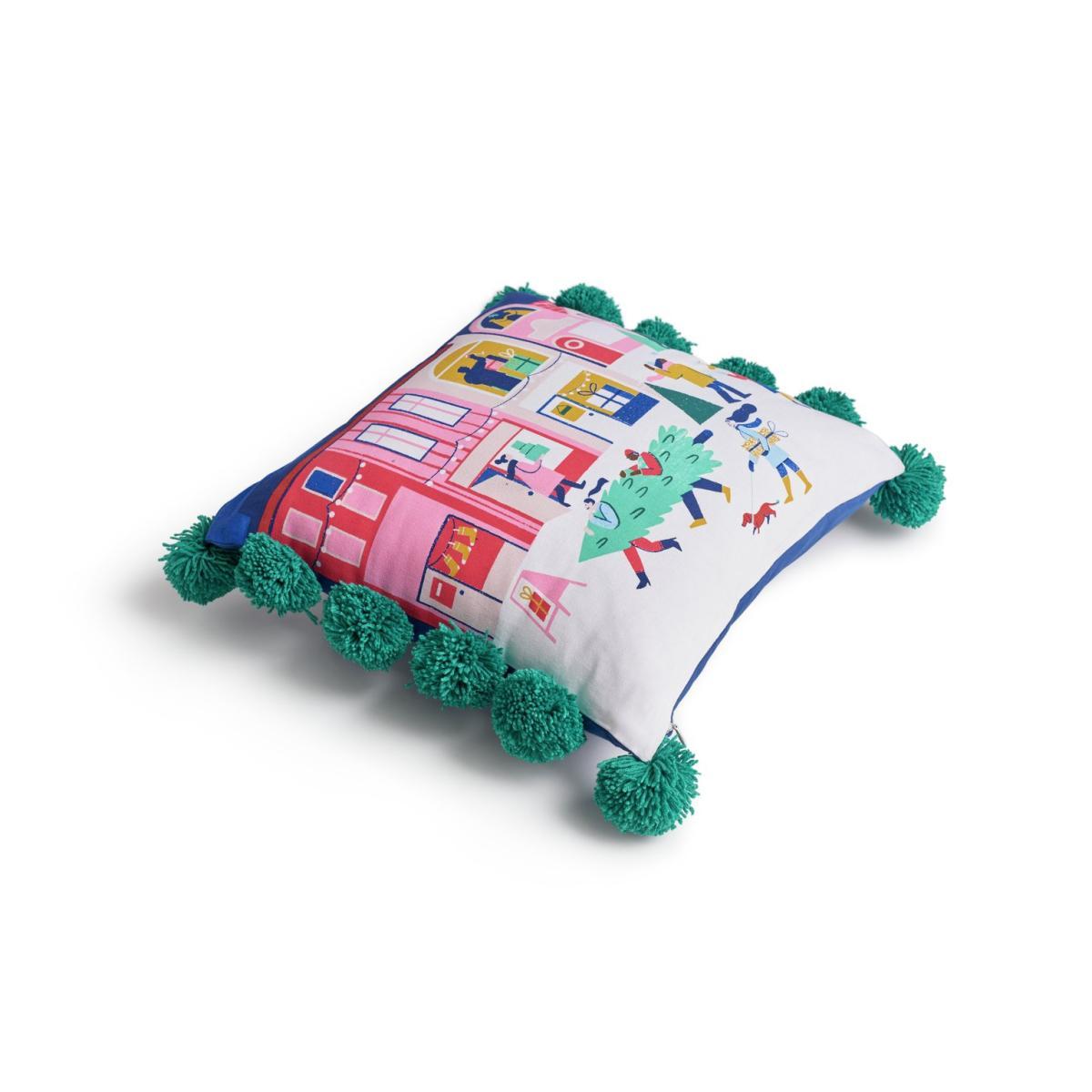 Pompoms and parties. That's what Christmas is about. Our festive cushion captures all the merriness of the season. With colourful illustrations of people shopping for presents and collecting their tree for the big day. The 12 jolly pompoms add a playful touch. Made from 100% cotton, it's super soft. And with 100% recycled polyester filling, you know you're being kind to the planet. Easy to keep good as new. Unzip the cover and pop it in the wash. Pass the mince pies. Channel your Christmas spirit with our collection of seasonal soft furnishings. Zip fastening. Cover 100% Polyester. Filling 100% Polyester. Size L43, W43cm. This cover is machine washable.