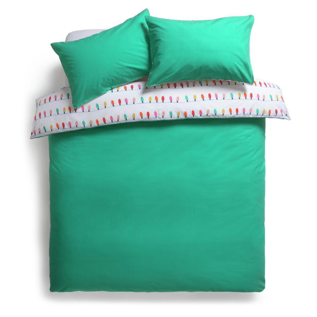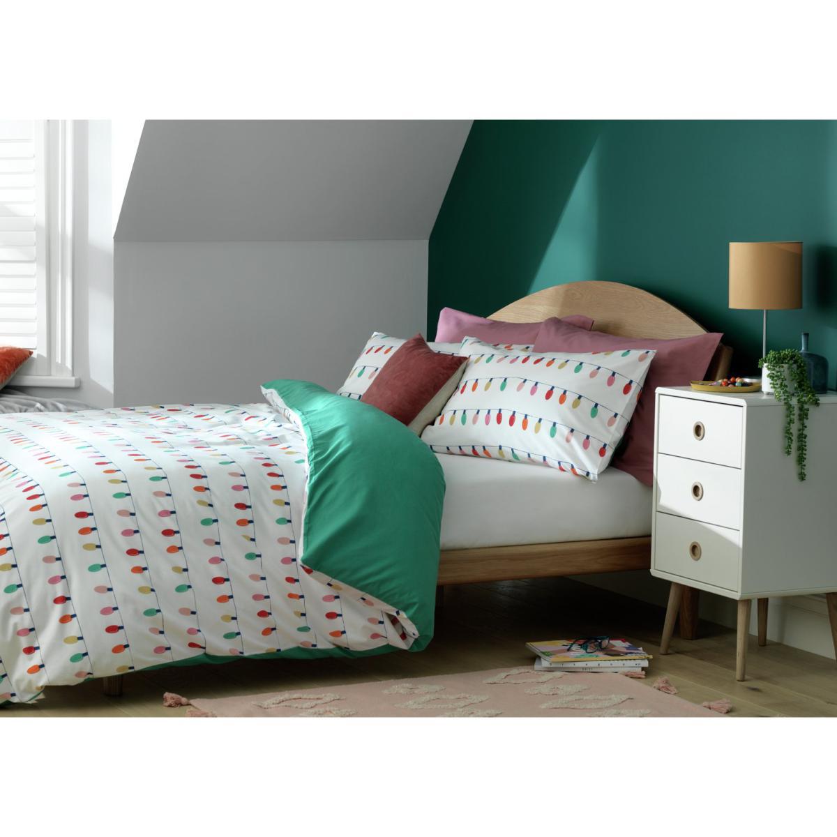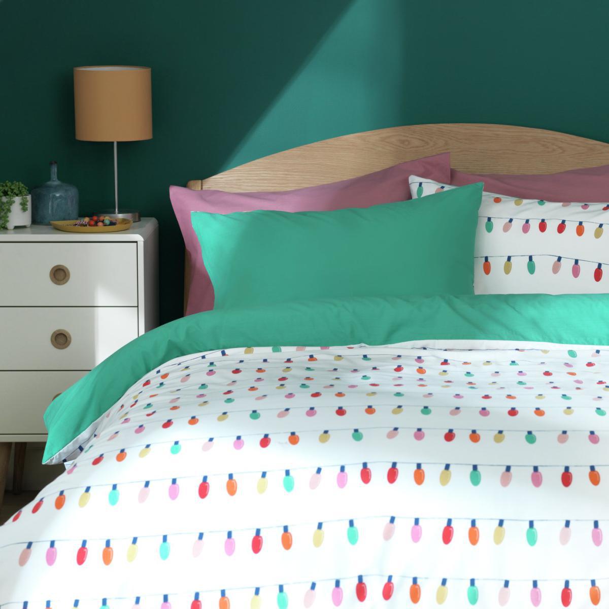 Treat your sheets to dash of Christmas spirit. Our reversible duvet and pillowcases light up the room. Snuggle in while you wait for Santa. When the festive season is over, flip for a change in bright jade green. With a soft feel, this comfy set will have you snoozing soundly in no time. Made from clever polycotton, they're durable and a dream to clean too. How many sleeps left?
